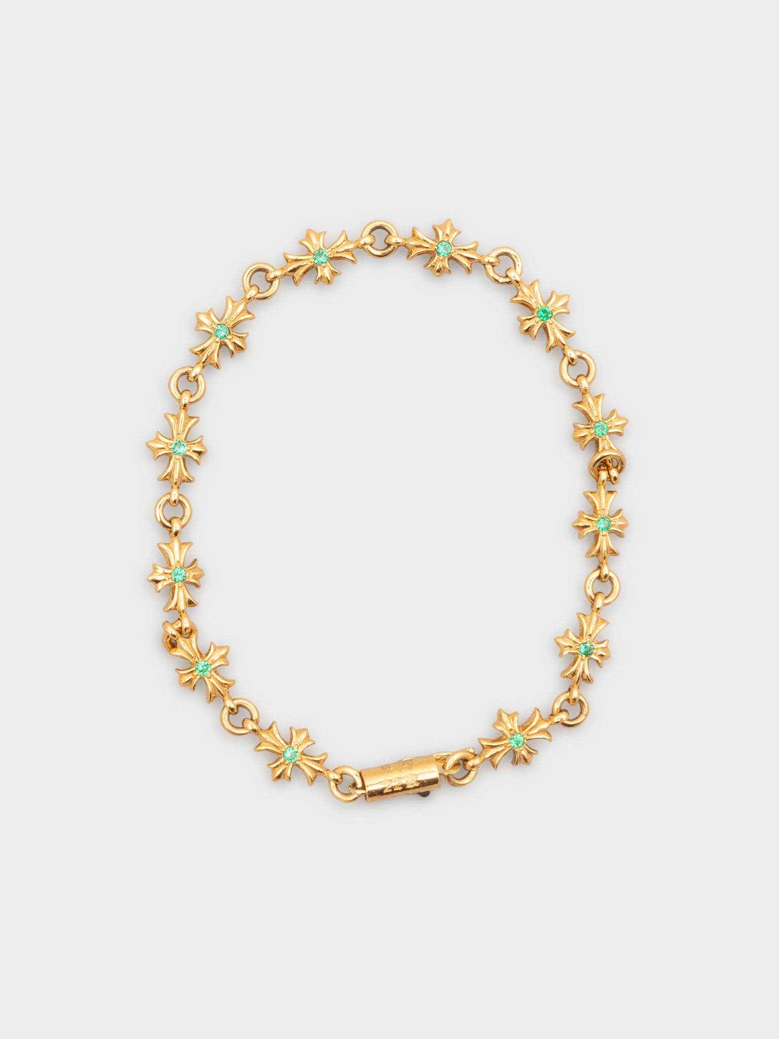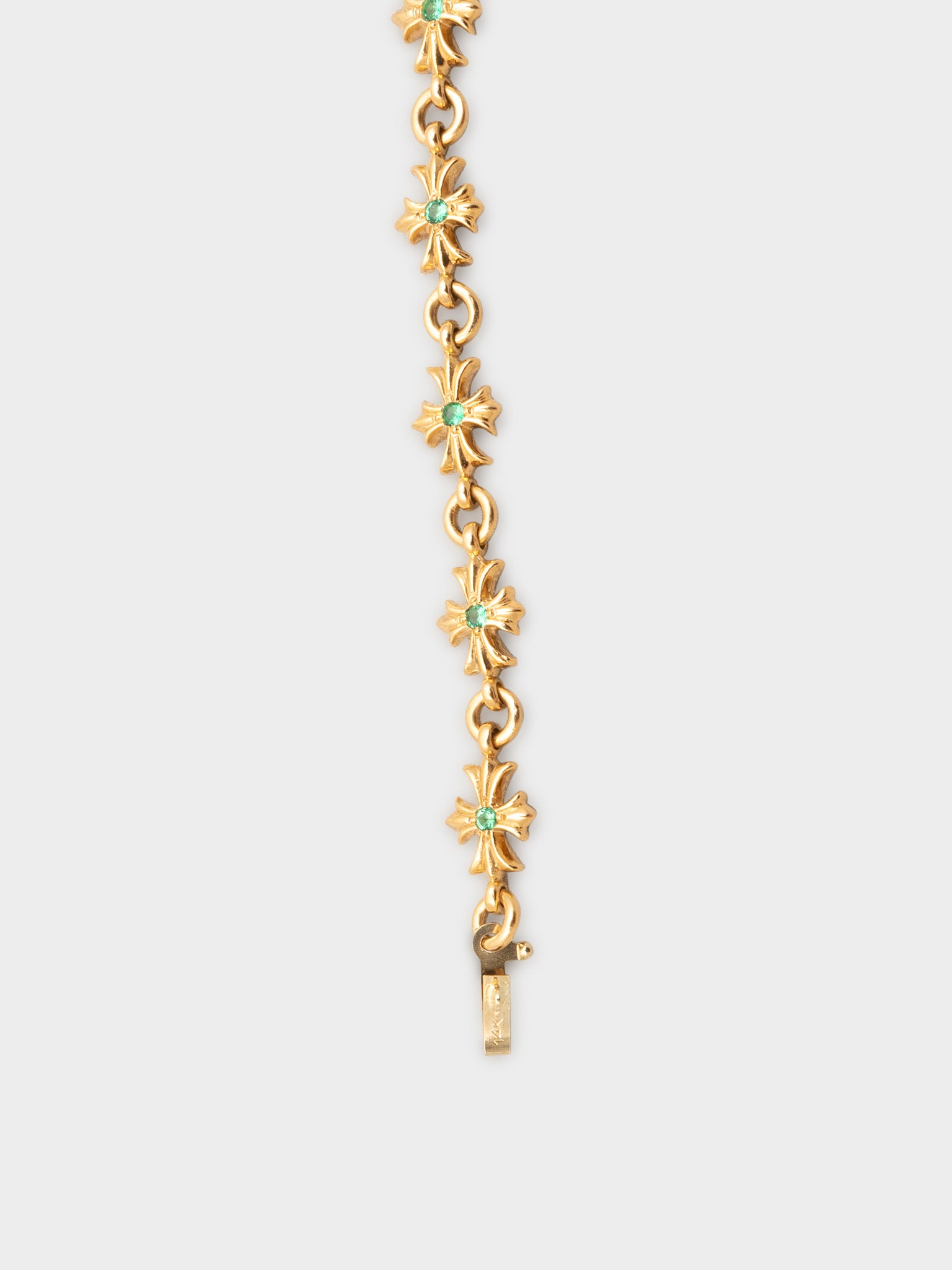 A solid 22k gold Chrome Hearts Tiny E bracelet where each link has a stunning green emerald studded in it.
