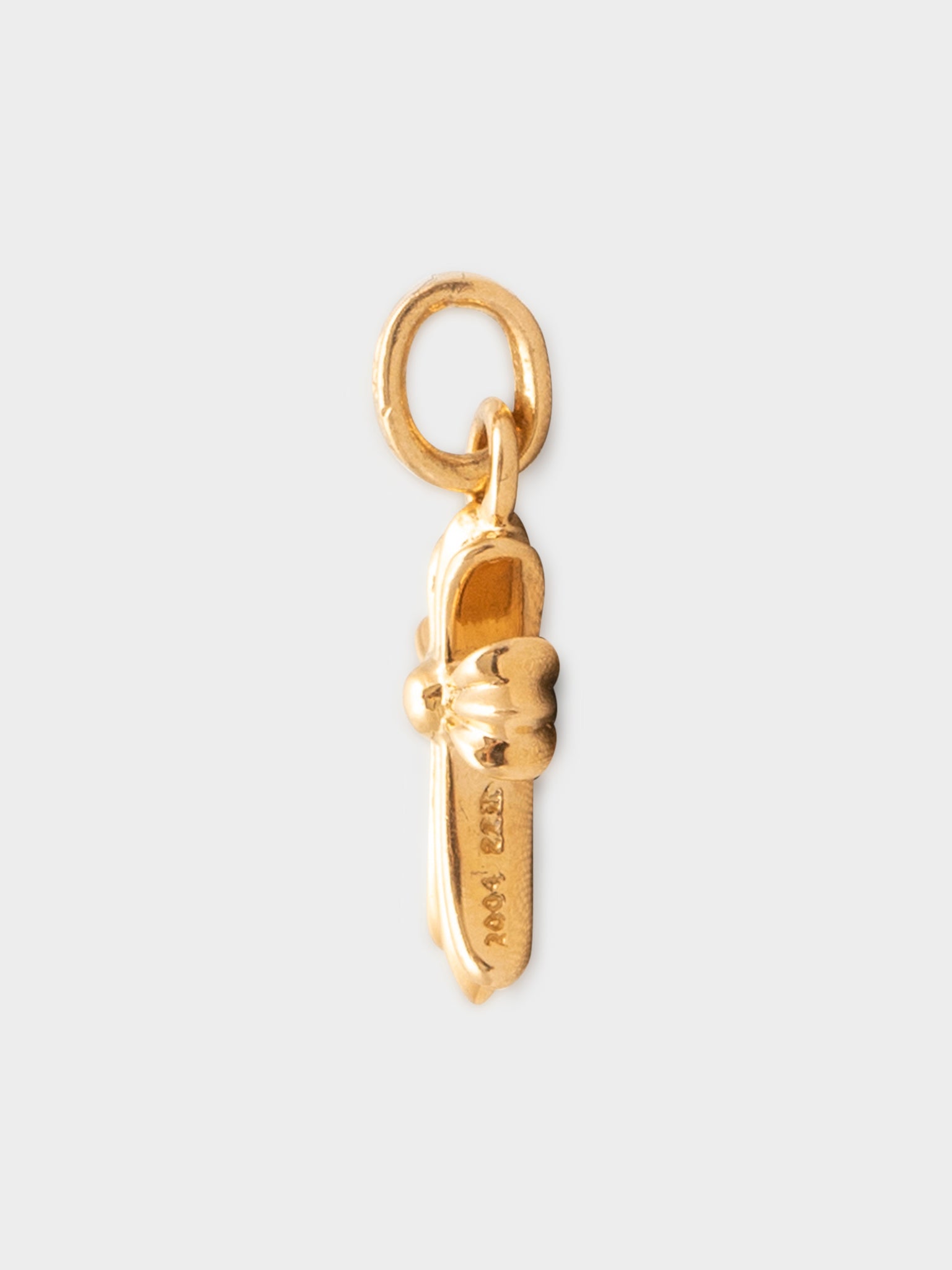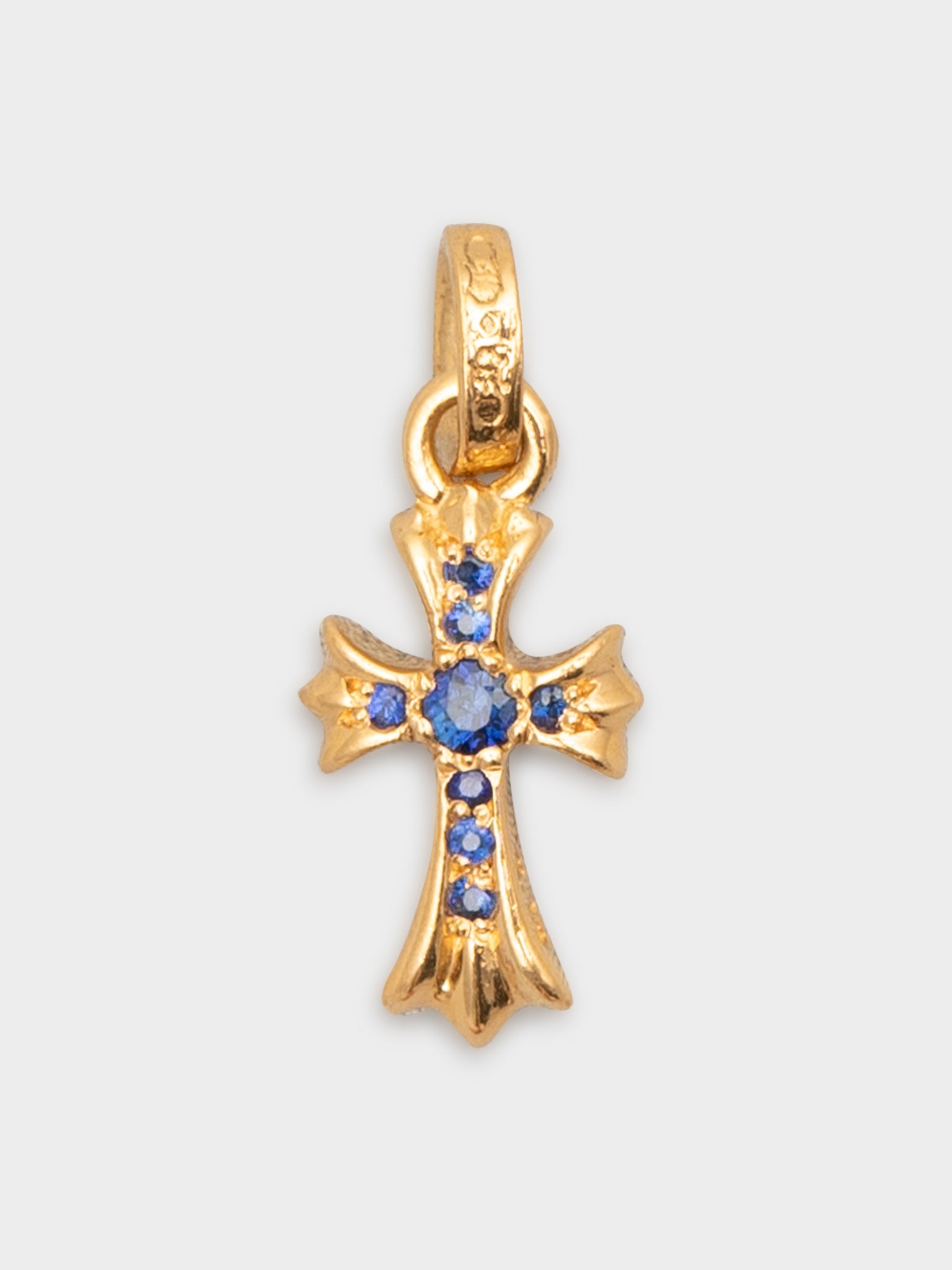 A solid 22k gold Chrome Hearts Baby Fat pendant paved out with brilliant blue sapphires
