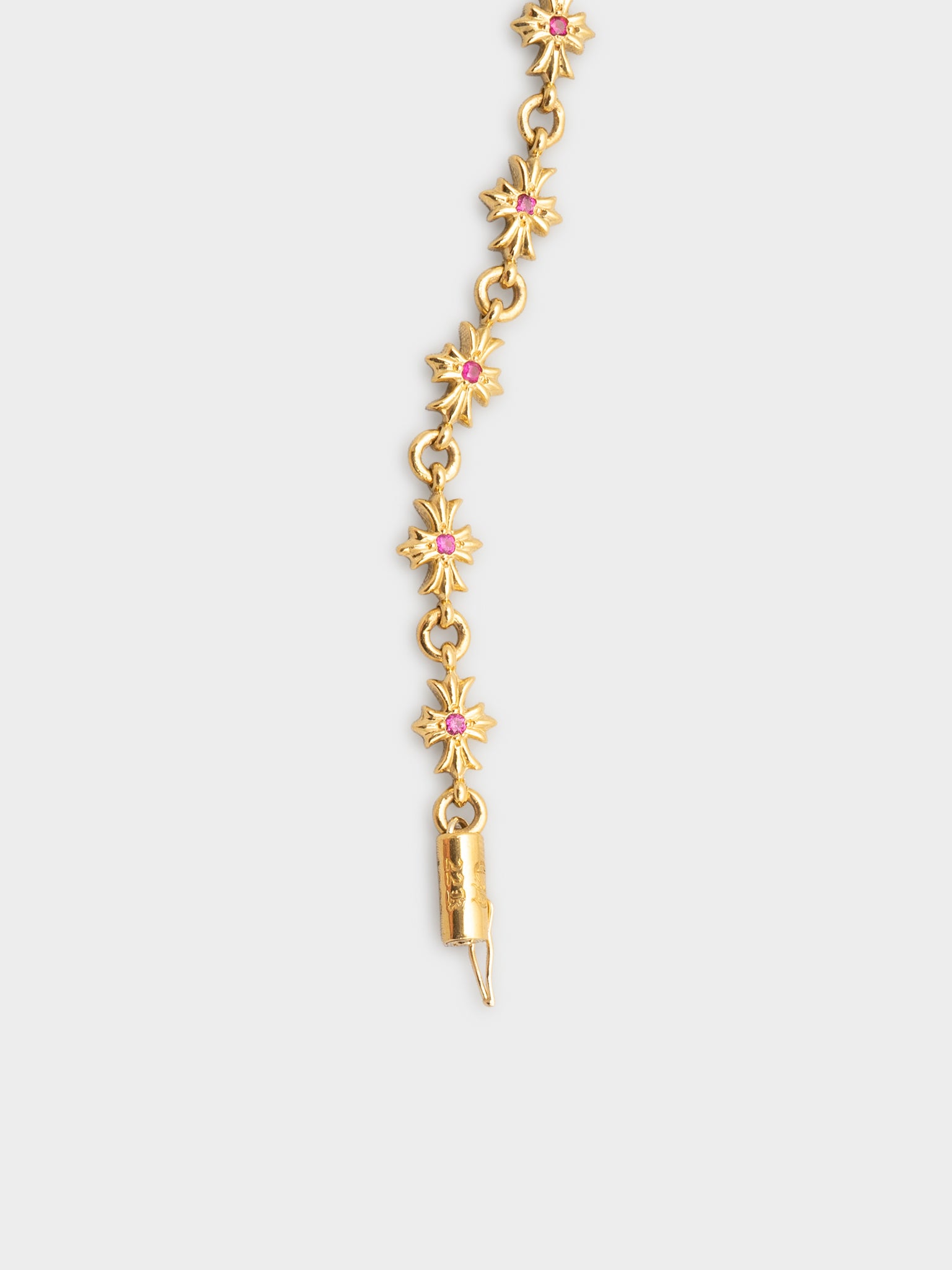 A solid 22k gold Chrome Hearts Tiny E bracelet with brilliant red rubies studded throughout
