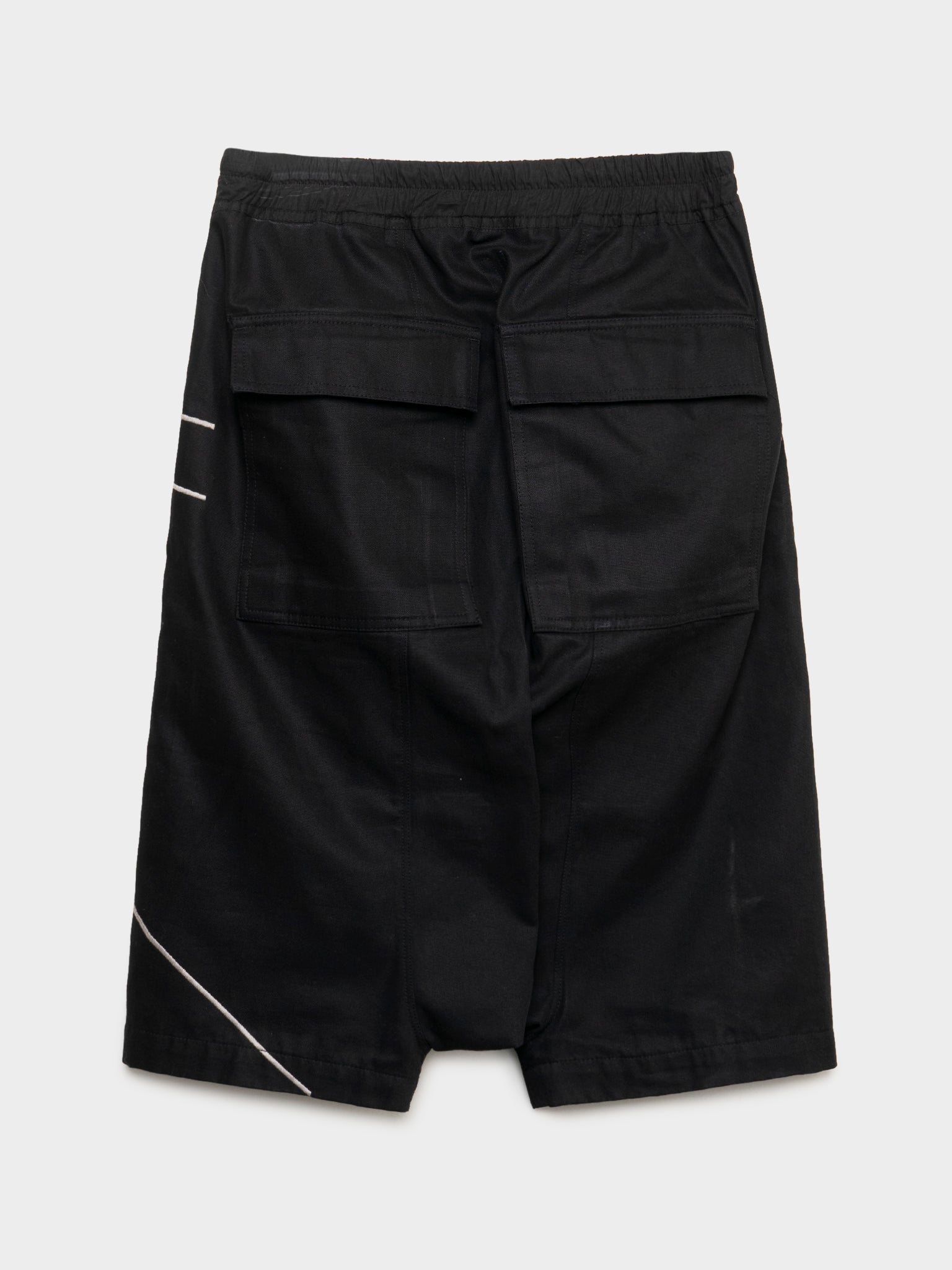 A pair of Rick Owens black pod shorts with white geometric designs throughout from his SS16 collection 'Cyclops'