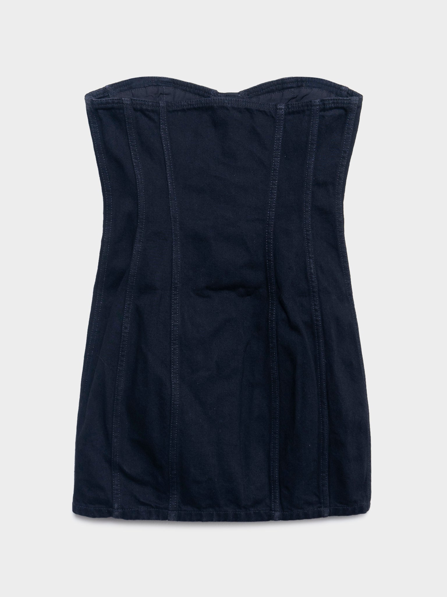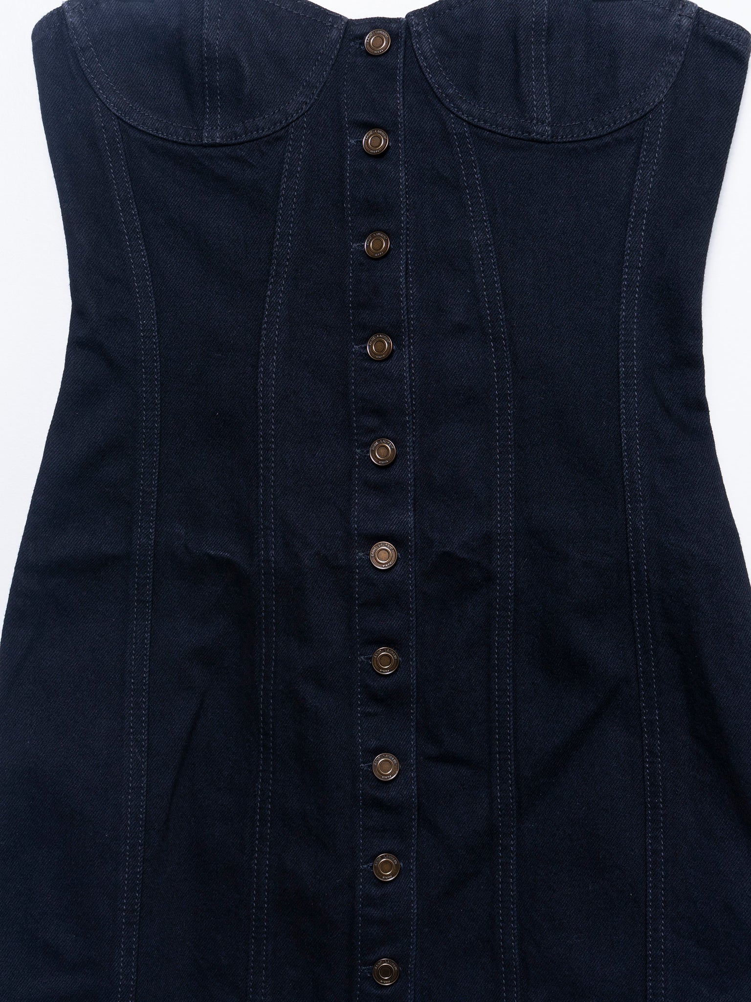 A short denim dress from Saint Laurent that buttons up the front with semi structured ribbing that give a corset vibe