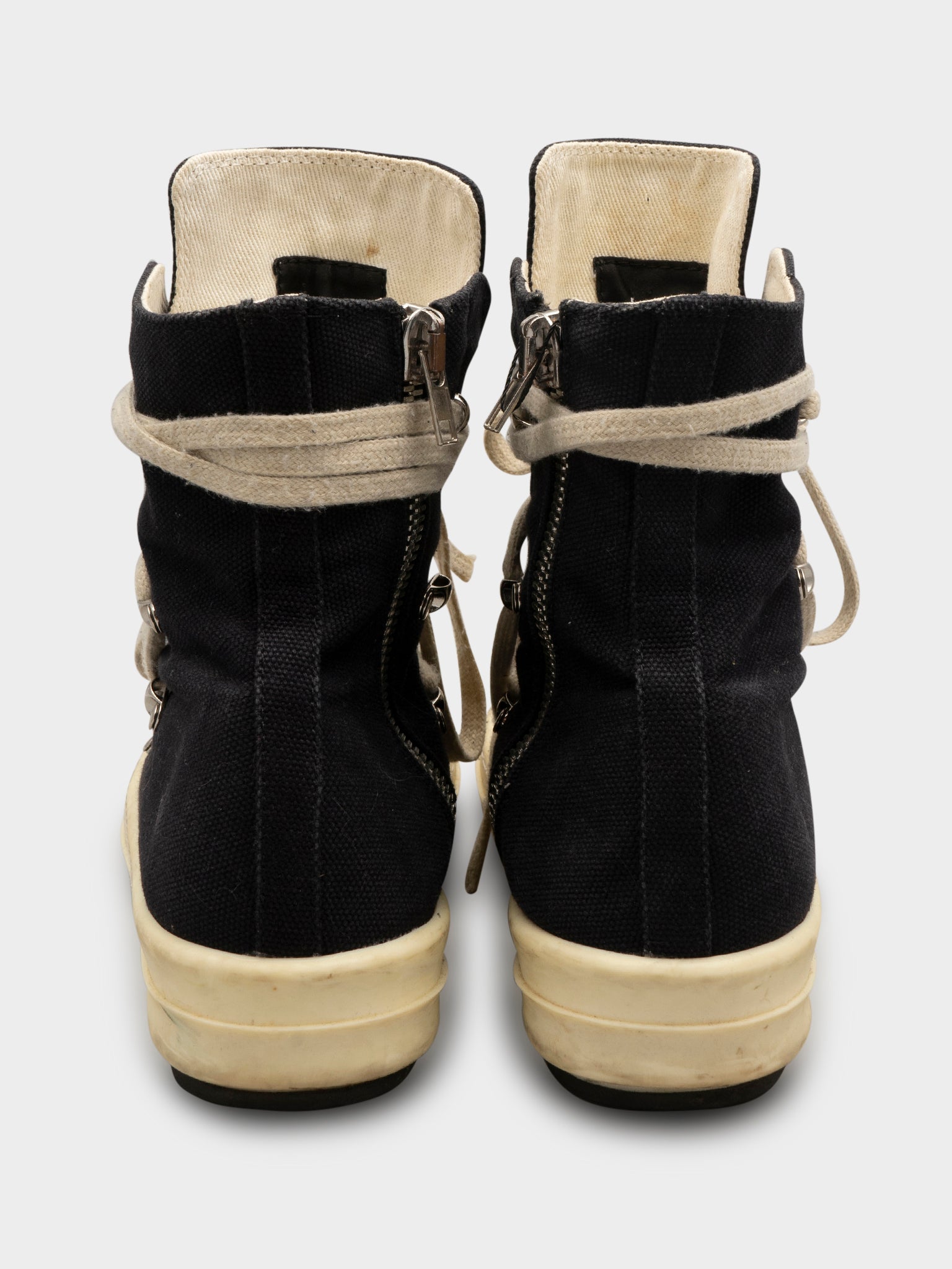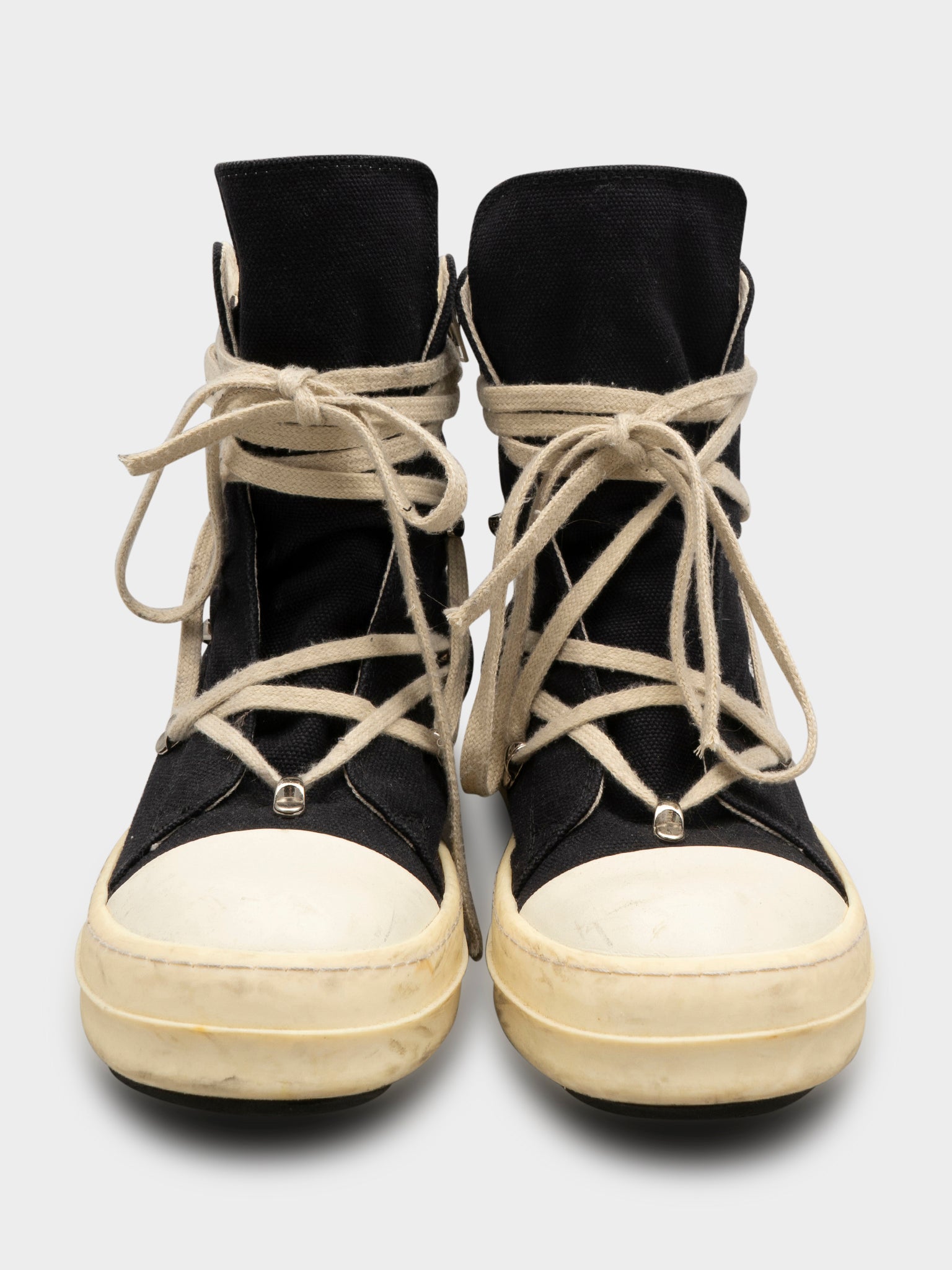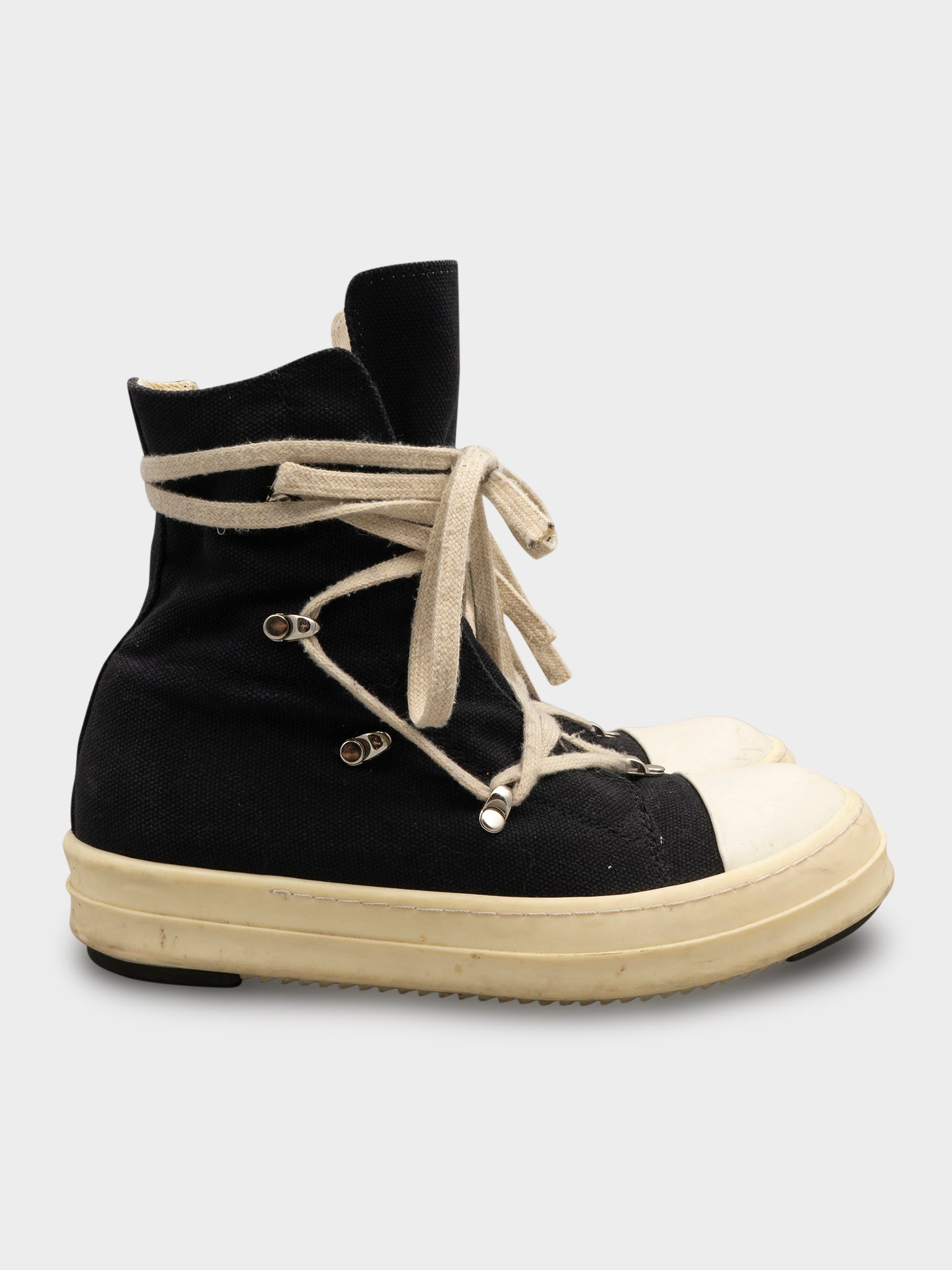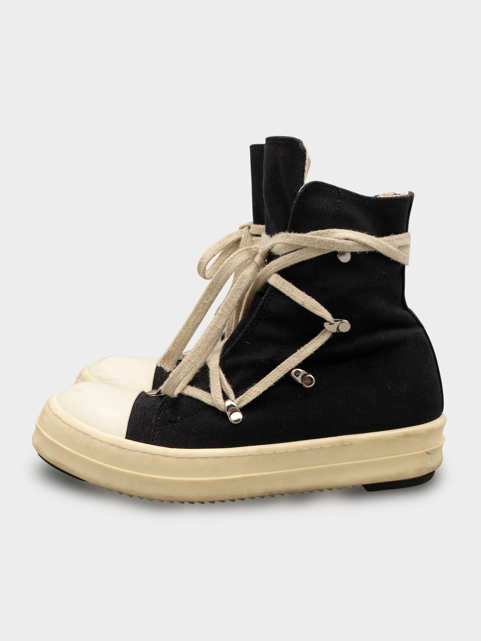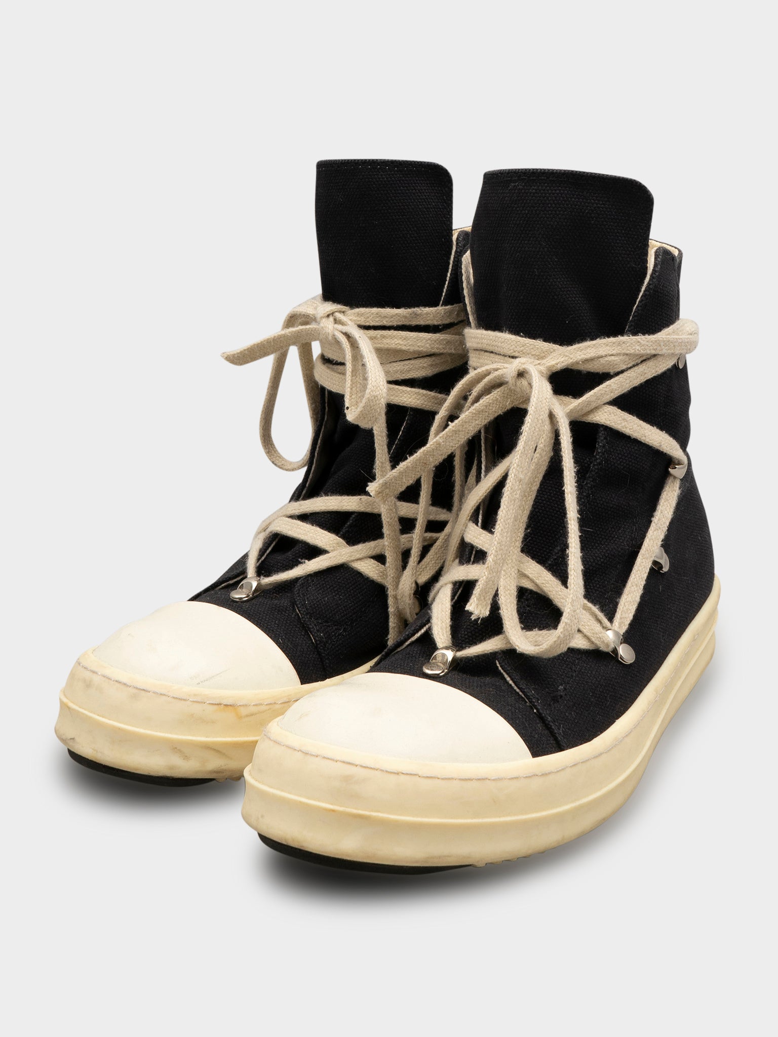 A pair of hi top Rick Owens Ramones with their iconic hexagram shaped lacing