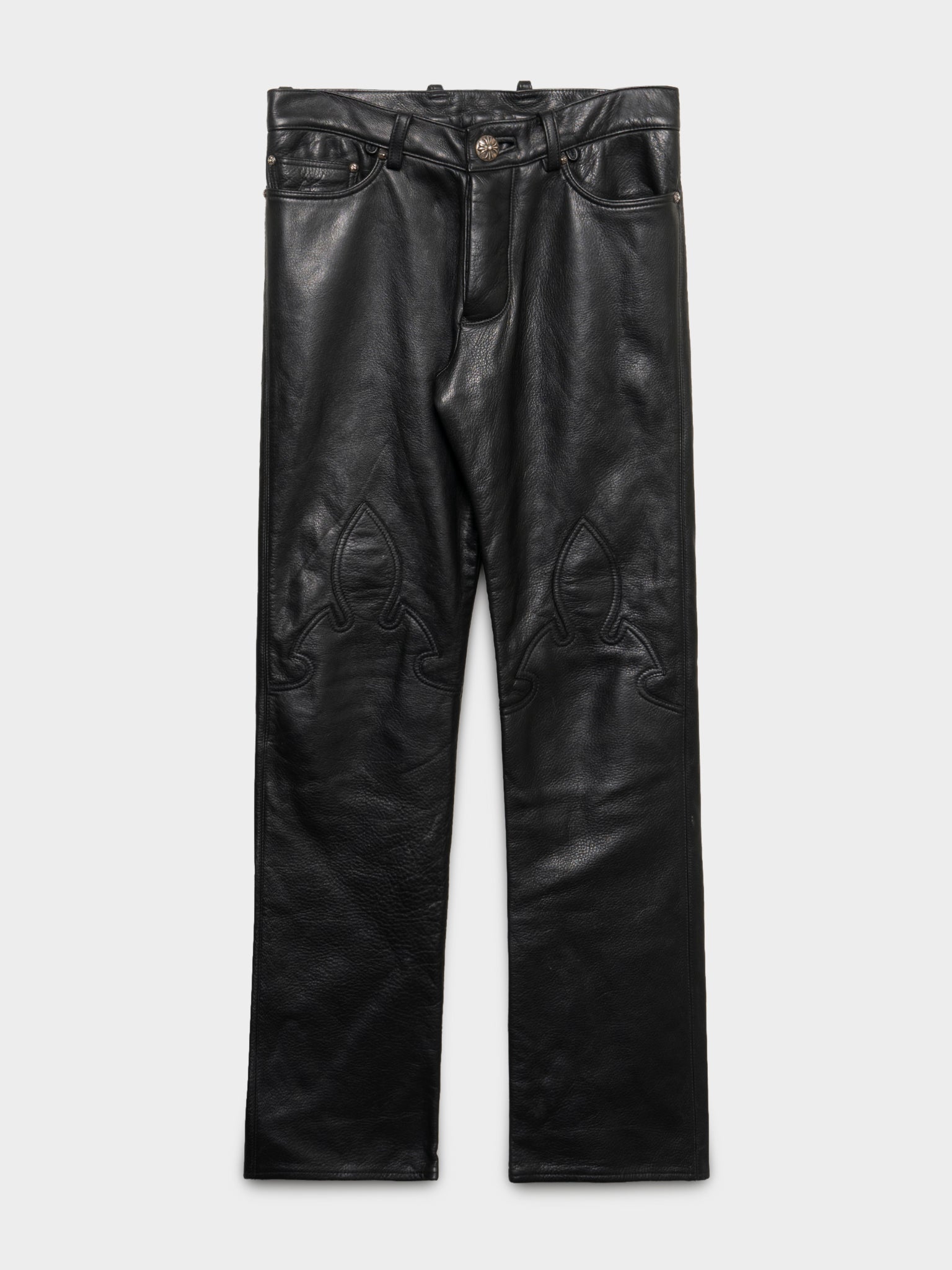 A pair of hefty Chrome Hearts leather pants with large fleur patches on the knees and plenty of sterling silver hardware