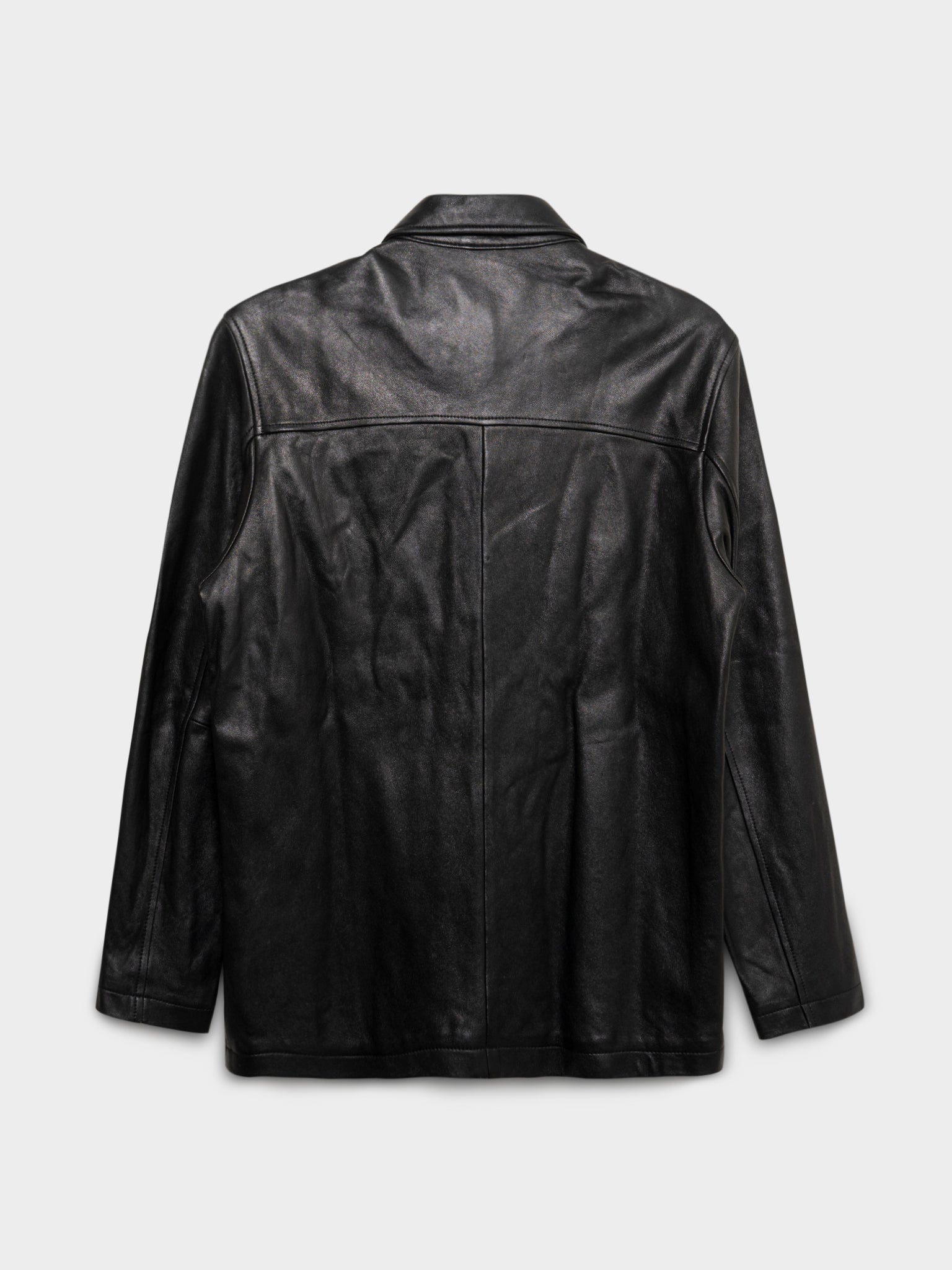 A vintage black leather Balenciaga peacoat with two side pockets.