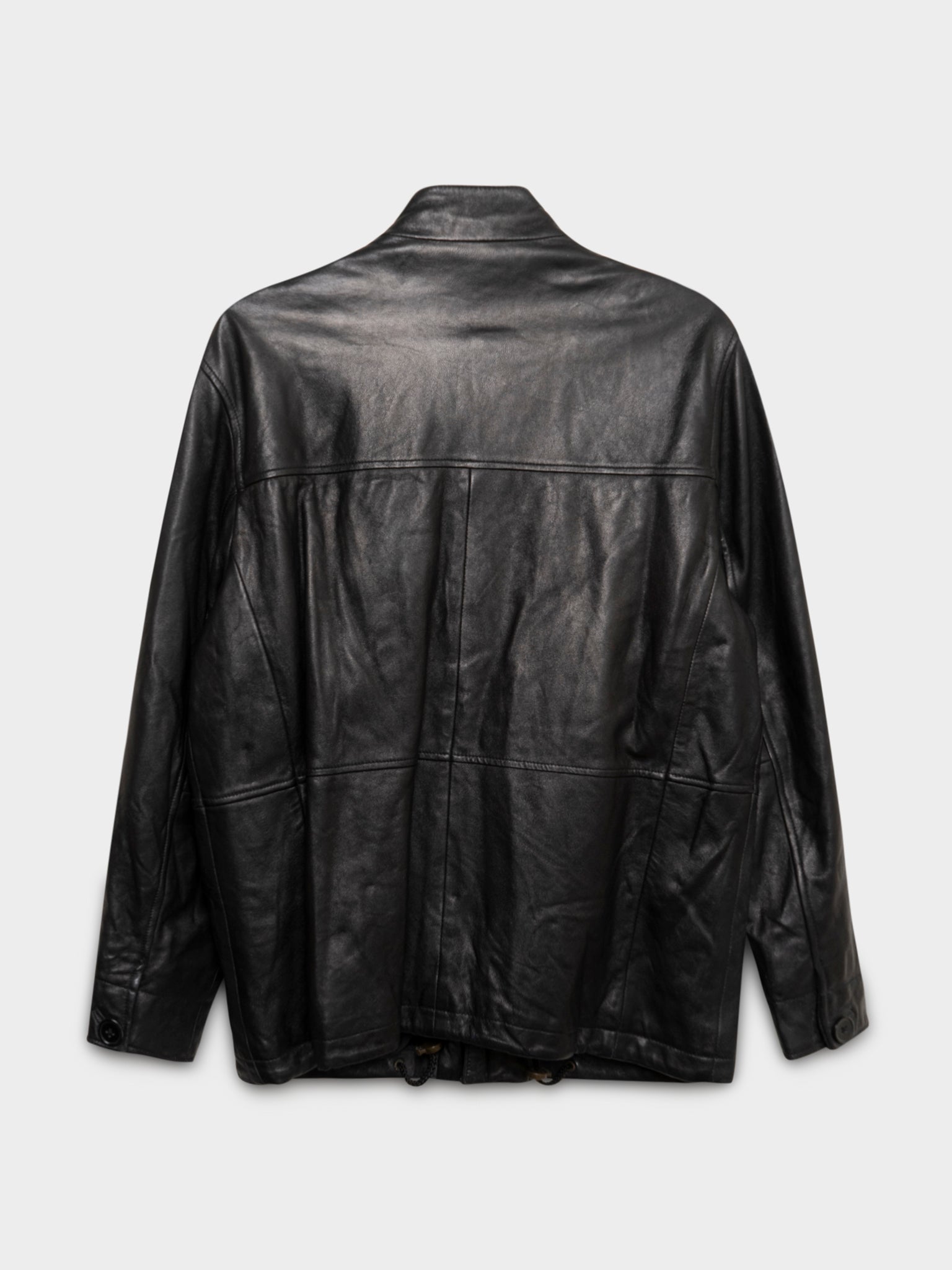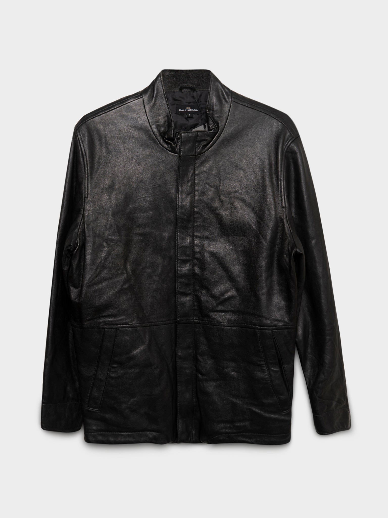 A buttery black leather Balenciaga racer style jacket, including higher collar and front placket