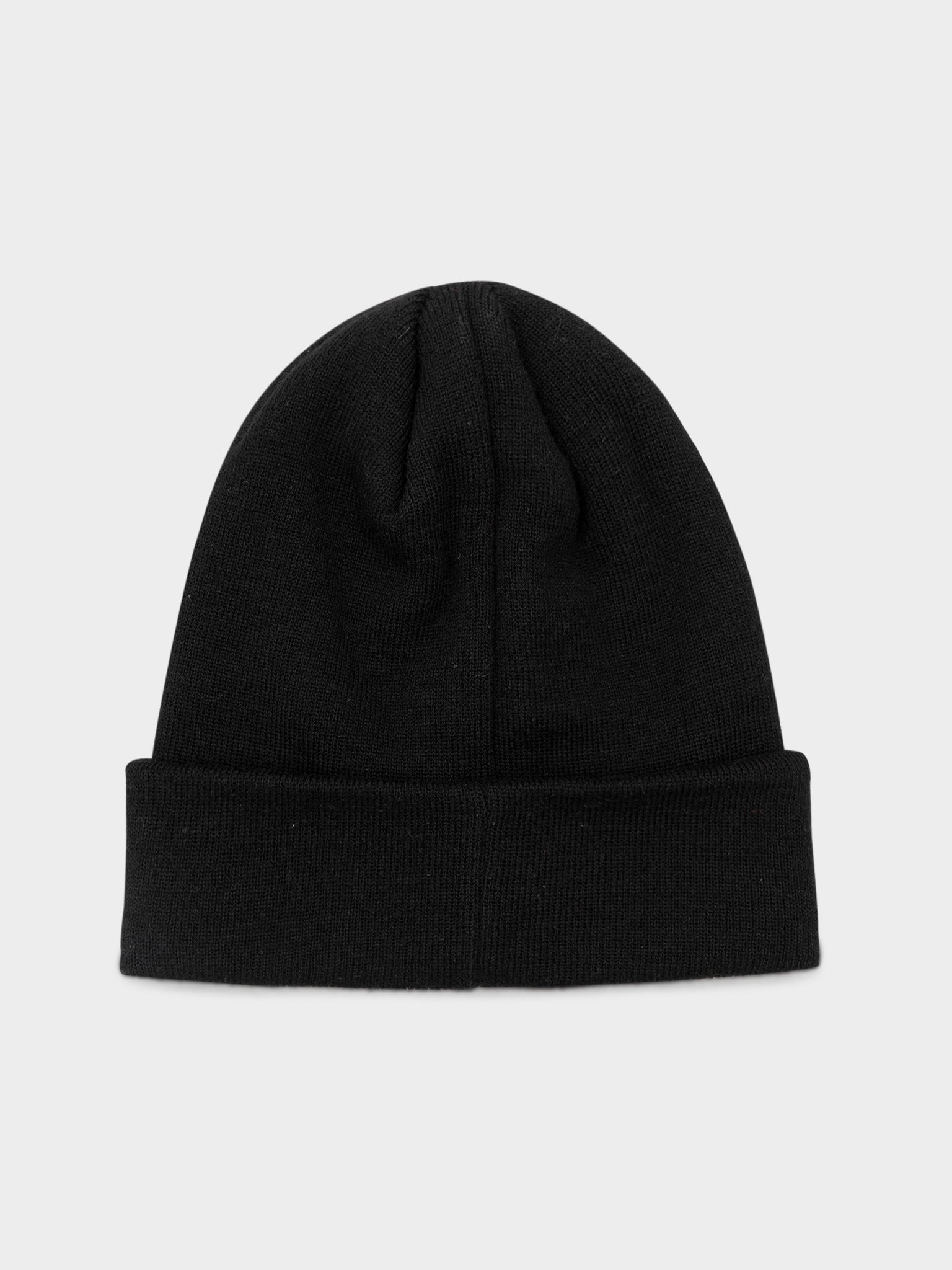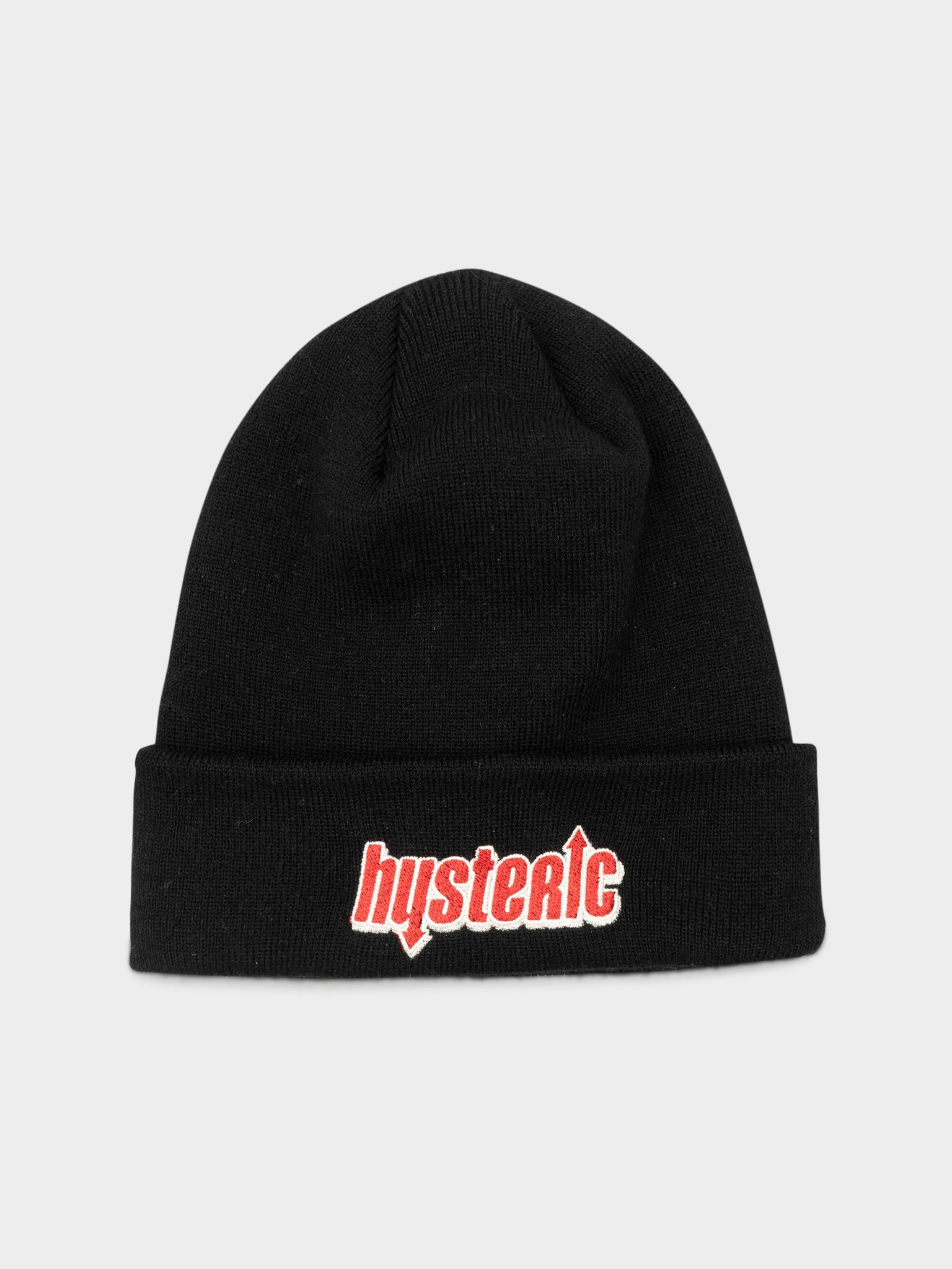 A black cozy beanie from Hysteric Glamour with their logo written across the front