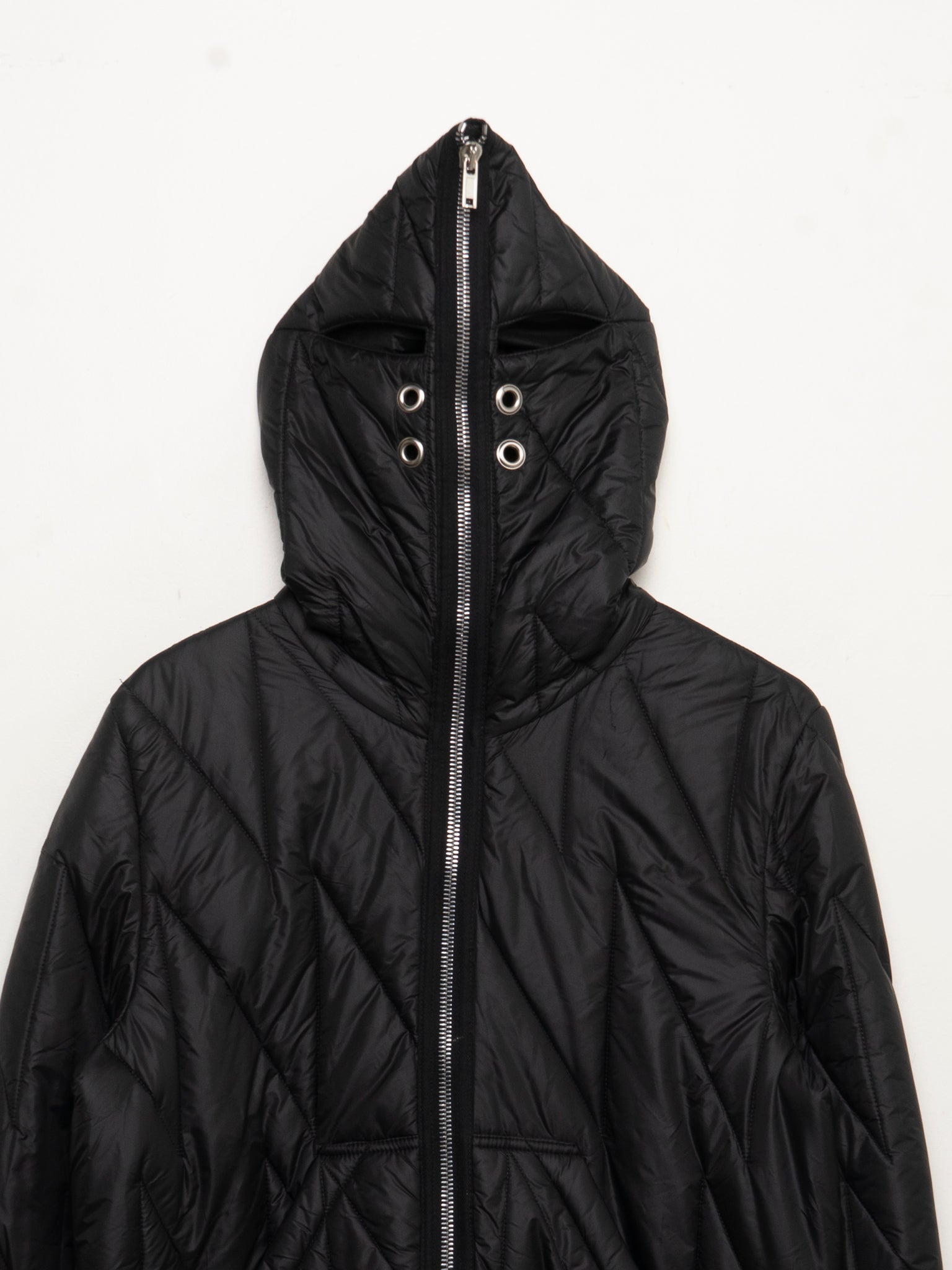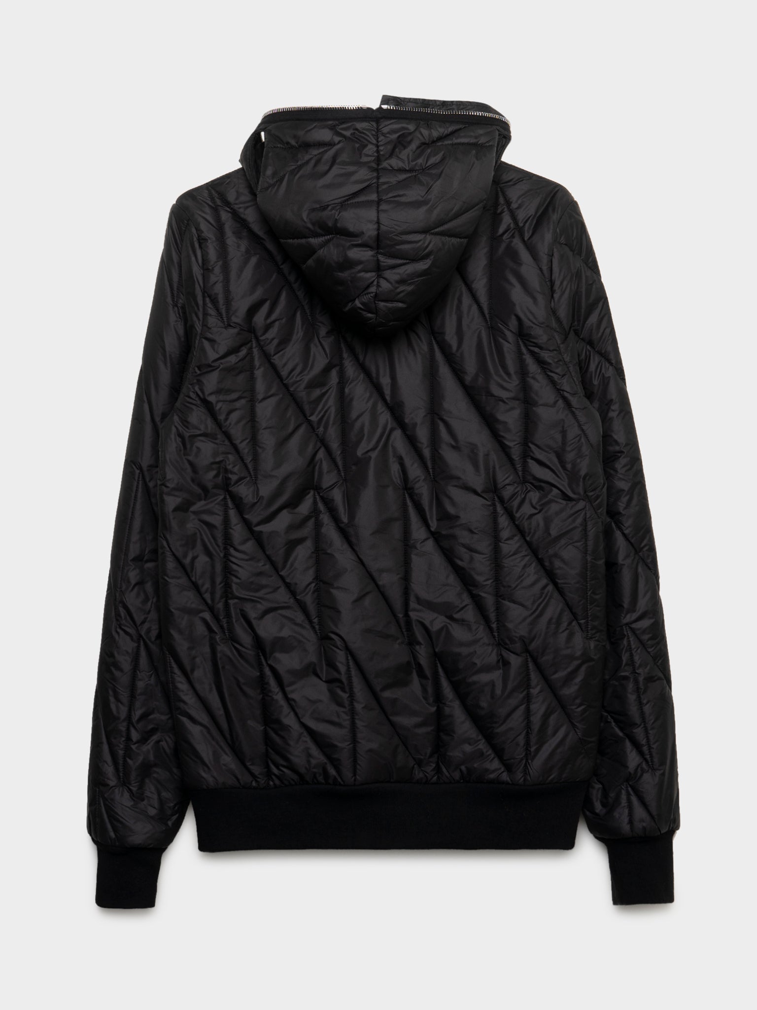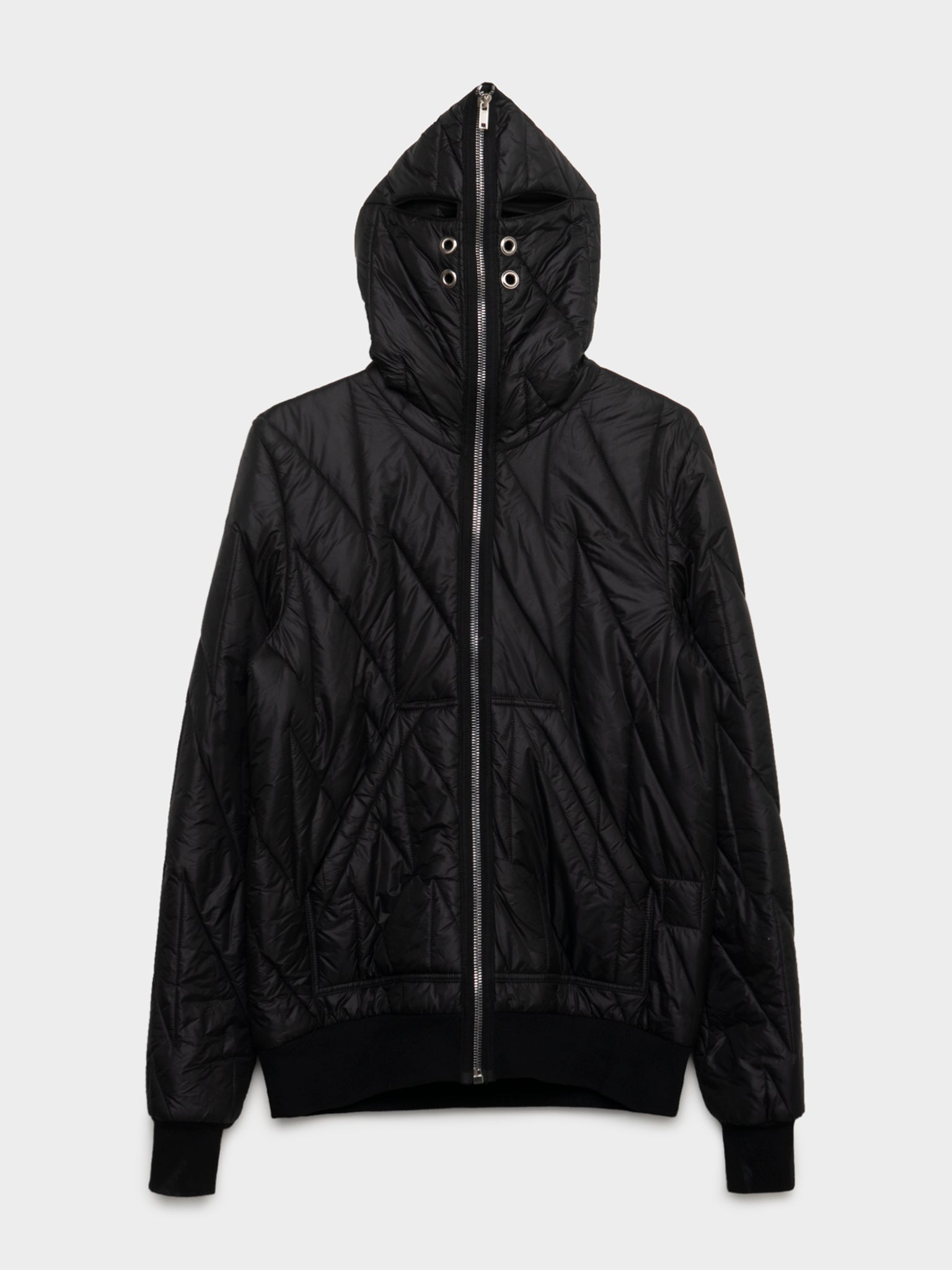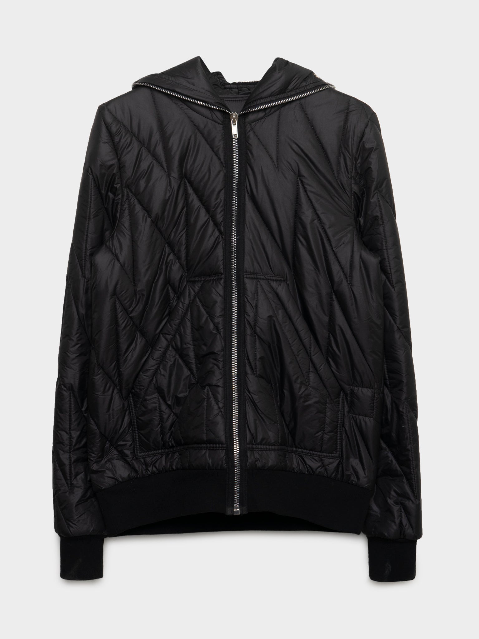A black quilted Rick Owens jacket that fully zips up in their signature gimp style.