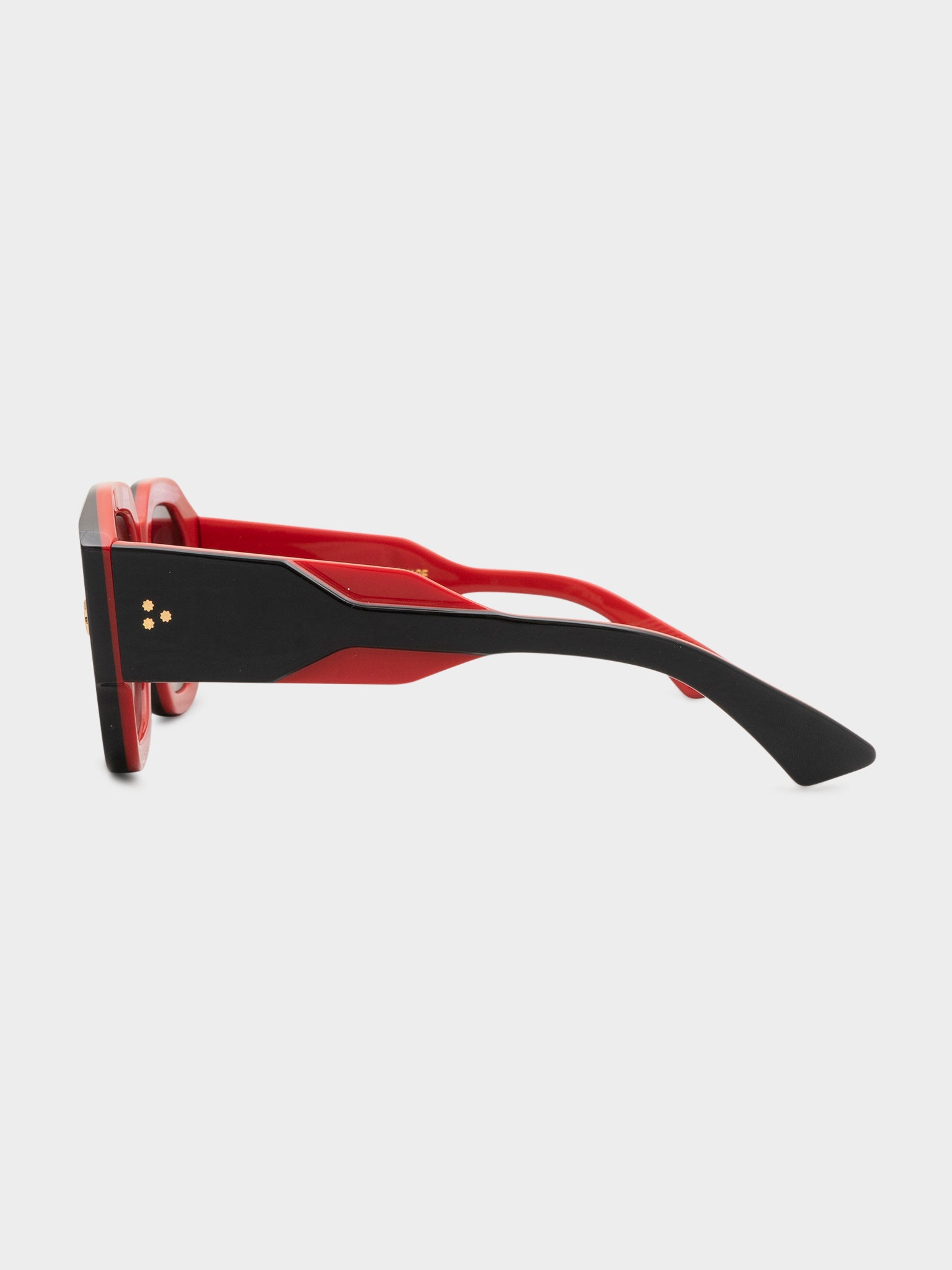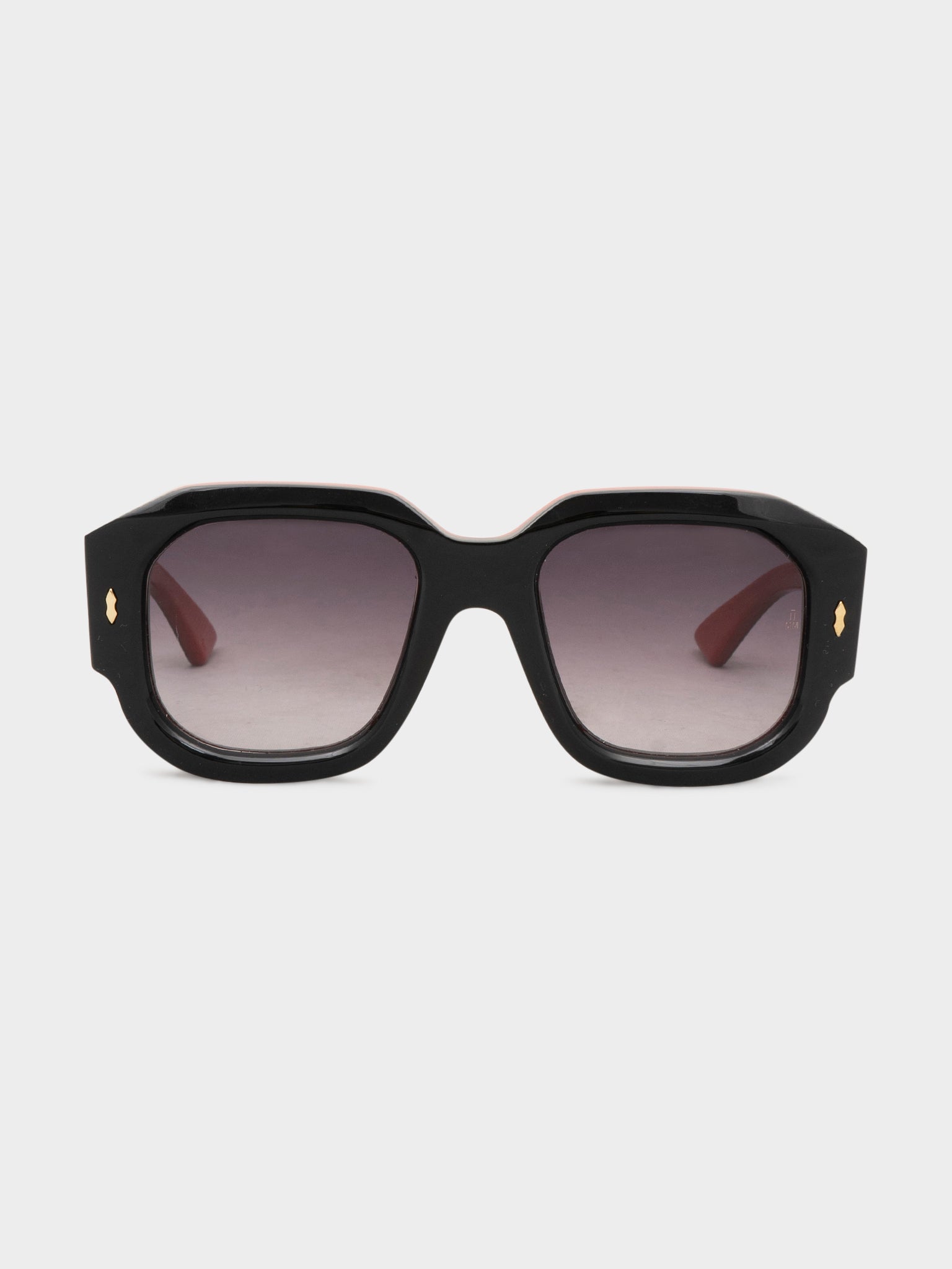 A pair of black oversized Jacques Marie Mage Lacy sunglasses with bright red trims.