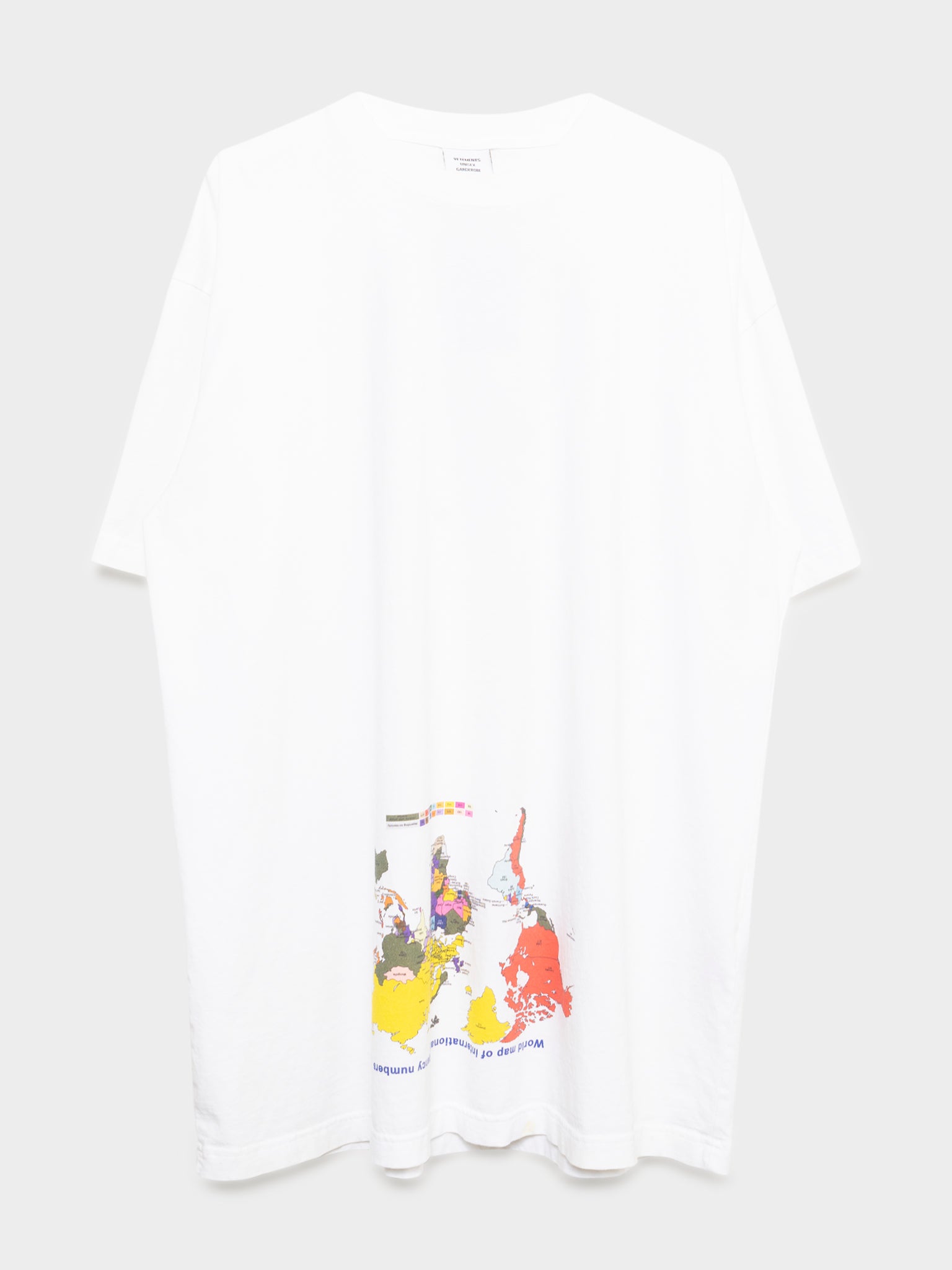 An oversized white tee from Vetements with a small colorful world map on the front and a large marker on the back