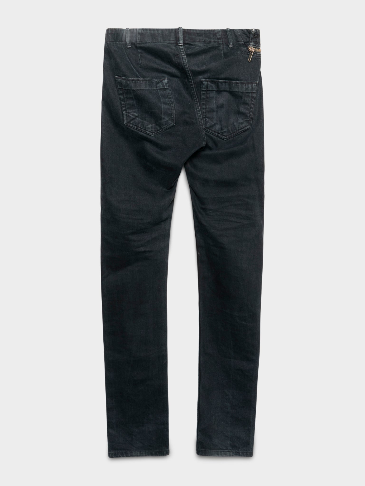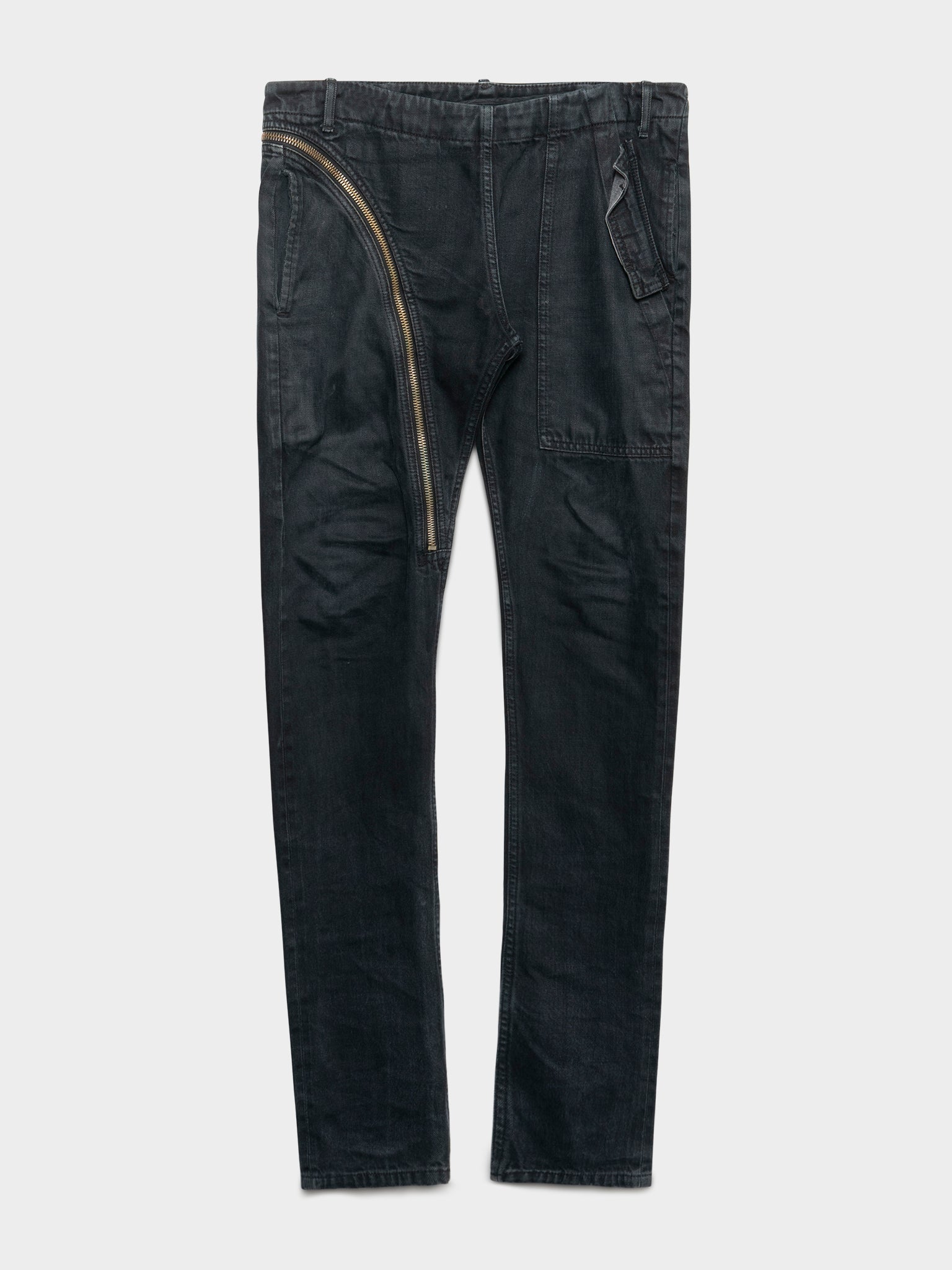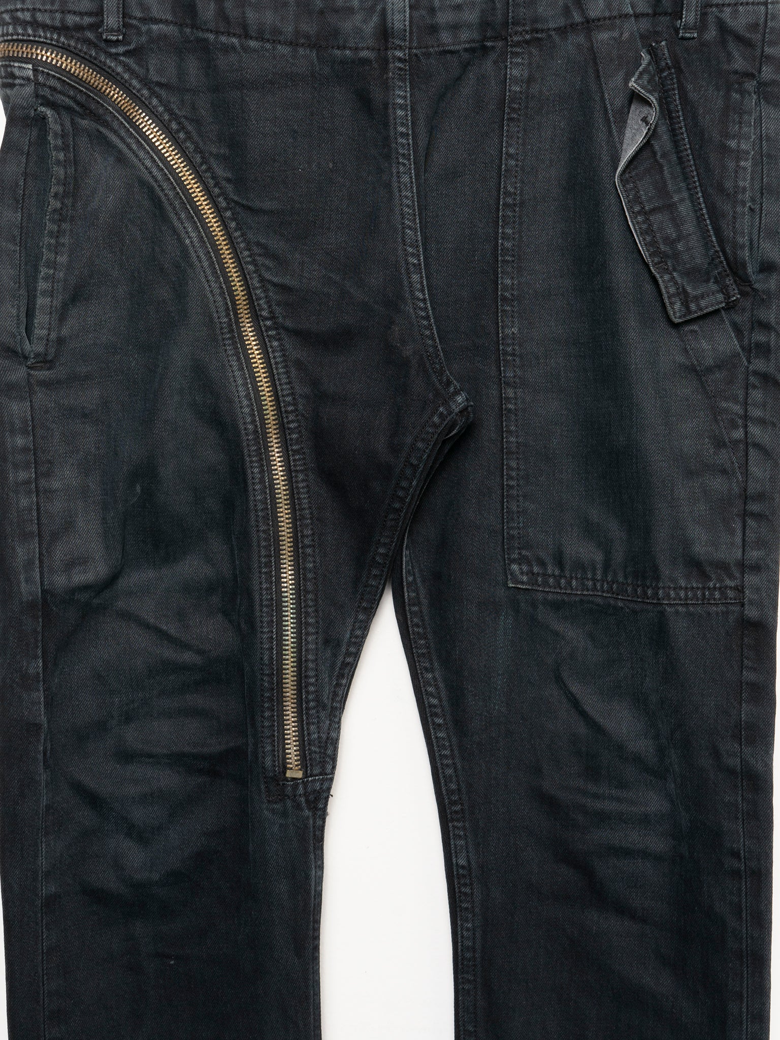 A pair of overdyed Rick Owens Aircut pants from his FW14 season with their signature curved zipper down the front