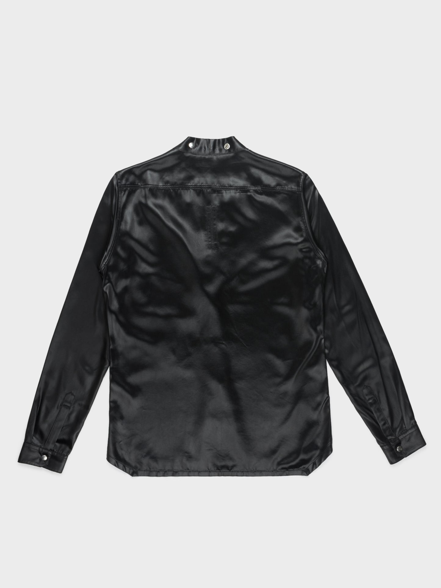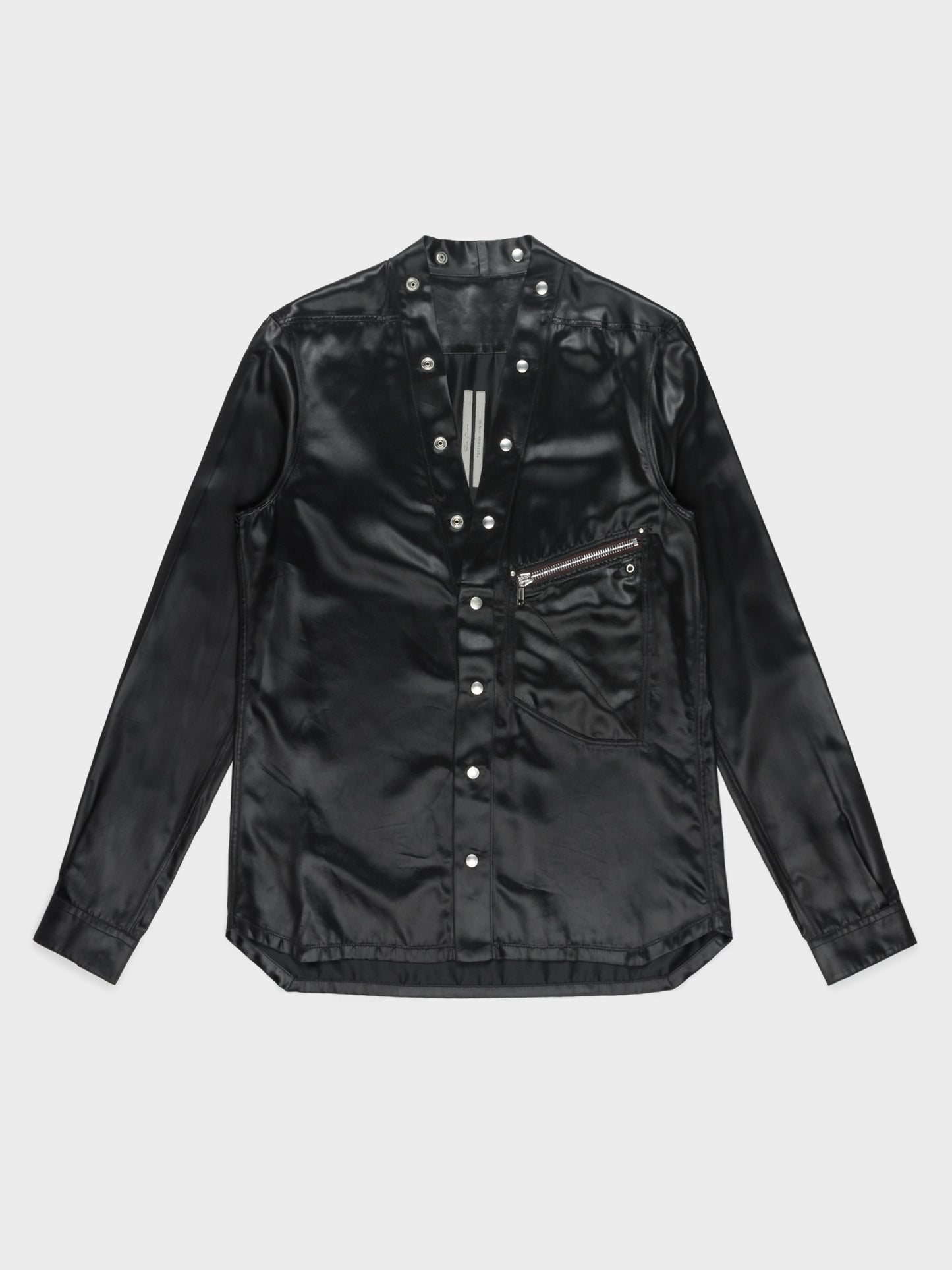 A sleek, shiny button up tunic-like shirt from Rick Owens with the classic deep v-neck line and some thin pockets on it as well.