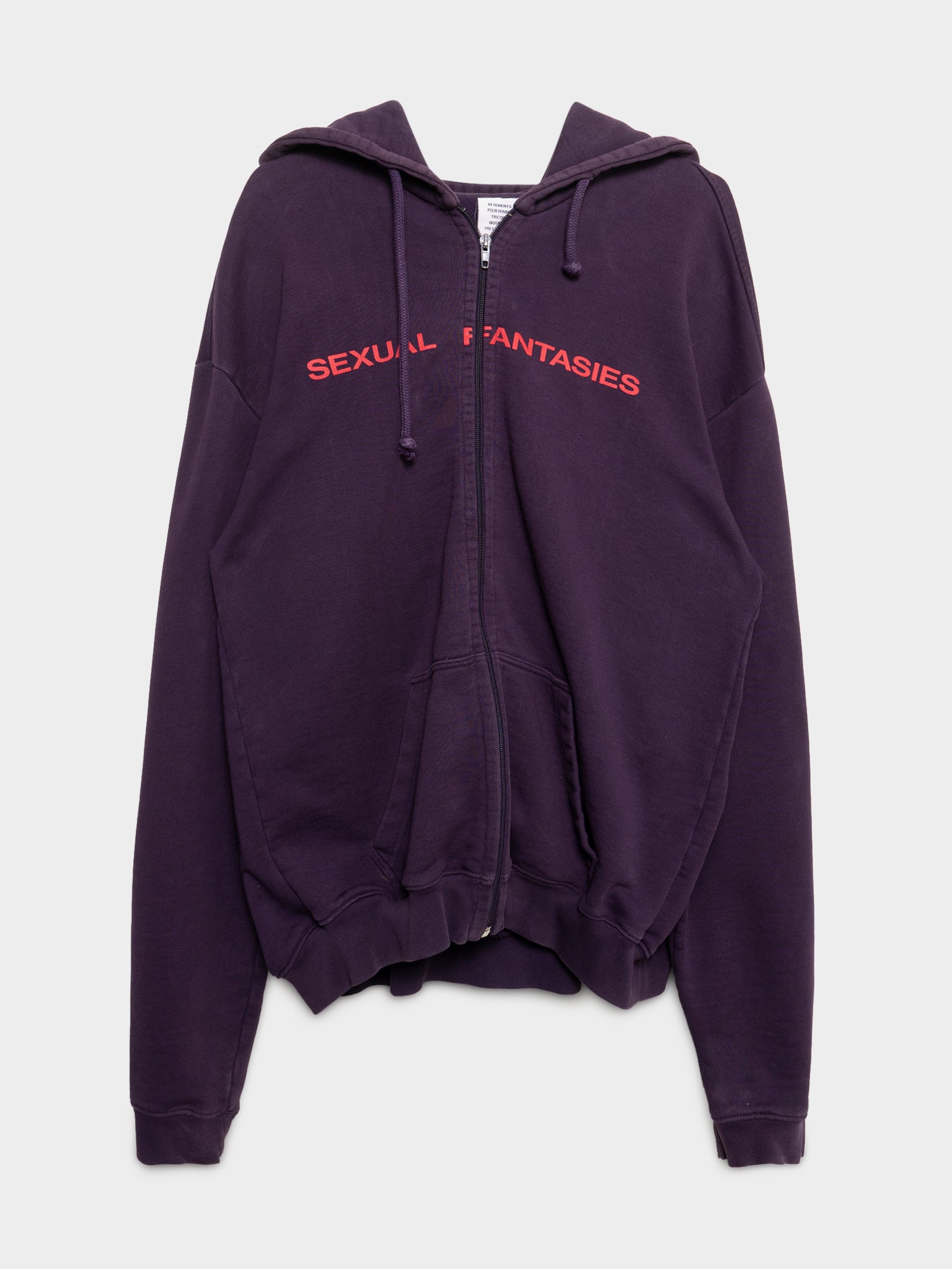 The legendary 2017 Vetements purple zip up hoodie with Sexual Fantasies blasted across the front