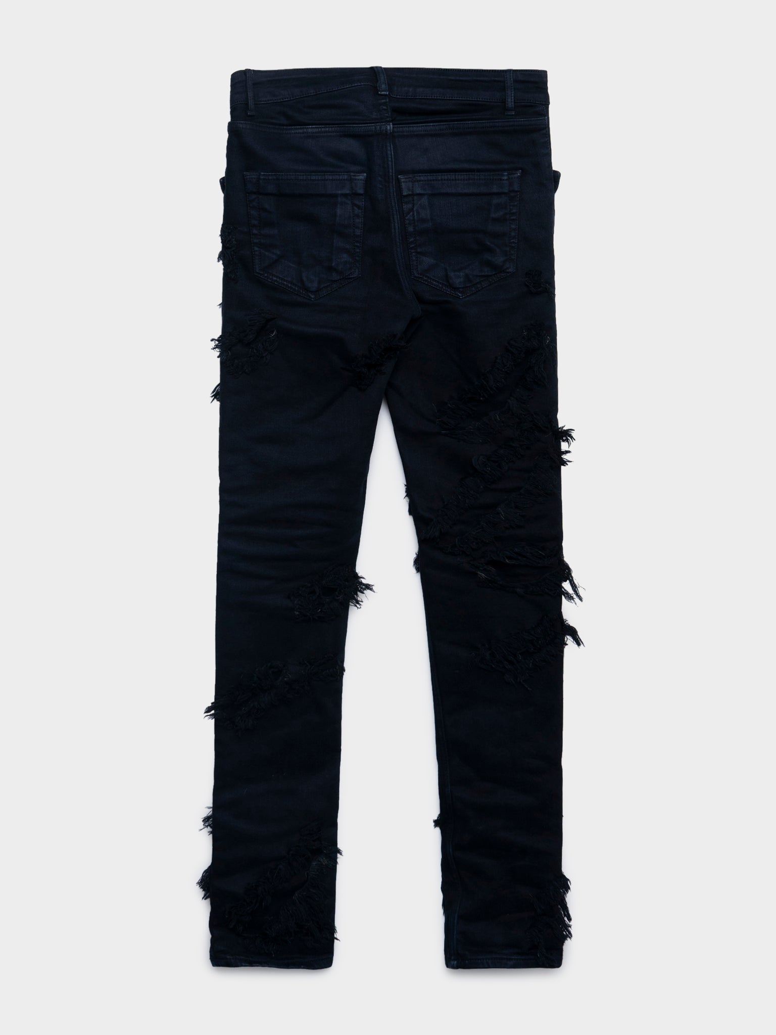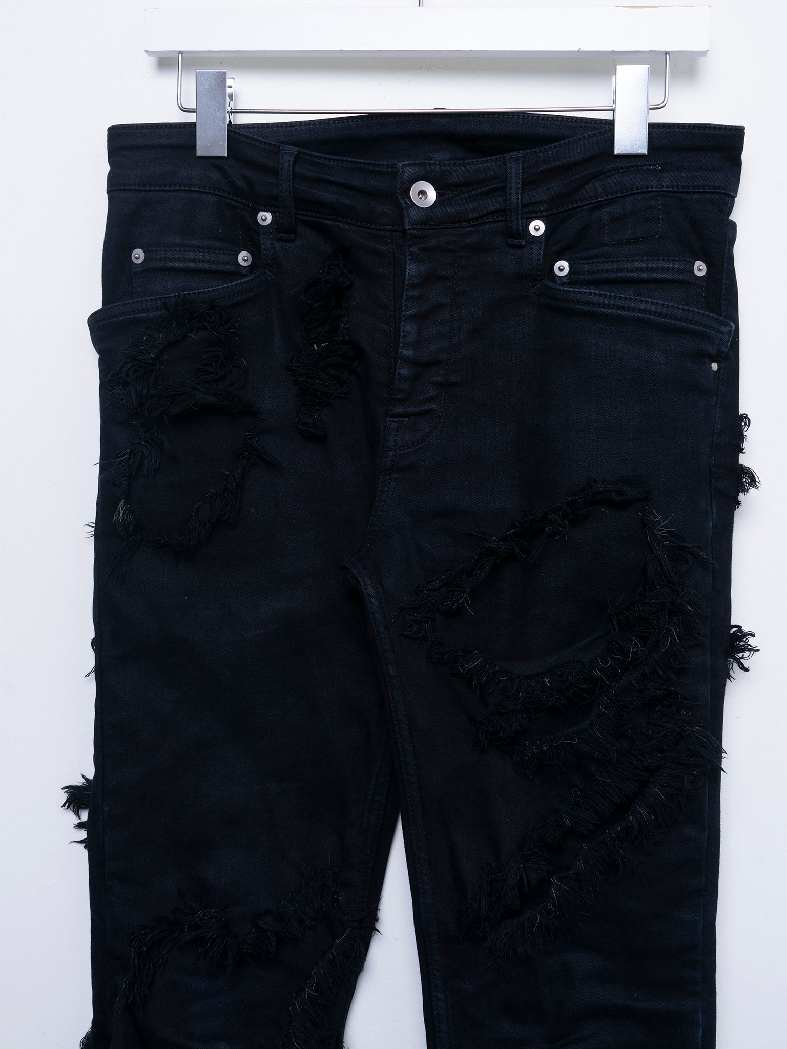 A pair of black slim fit Rick Owens jeans fully slashed up.