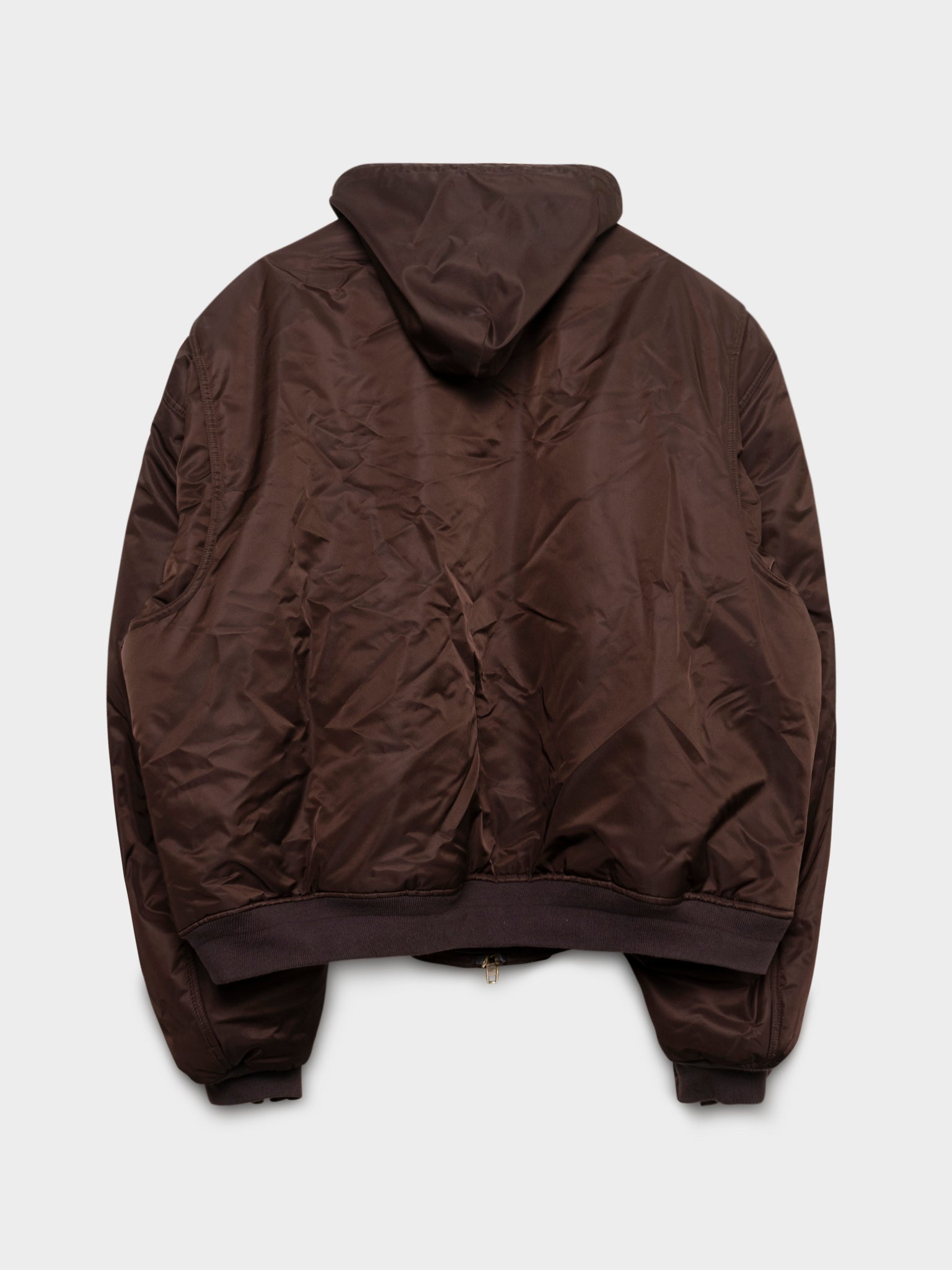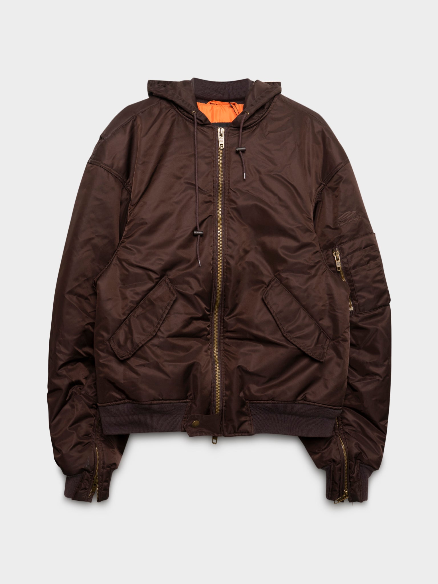 An oversized brown bomber from Balenciaga with their subtle Sporty B logo on the sleeve.