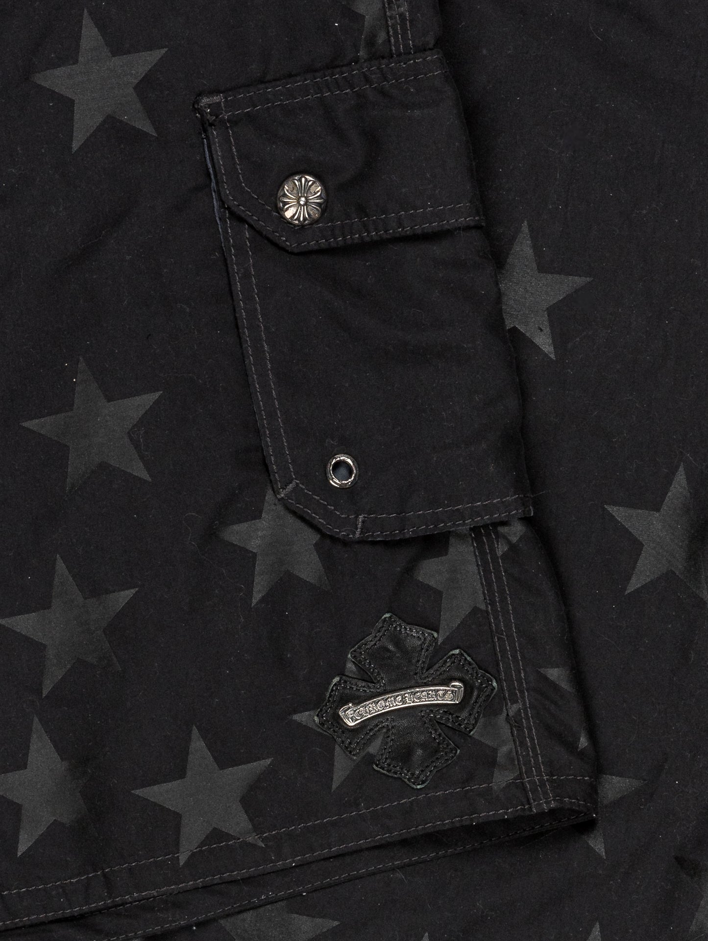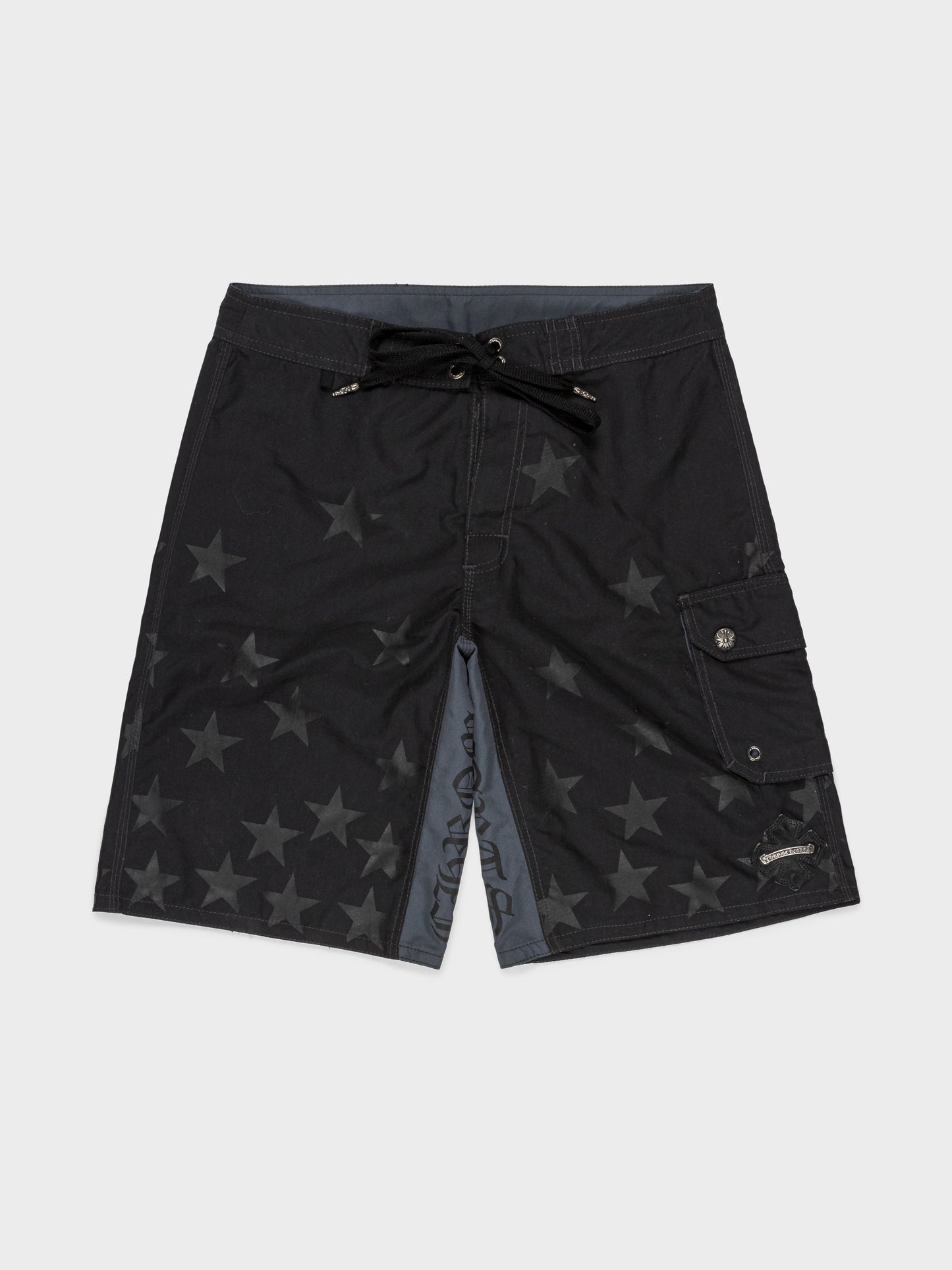 The perfect pair of swim trunks for the summer from Chrome Hearts with large stars covering the shorts, with sterling silver hardware.