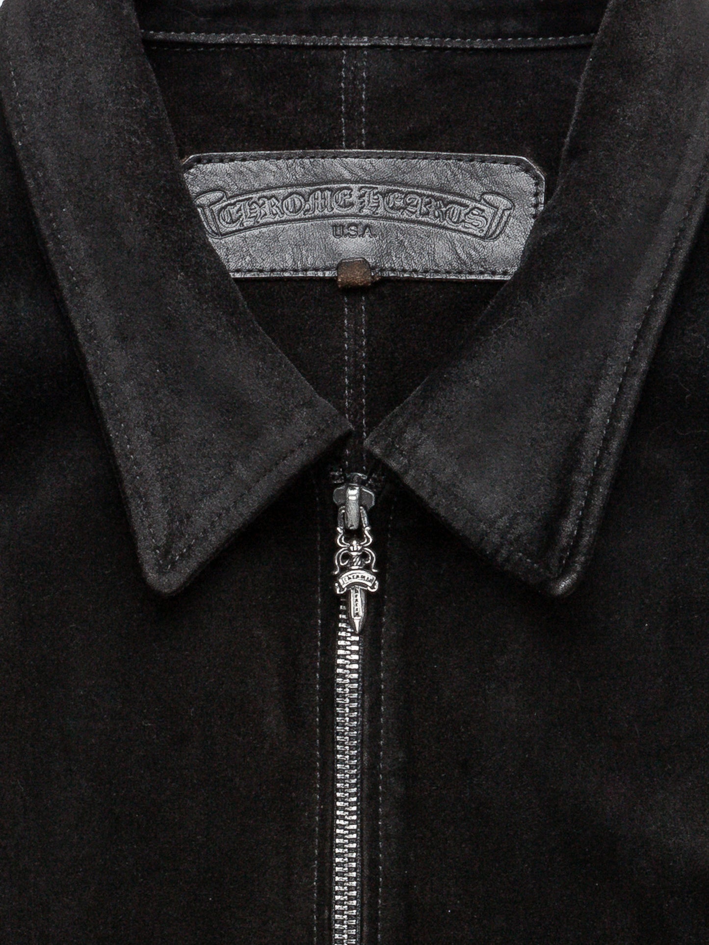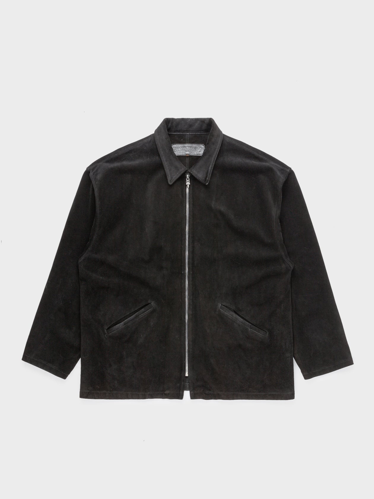 A stunning suede chore jacket from Chrome Hearts with a zip up front, and large patch design on the back of the garment.
