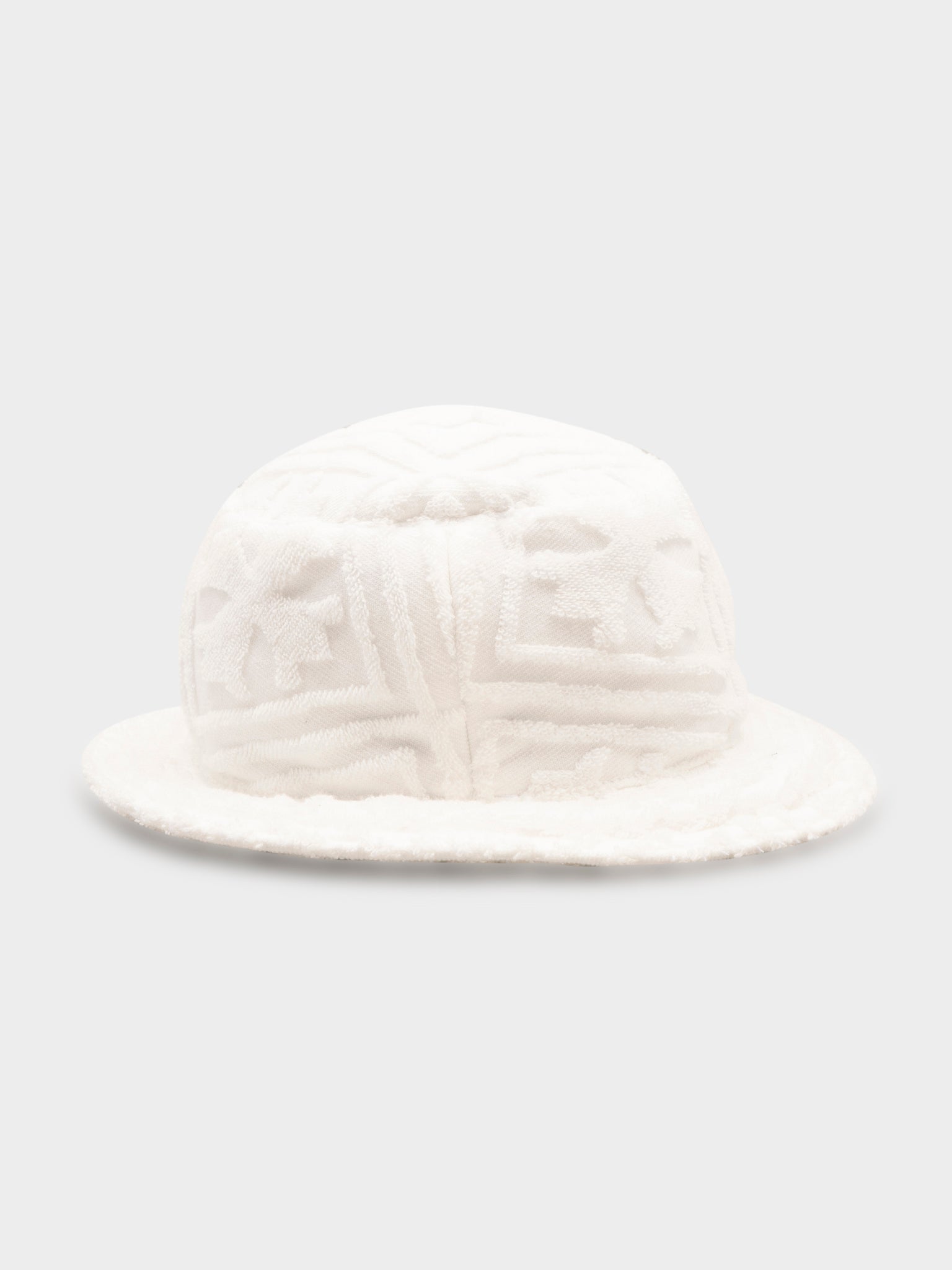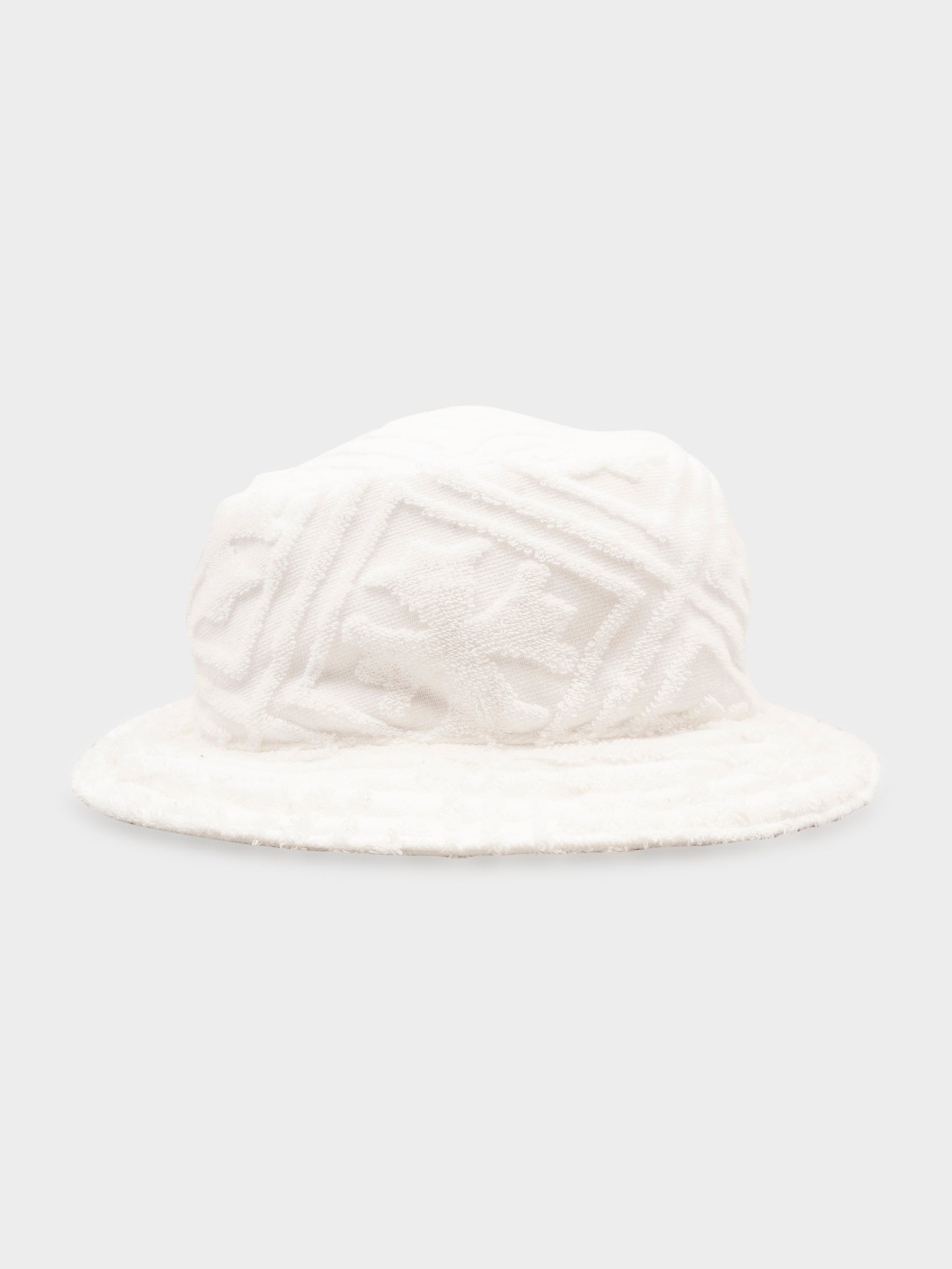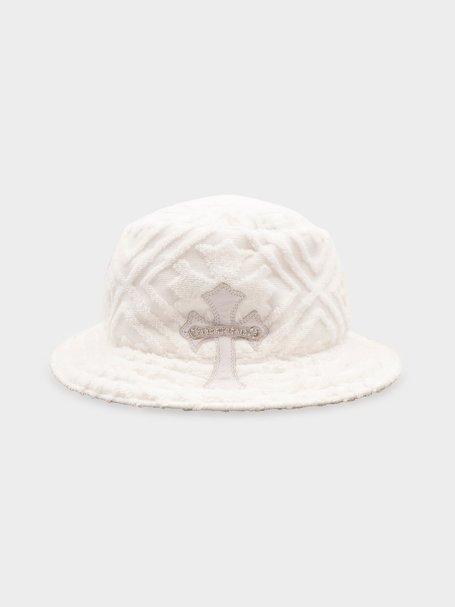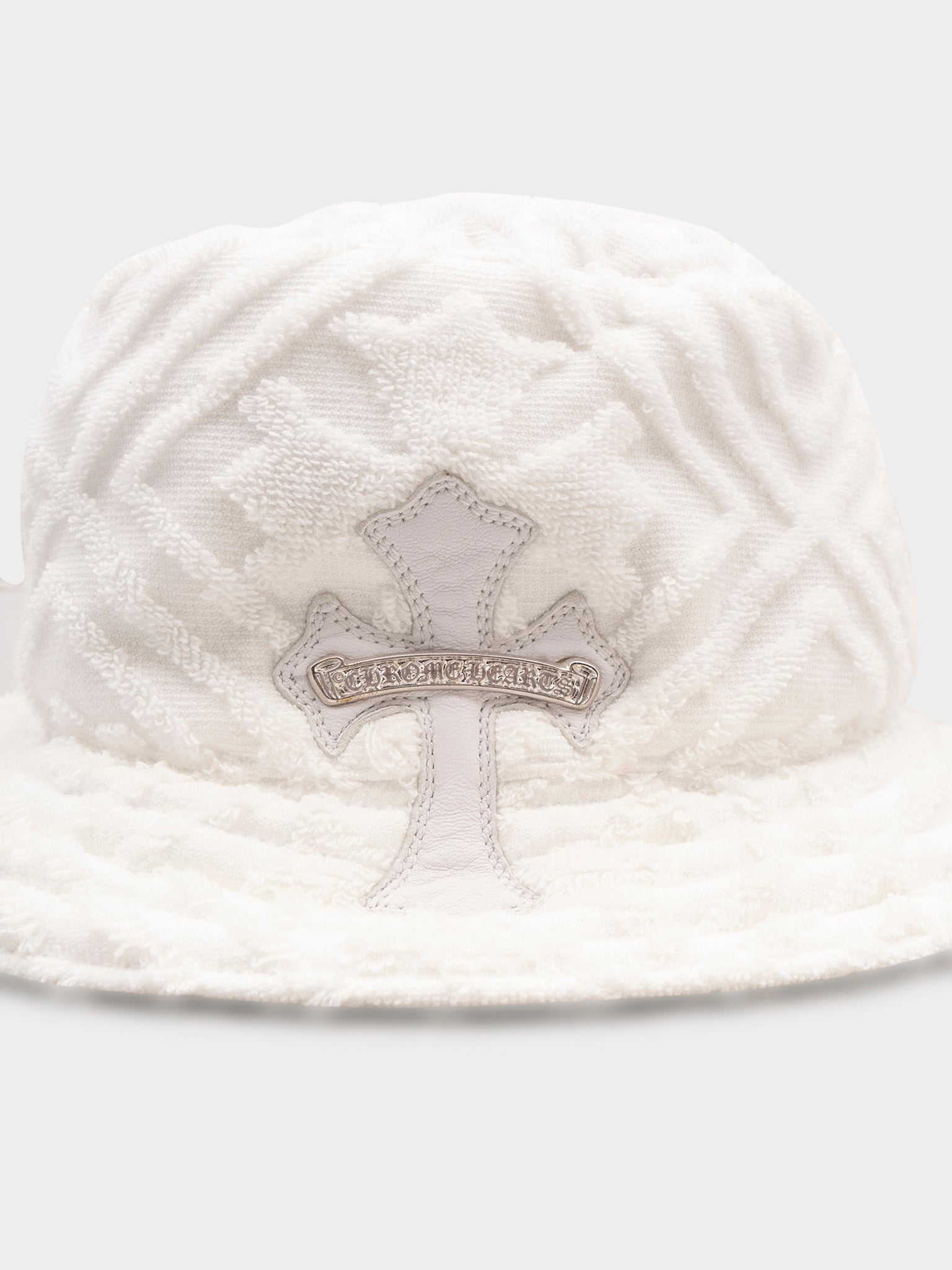 A white Chrome Hearts bucket hat made of a super soft terry cloth that has a leather cross patch