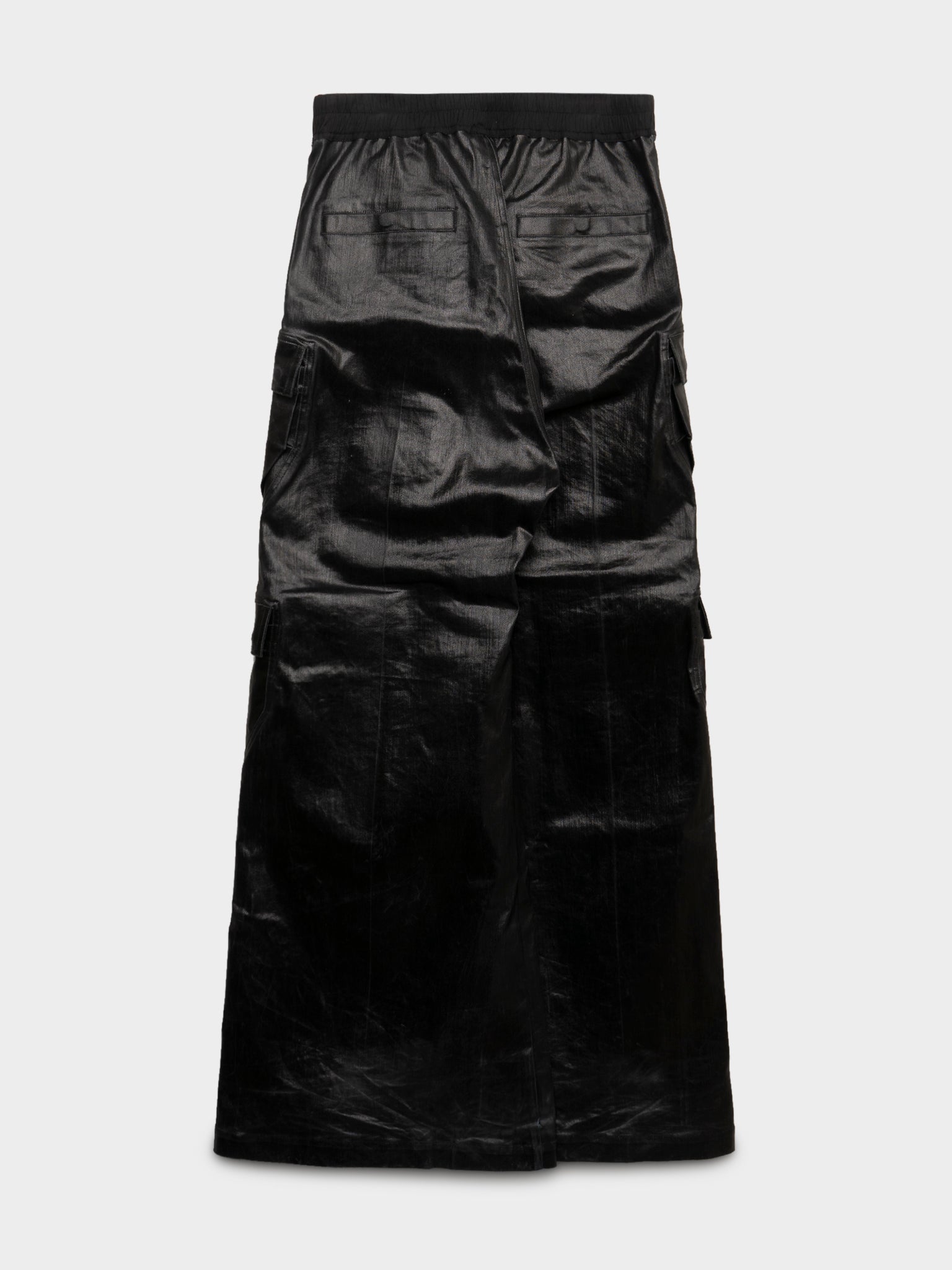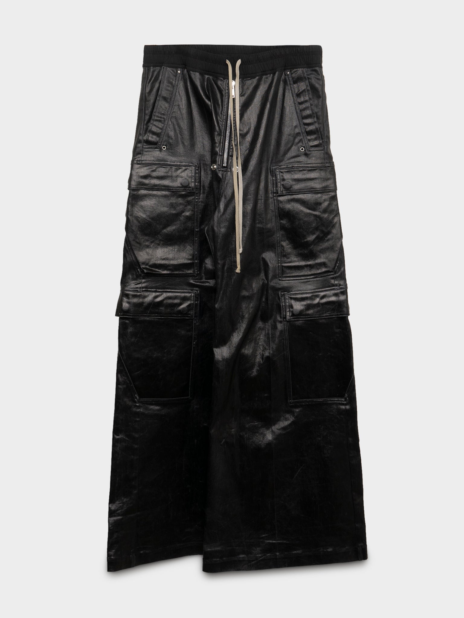 A pair of wide legged Rick Owens Bela cargo pants with a waxed coating that gives them an almost leather-like appearance.