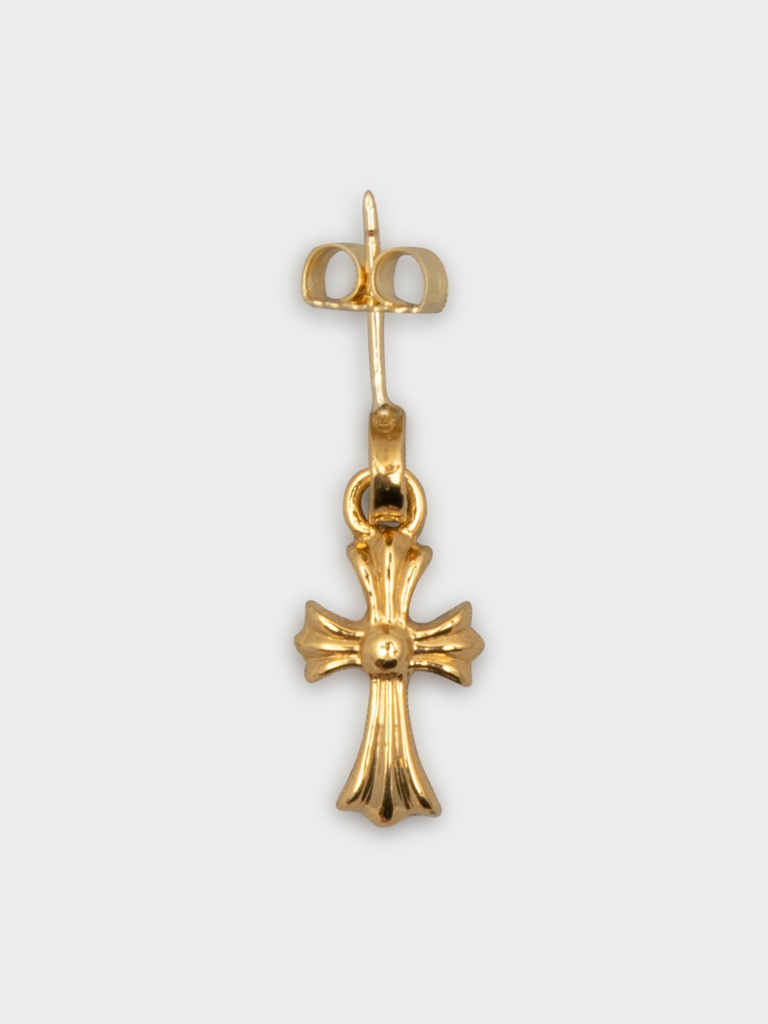 A solid 22k gold Chrome Hearts Baby Fat earring studded fully on one side with bright green emeralds.