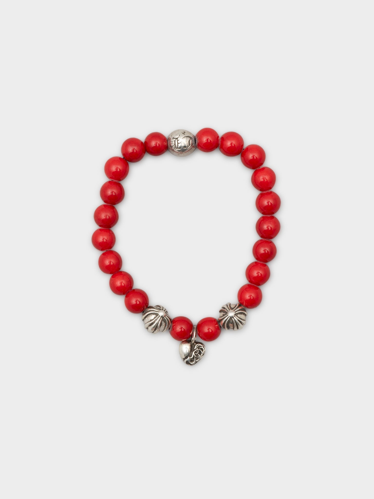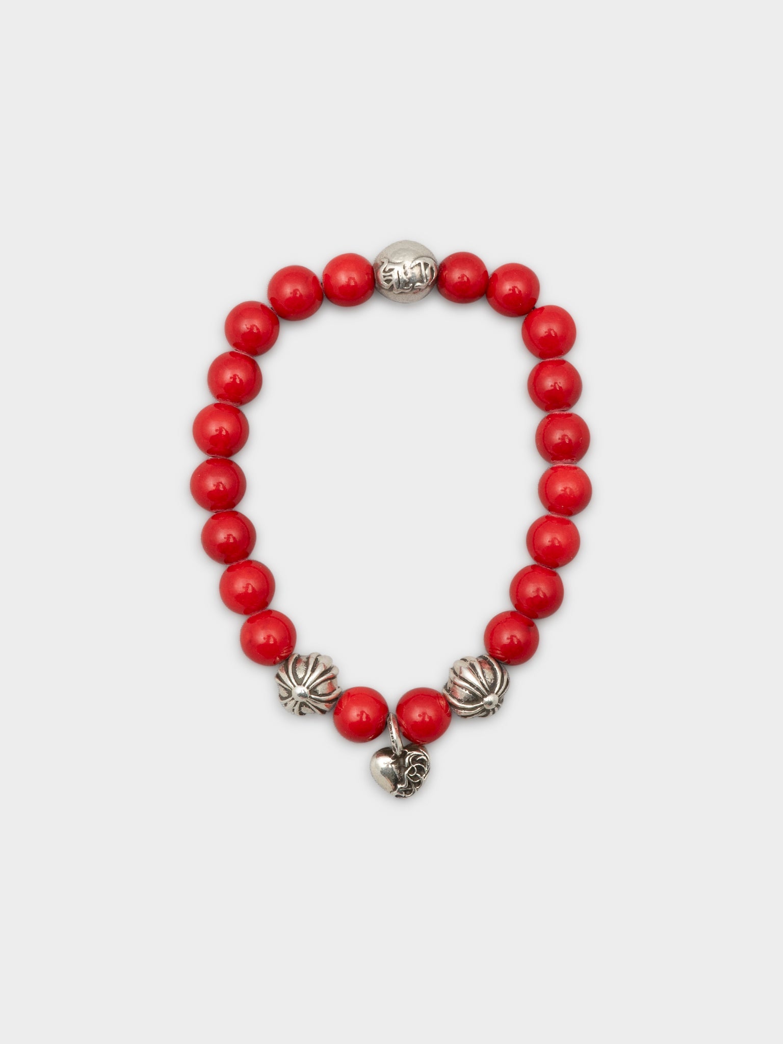 An 8mm red Chrome Hearts beaded bracelet with two sterling silver balls and a silver heart pendant in the center.