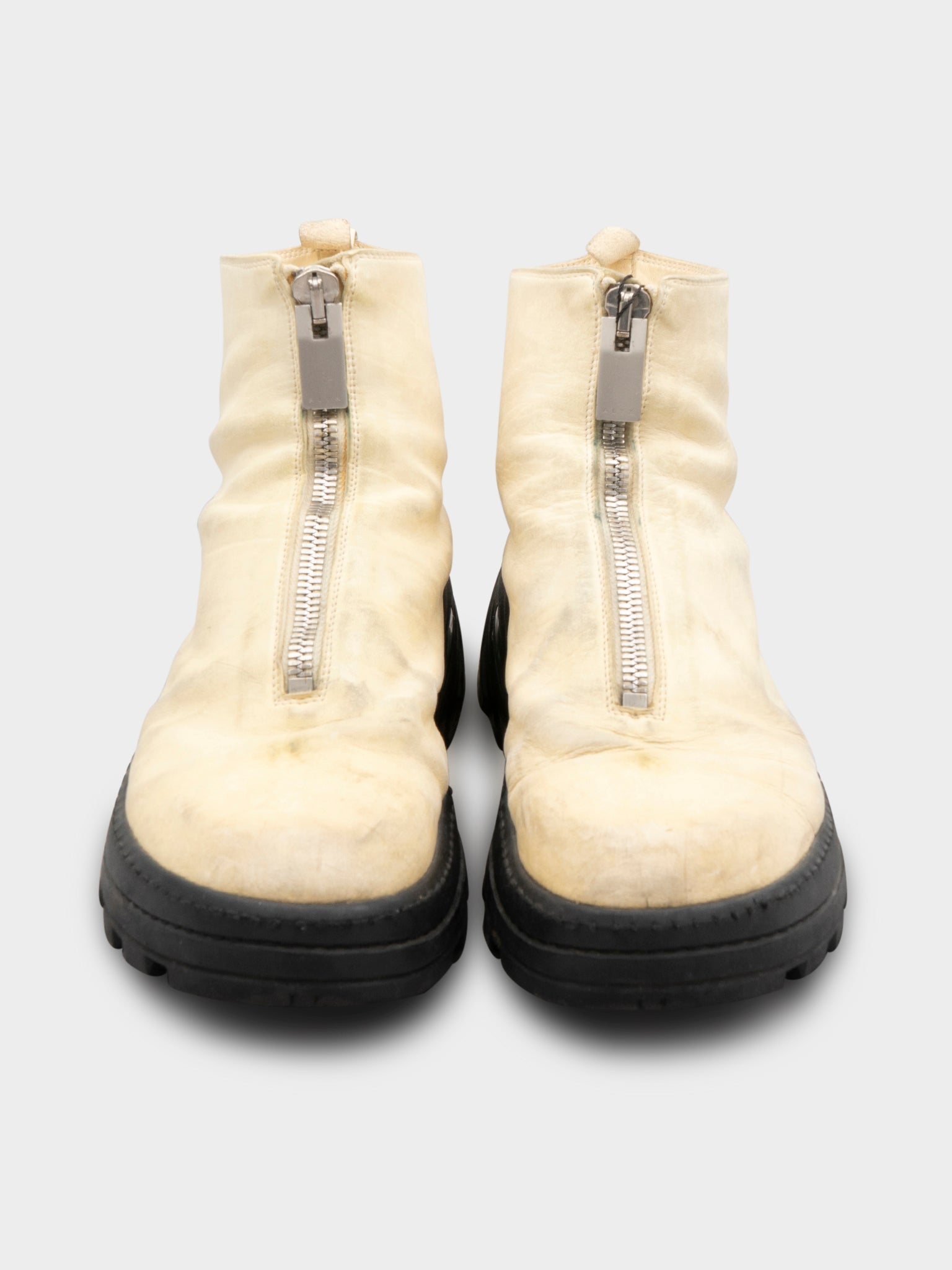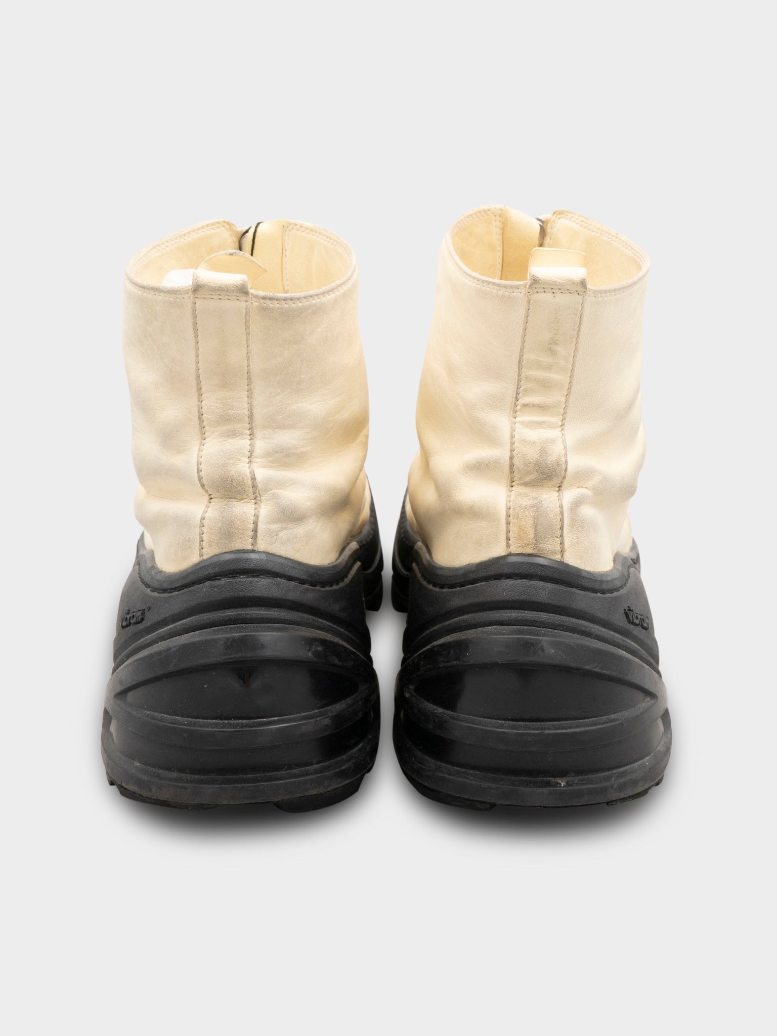 A pair of cream colored front zip boots from Guidi x Alyx with an exclusive rubber sole