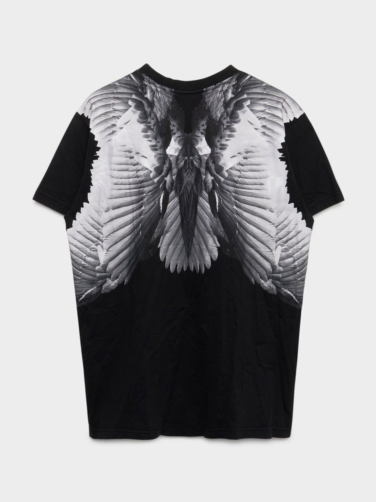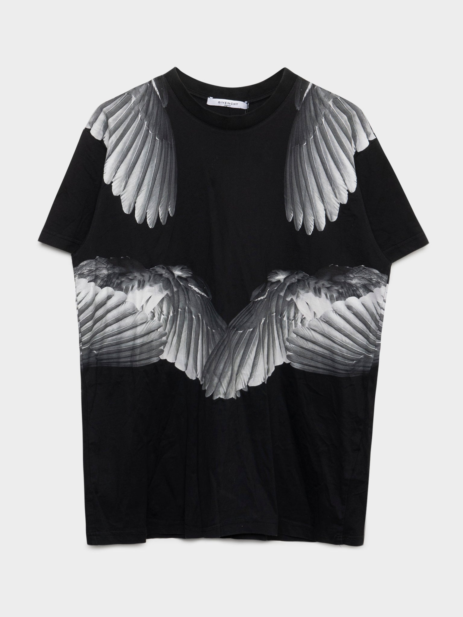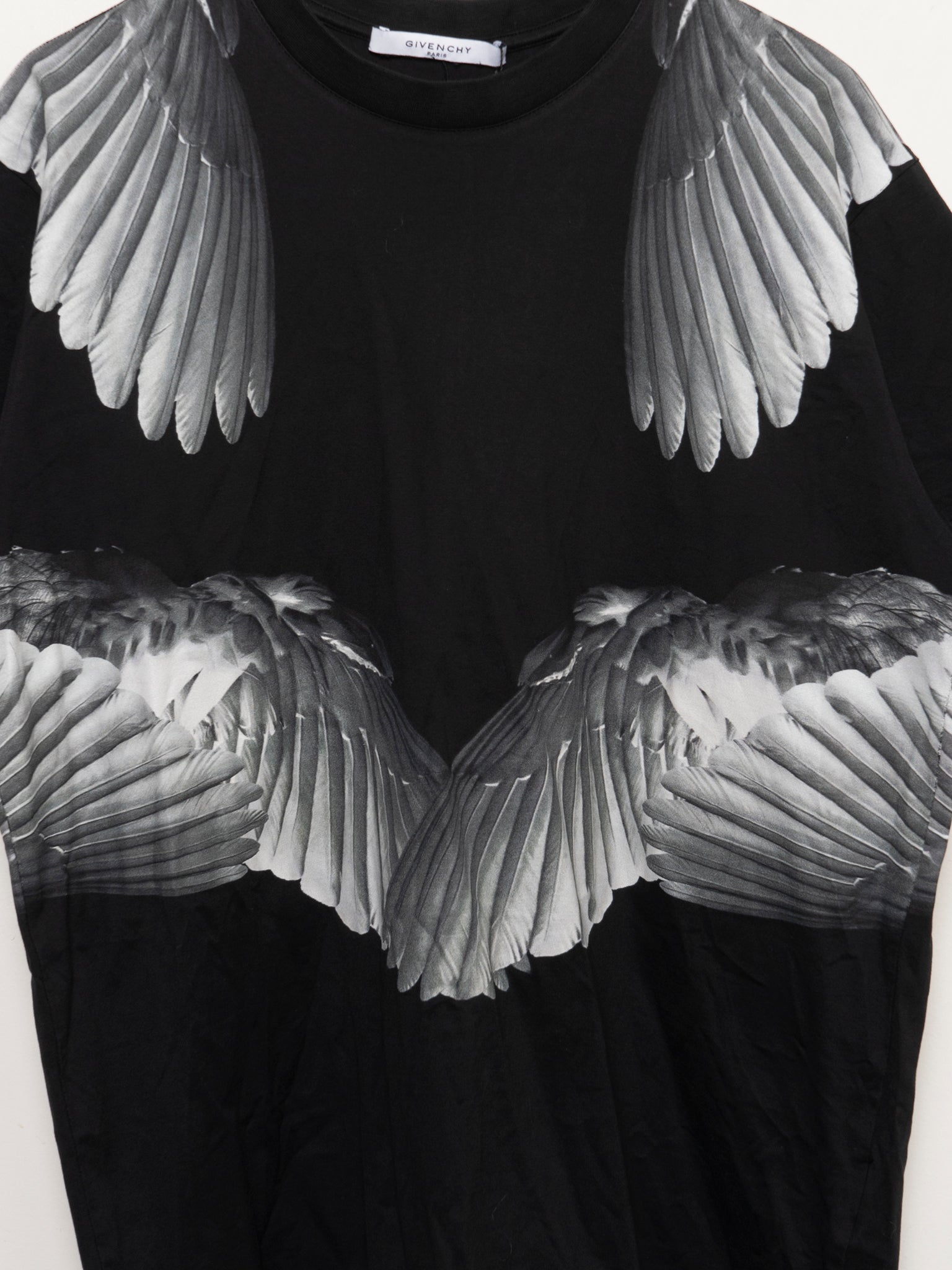 A black Givenchy tee that features large white angel wings down the front and back of the shirt
