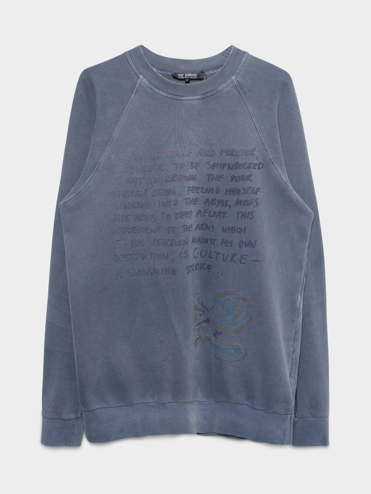 From Raf Simons' AW04 collection 'Waves' comes iconic crewneck sweatshirt with a poem on the front, a must have for any Raf collector