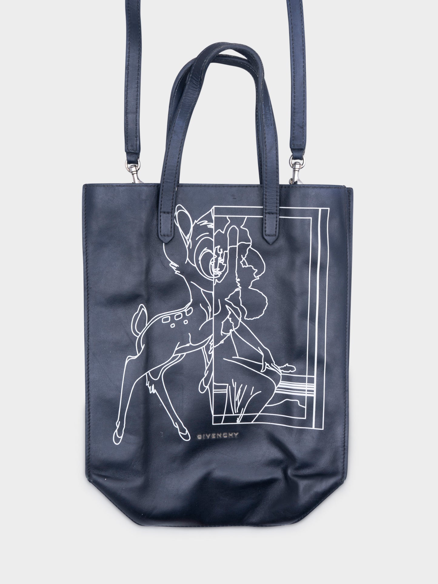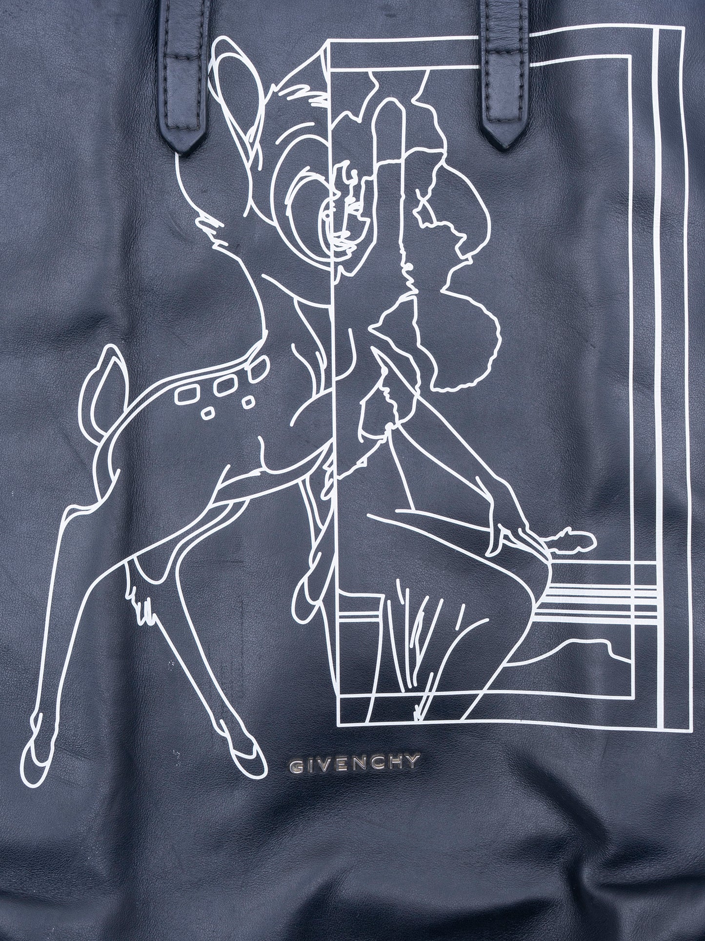 A black leather tote bag from Givenchy with an abstract design of Bambi the deer.