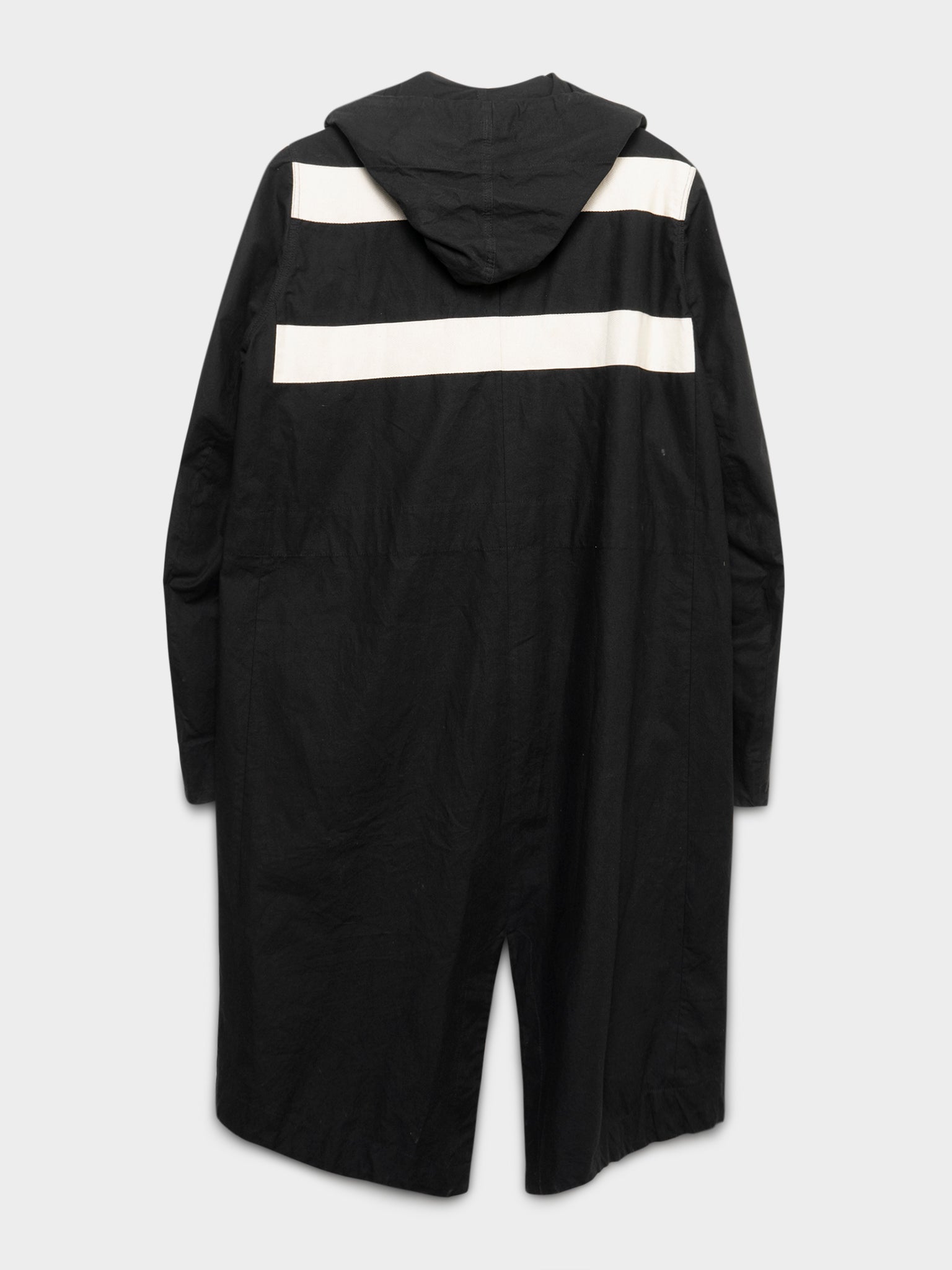 A Rick Owens fishtail parka with cinched waist belt and cream stripes by the chest