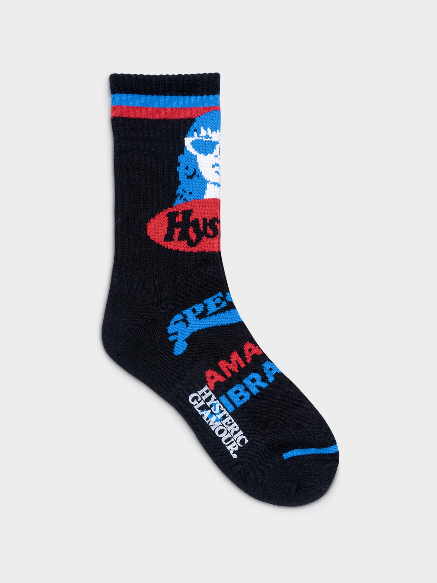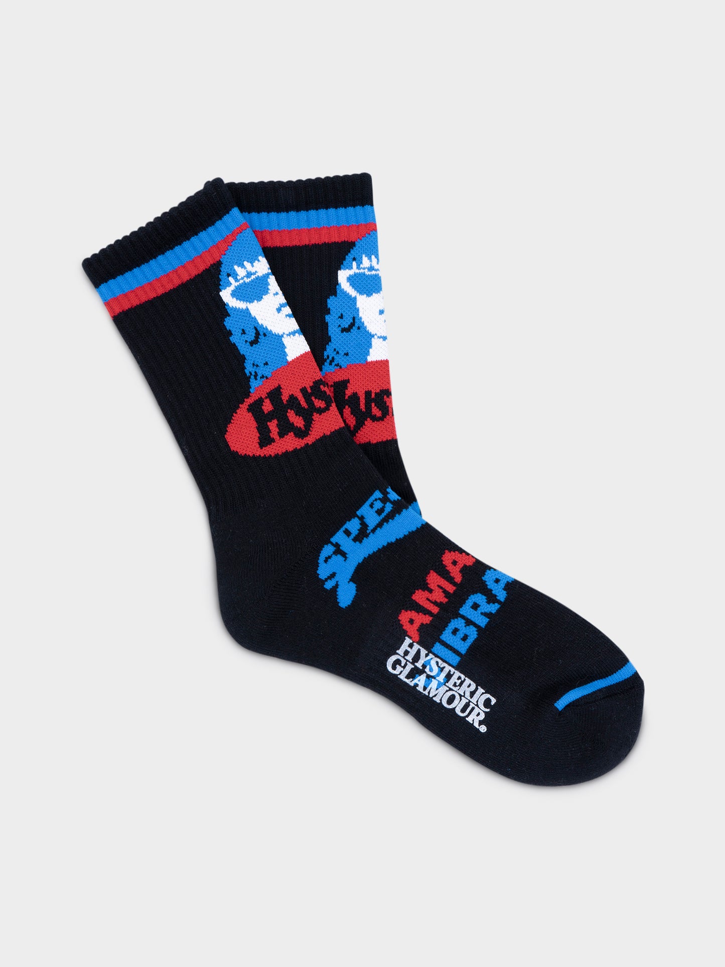 Black Hysteric Glamour socks with bright blue and red graphics.