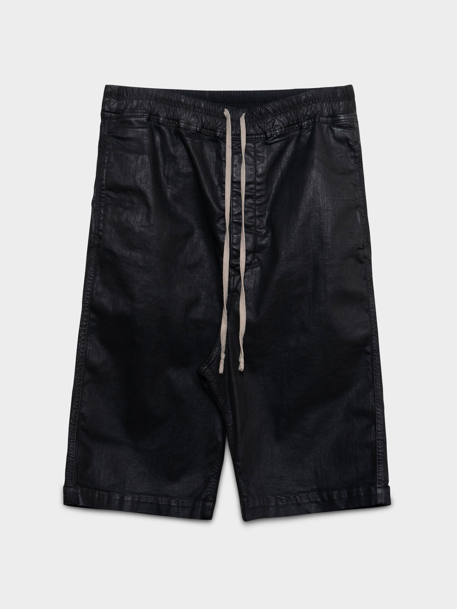 A pair of baggy black Rick Owens pod shorts with a wax finish.