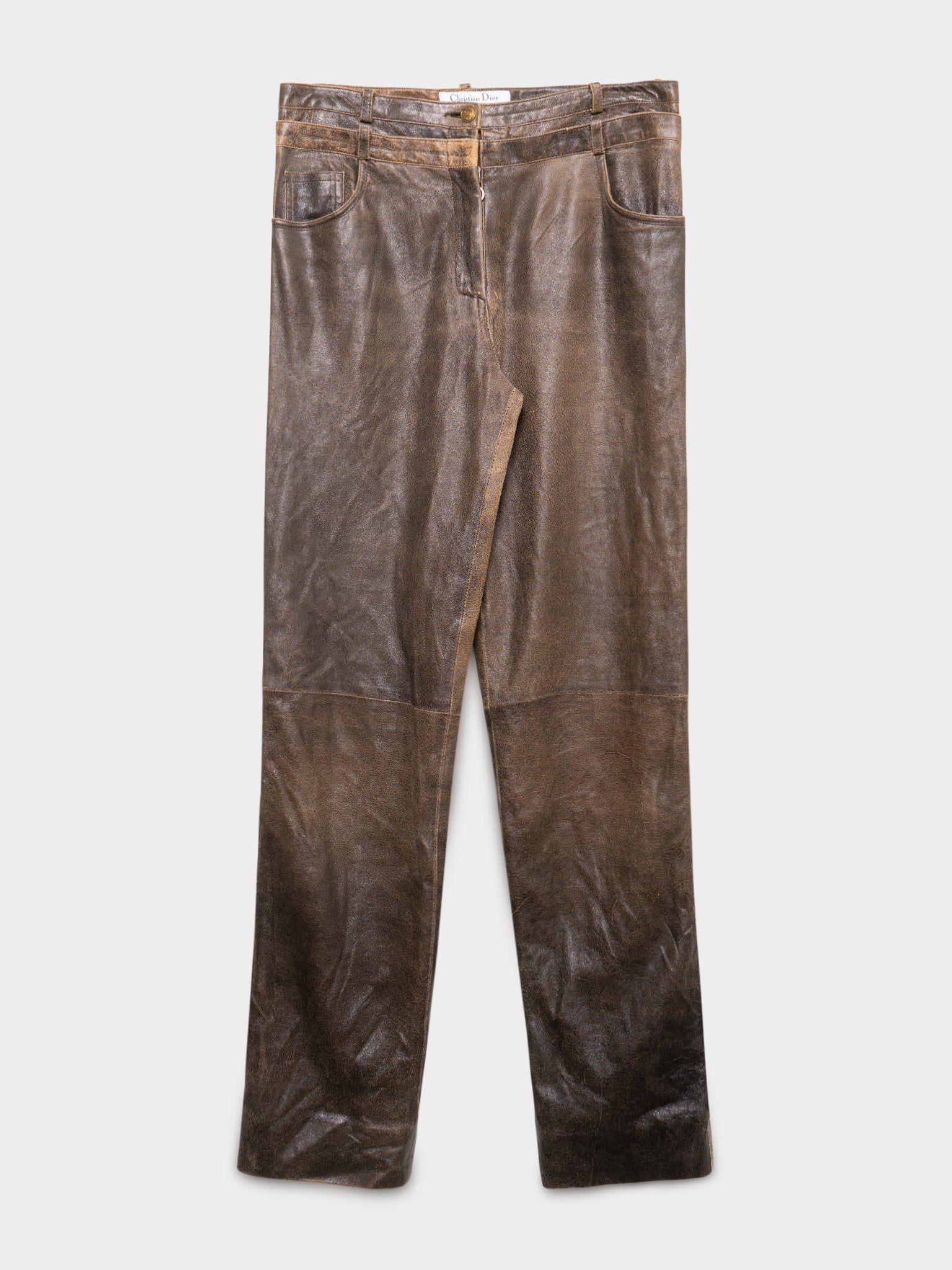 A pair of brown blistered leather pants from Christian Dior with knee paneling