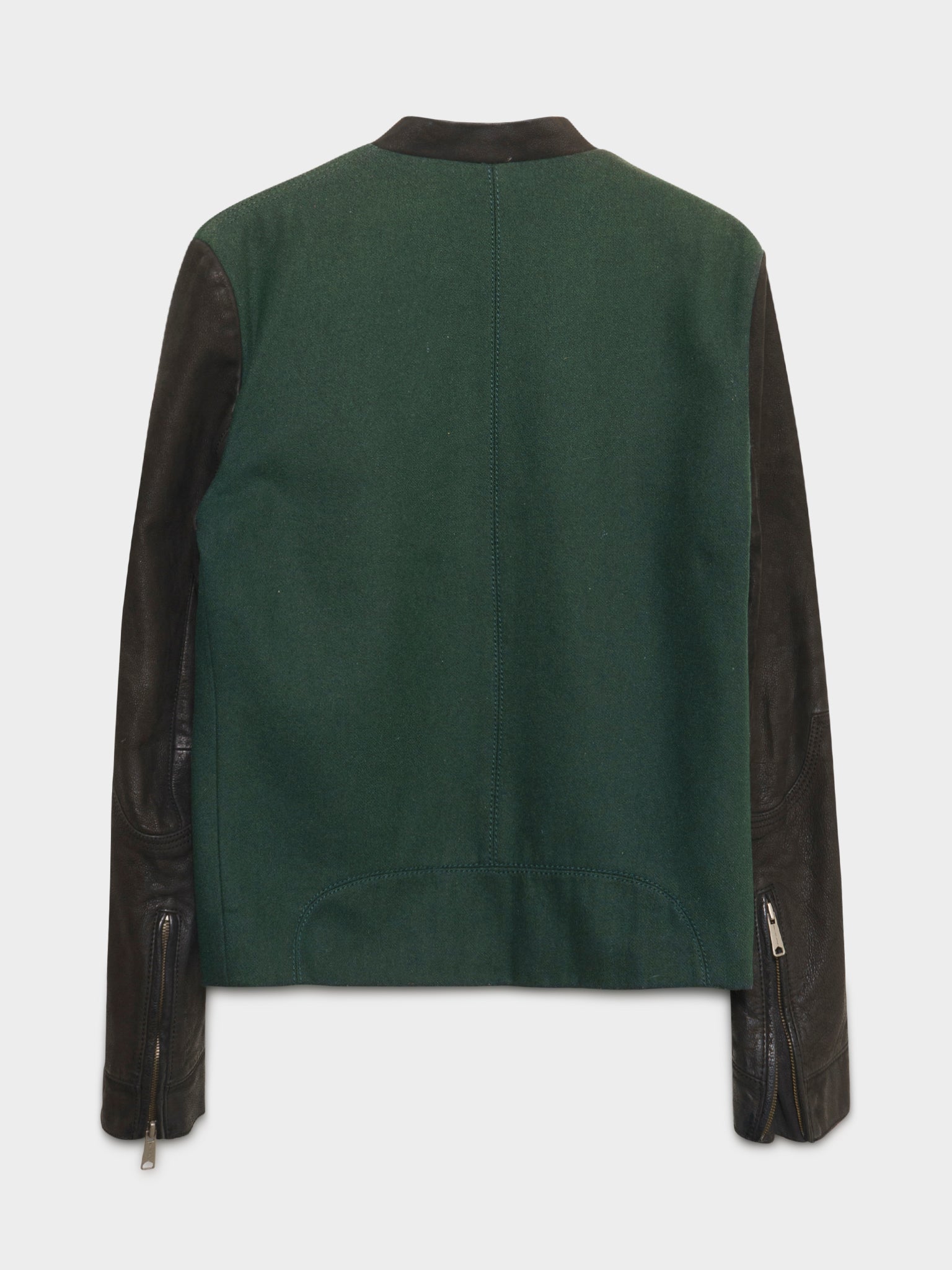 A green wool Balenciaga varsity jacket with blistered leather sleeves.