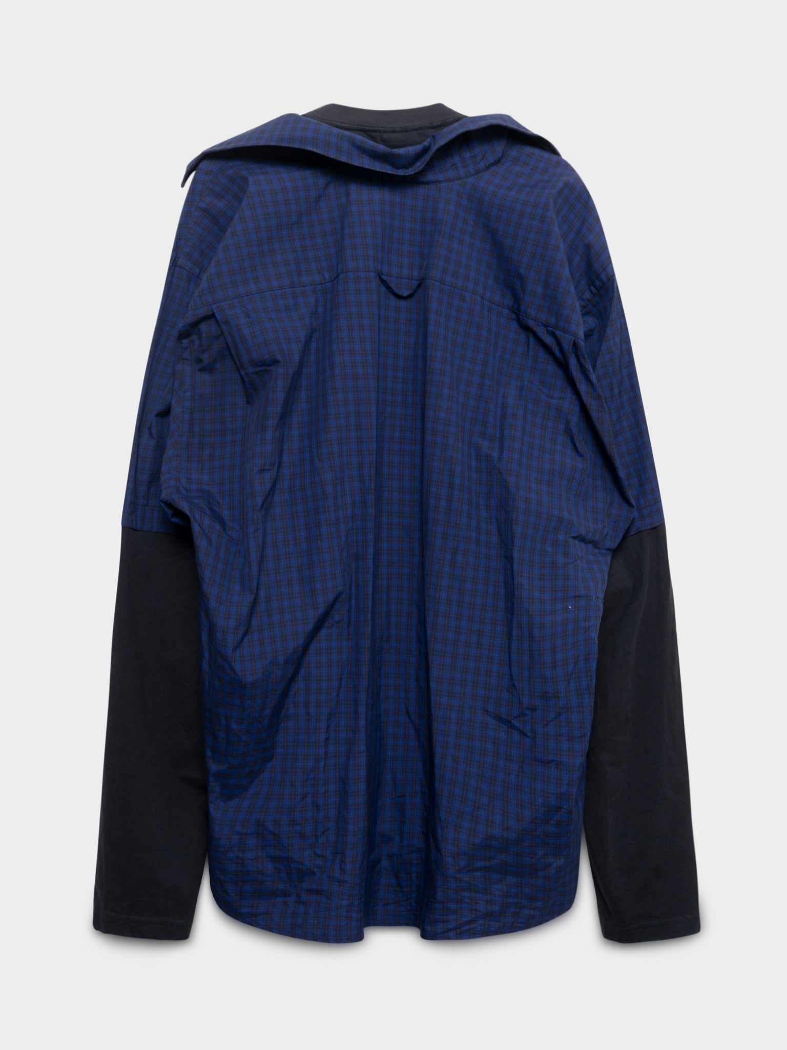 An oversized shirt from Balenciaga that is half regular longsleeve with a blue checkered button up stitched in.