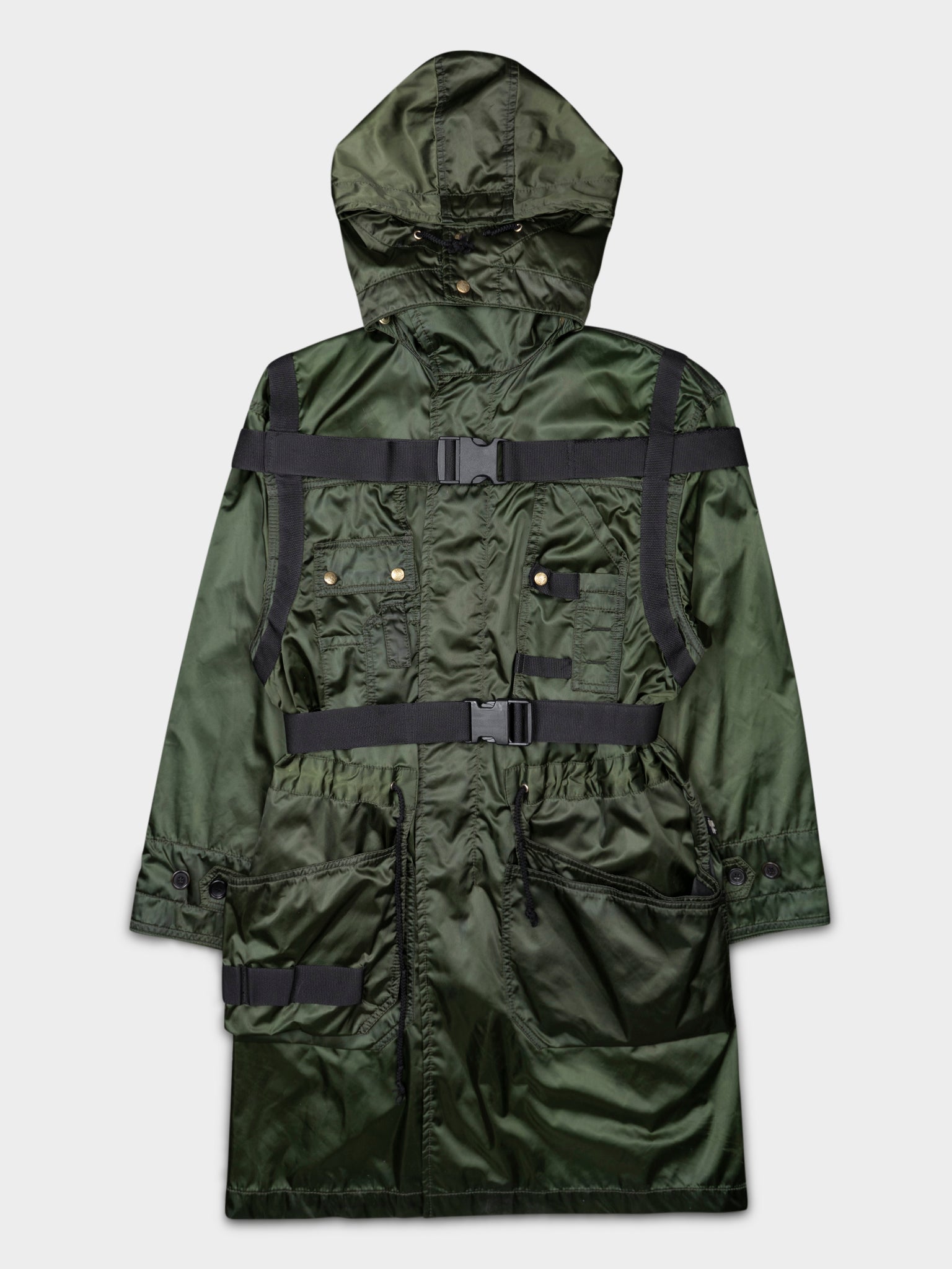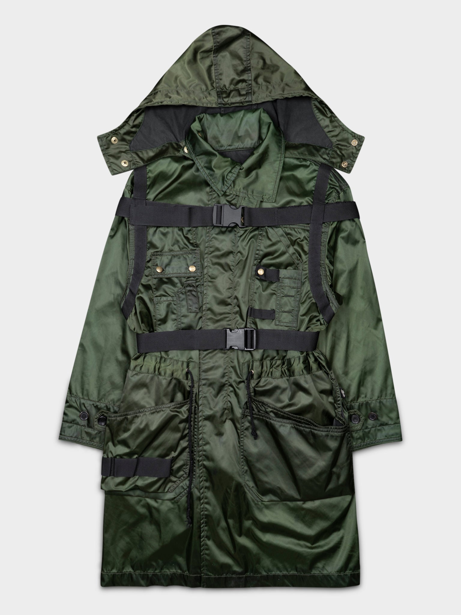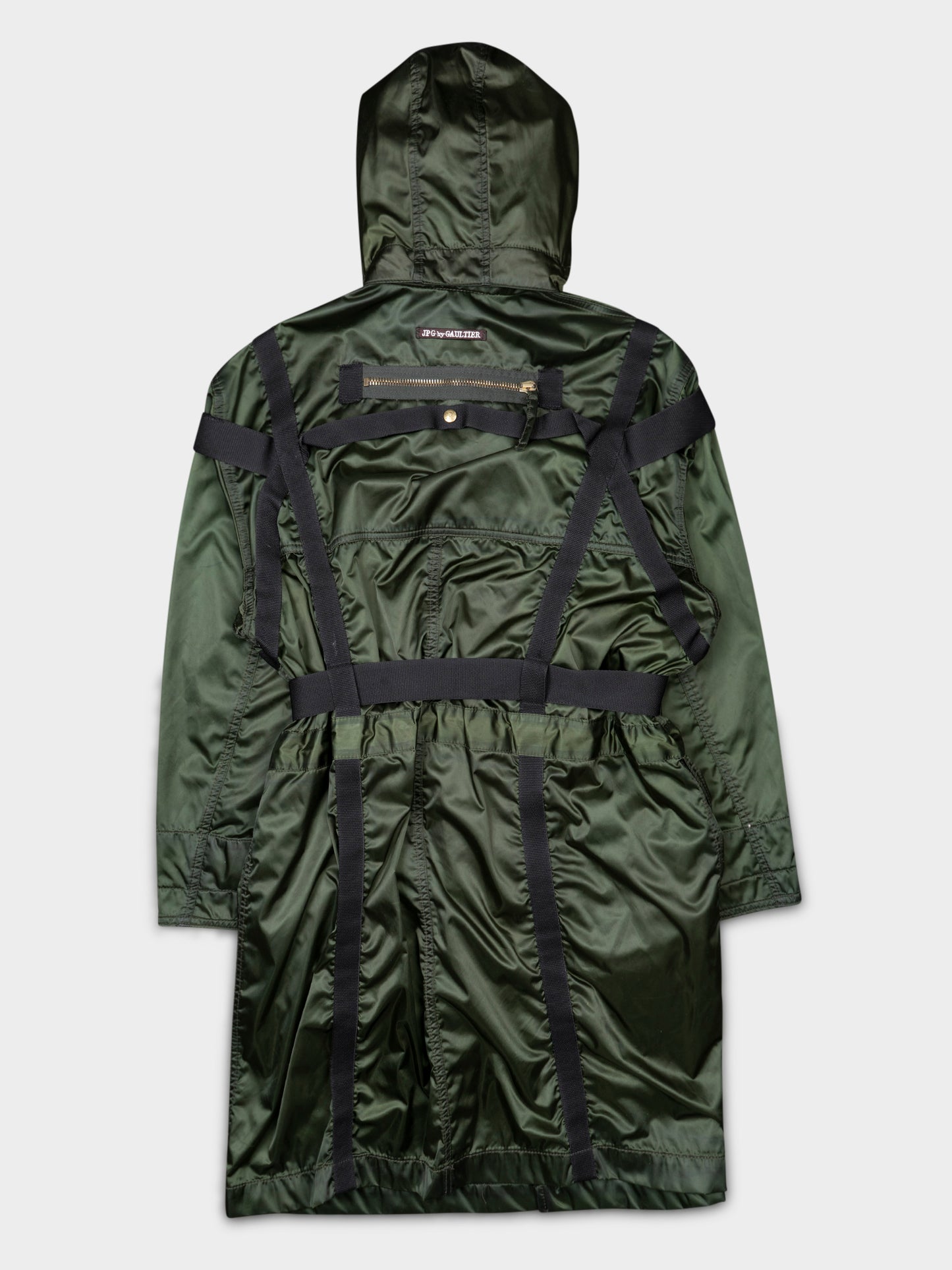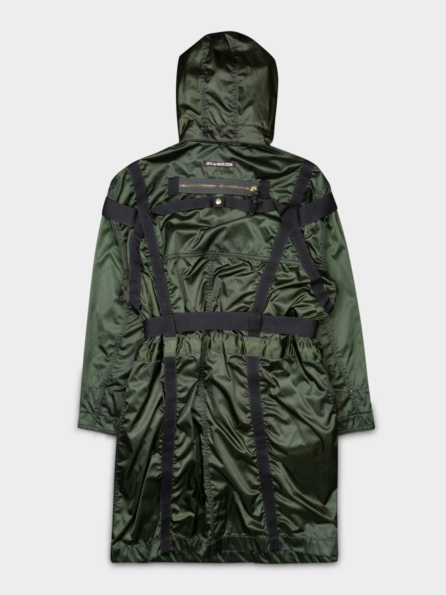 A deep green parka from Jean Paul Gaultier covered in bondage straps and metal pocket detailing.
