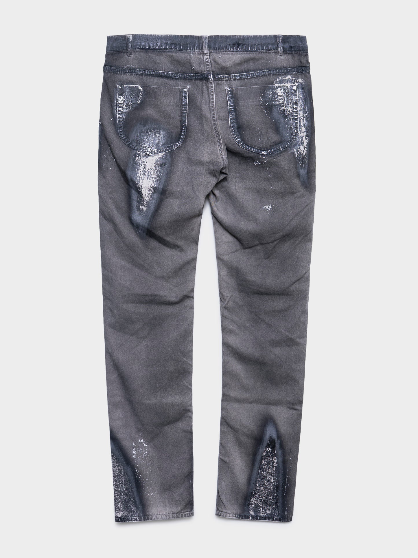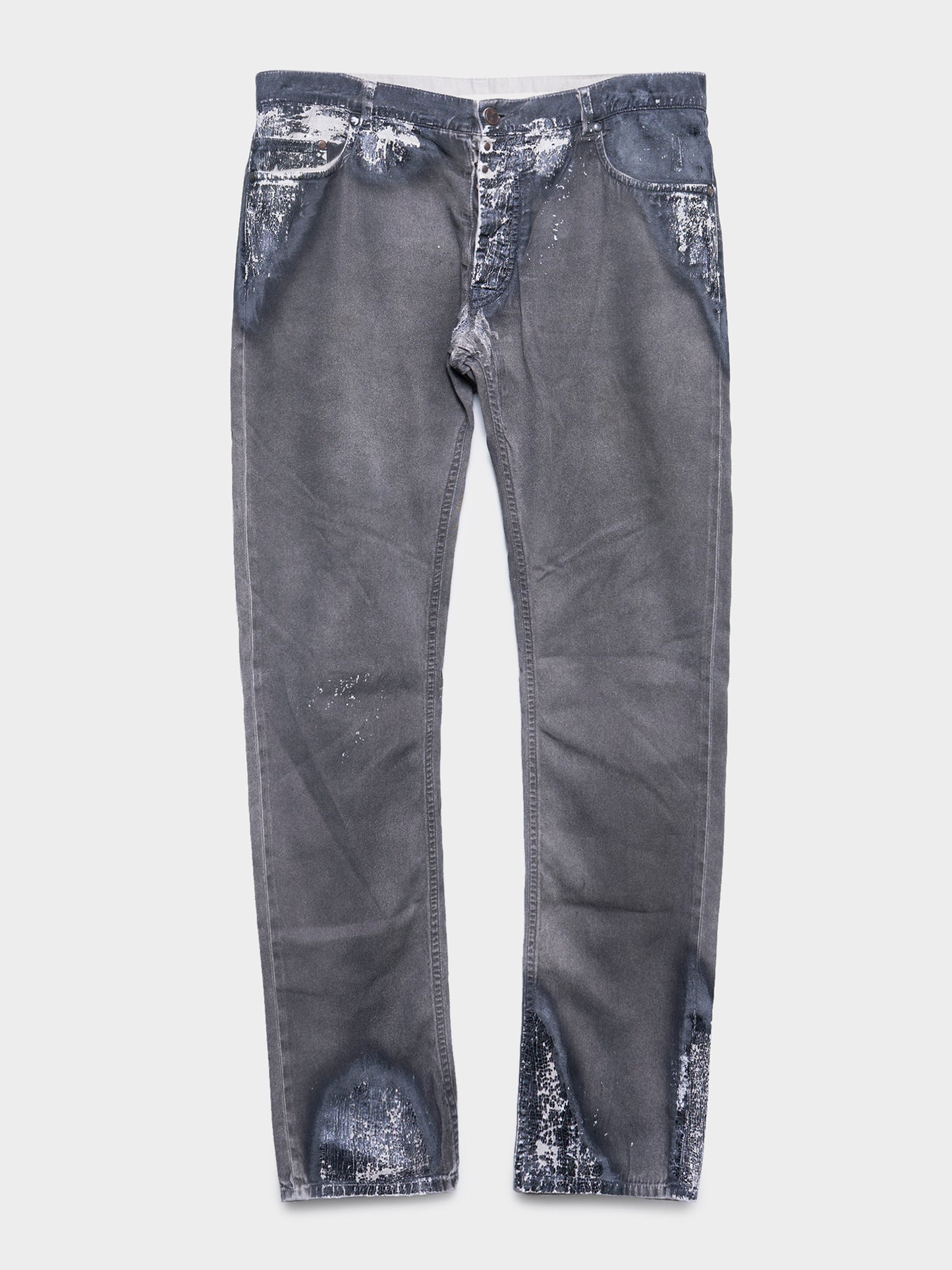 A pair of Maison Margiela jeans with a unique "burn" effect that makes them look singed, with paint splatters throughout