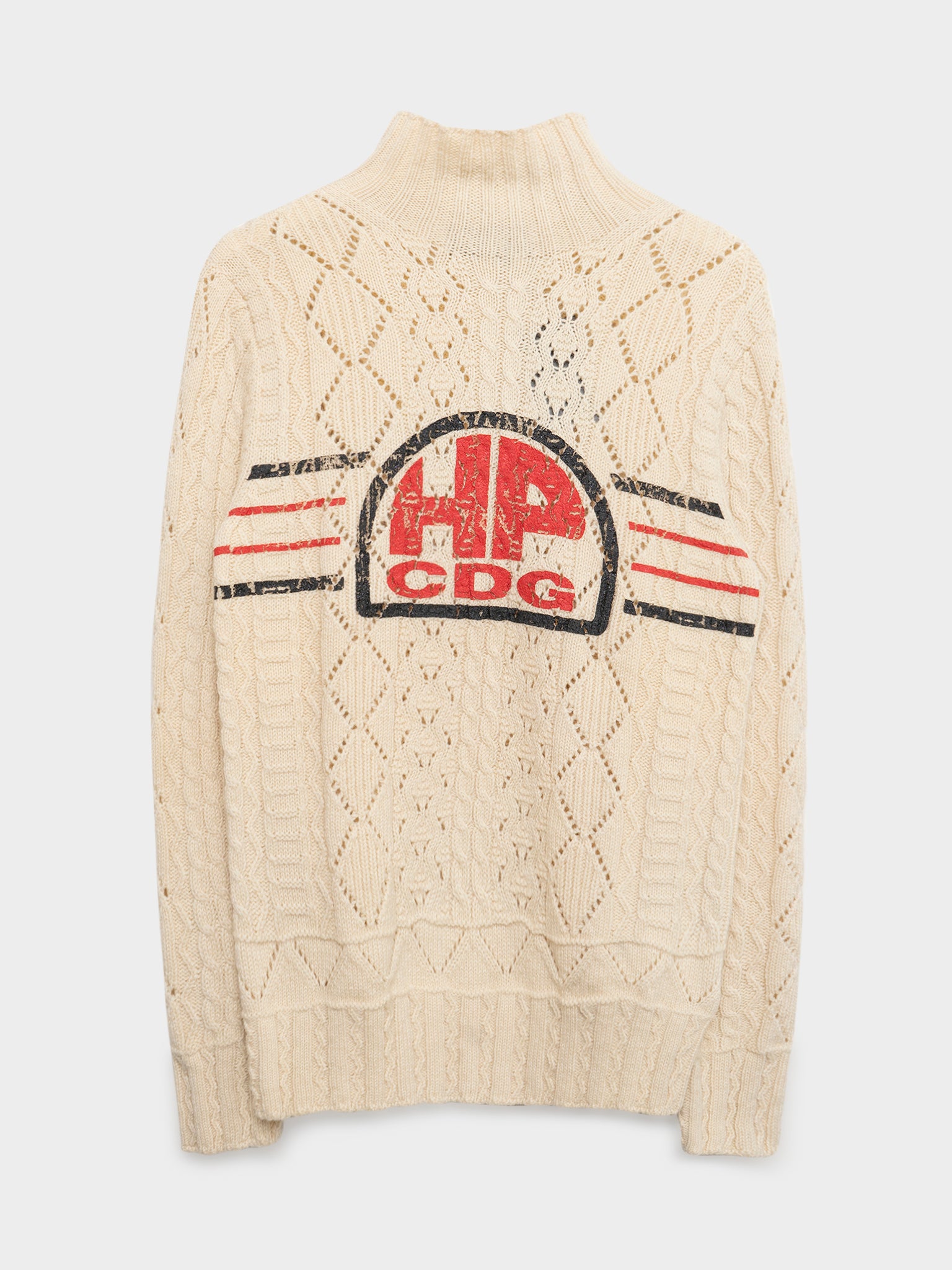 A cozy cream colored cable knit sweater from Comme Des Garcons with red CDG lettering on the garment