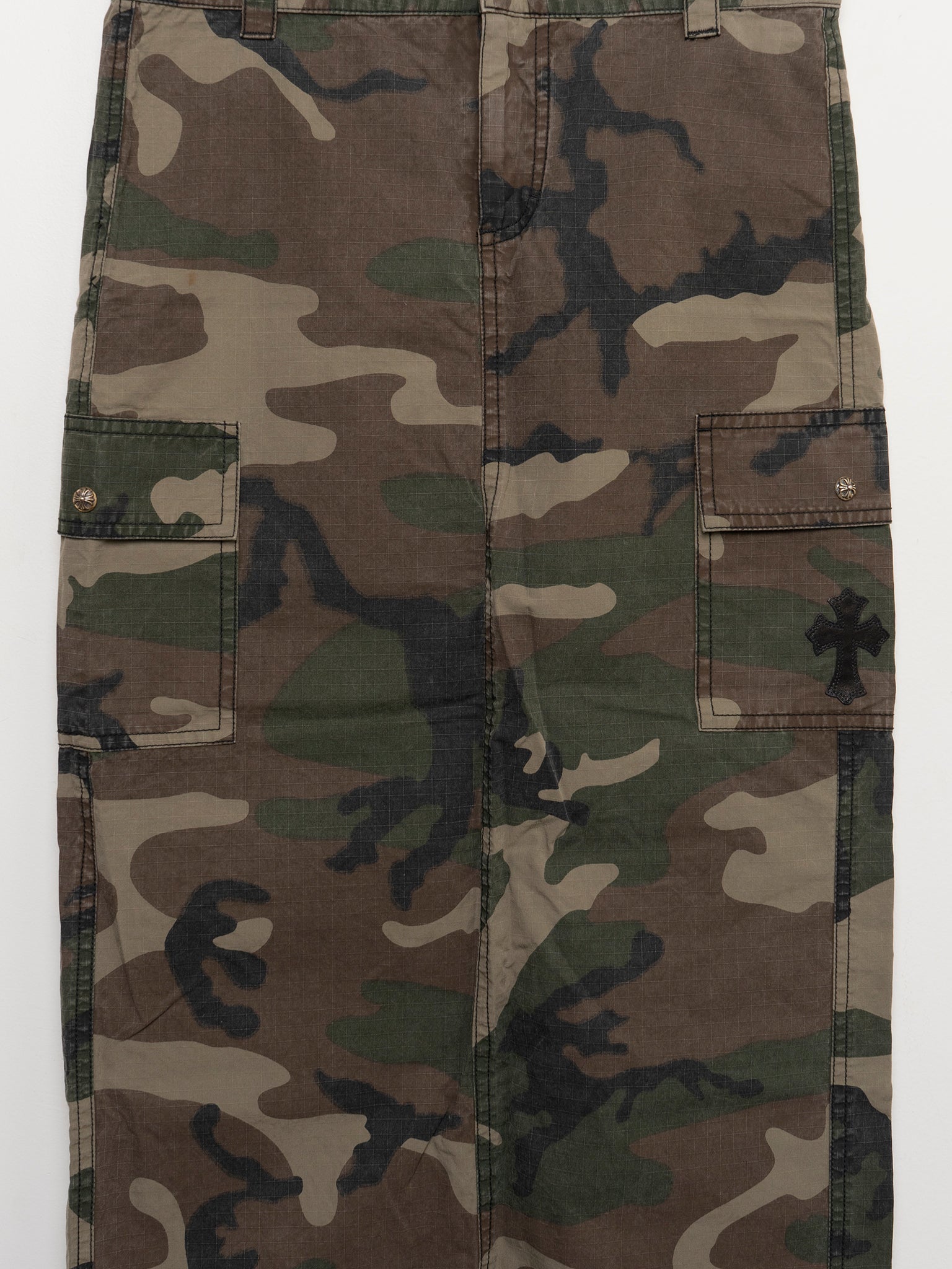 A mid length Chrome Hearts camo skirt with sterling silver hardware on flap pockets