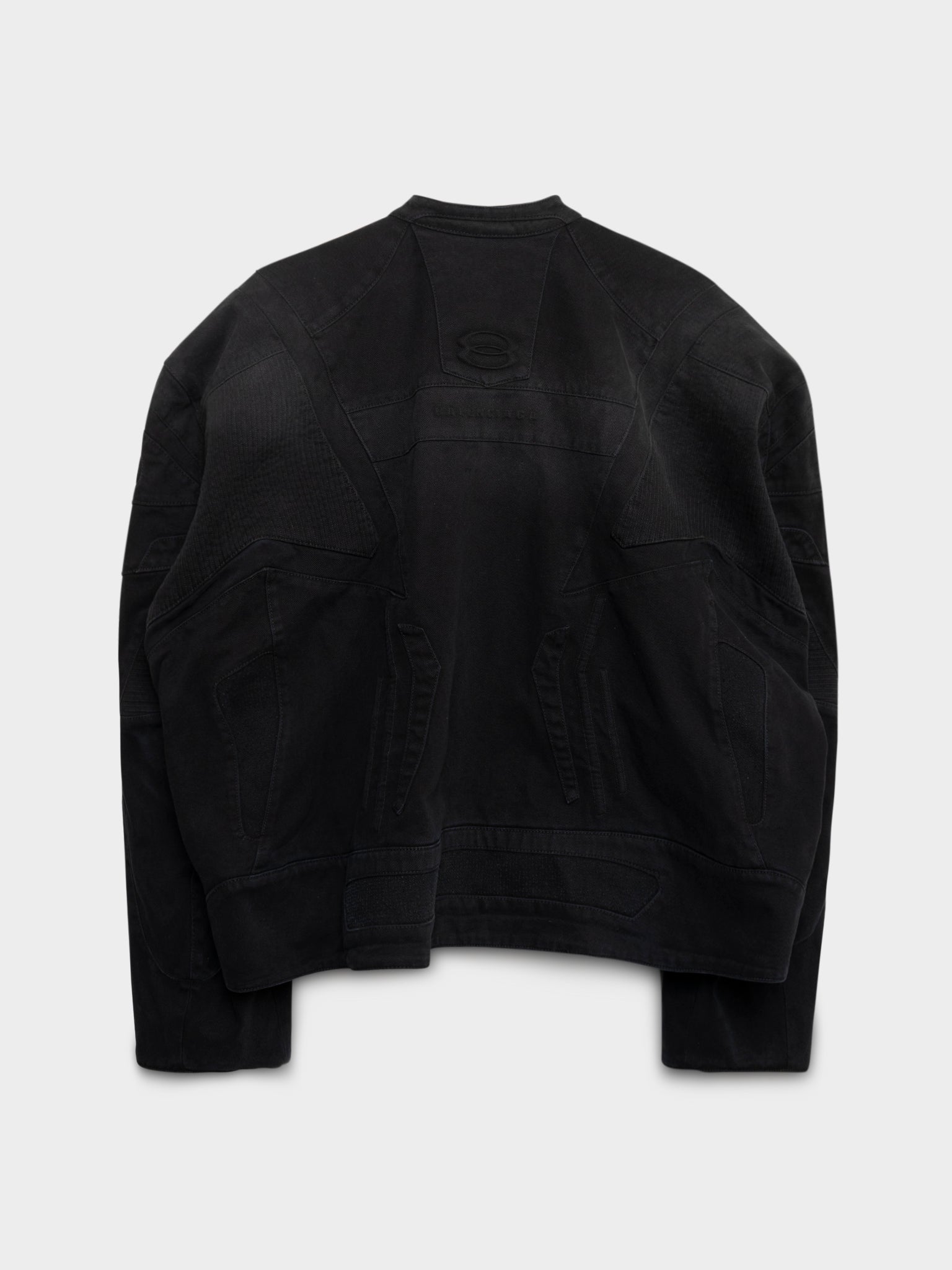 An oversized, heavyweight racing style moto jacket from Balenciaga with their large infinity logo on the chest and snap collar closure