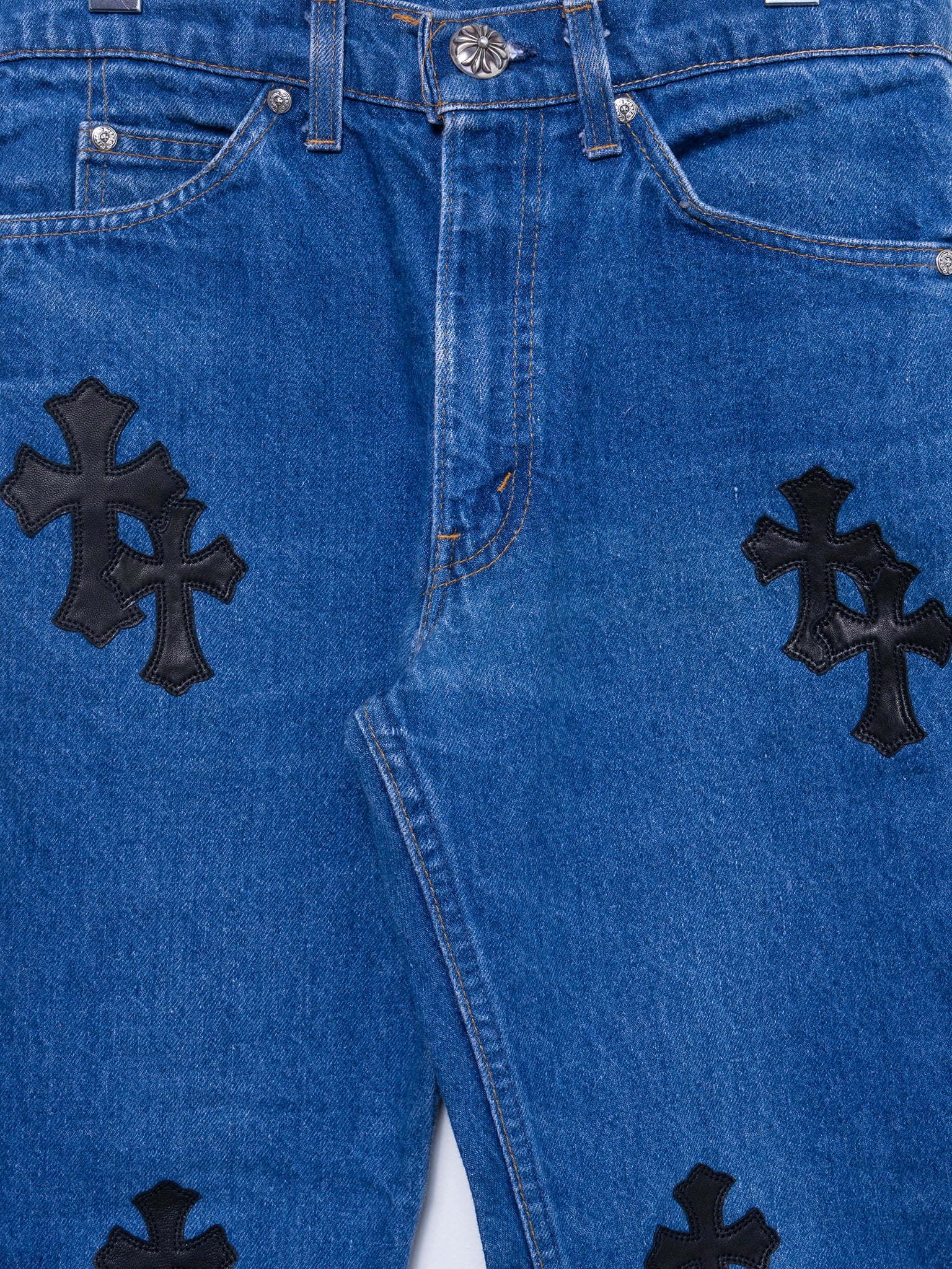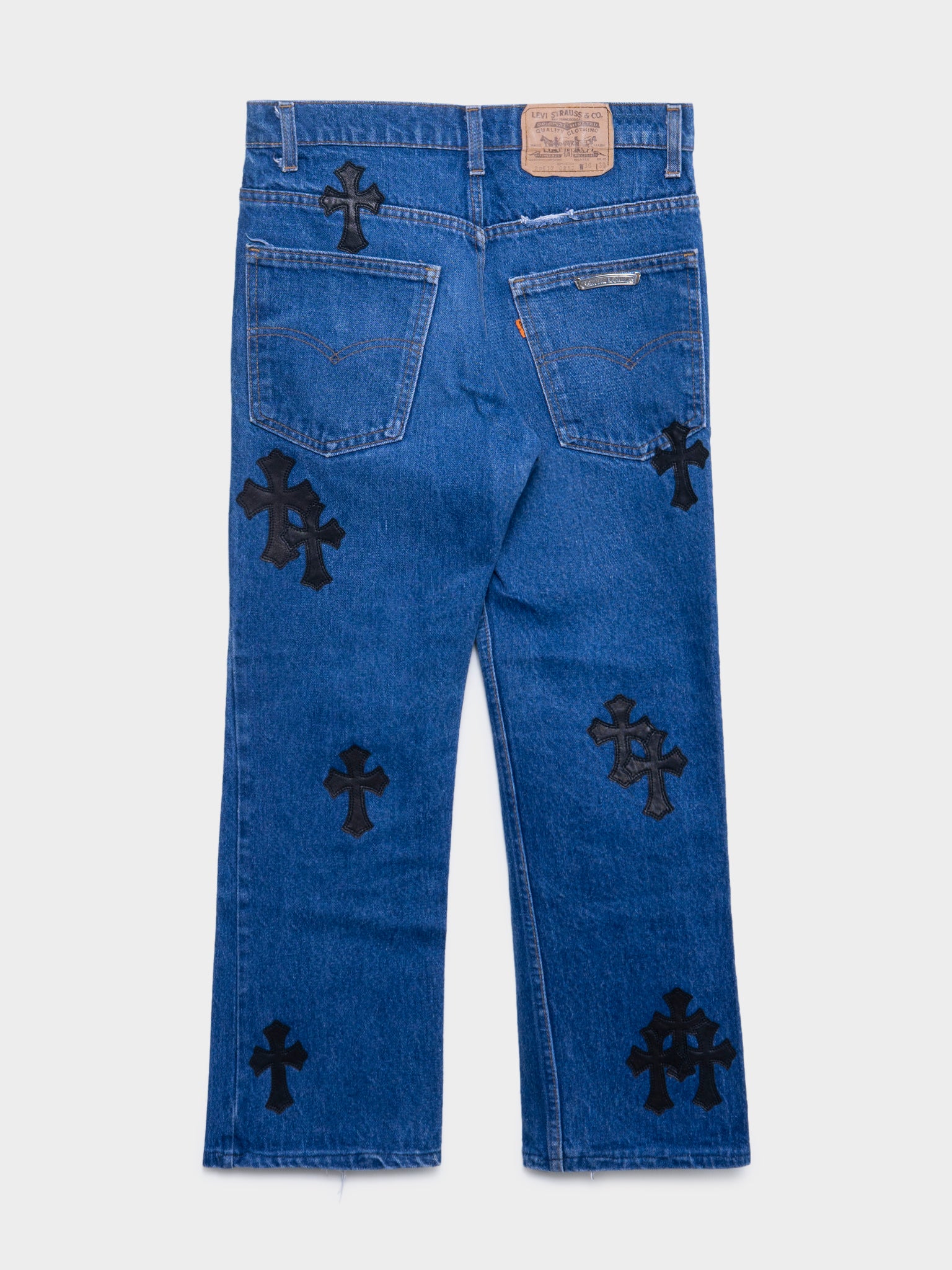 A pair of vintage straight legged Levi's orange tab jeans given the full Chrome Hearts makeover including leather cross patches and sterling silver hardware