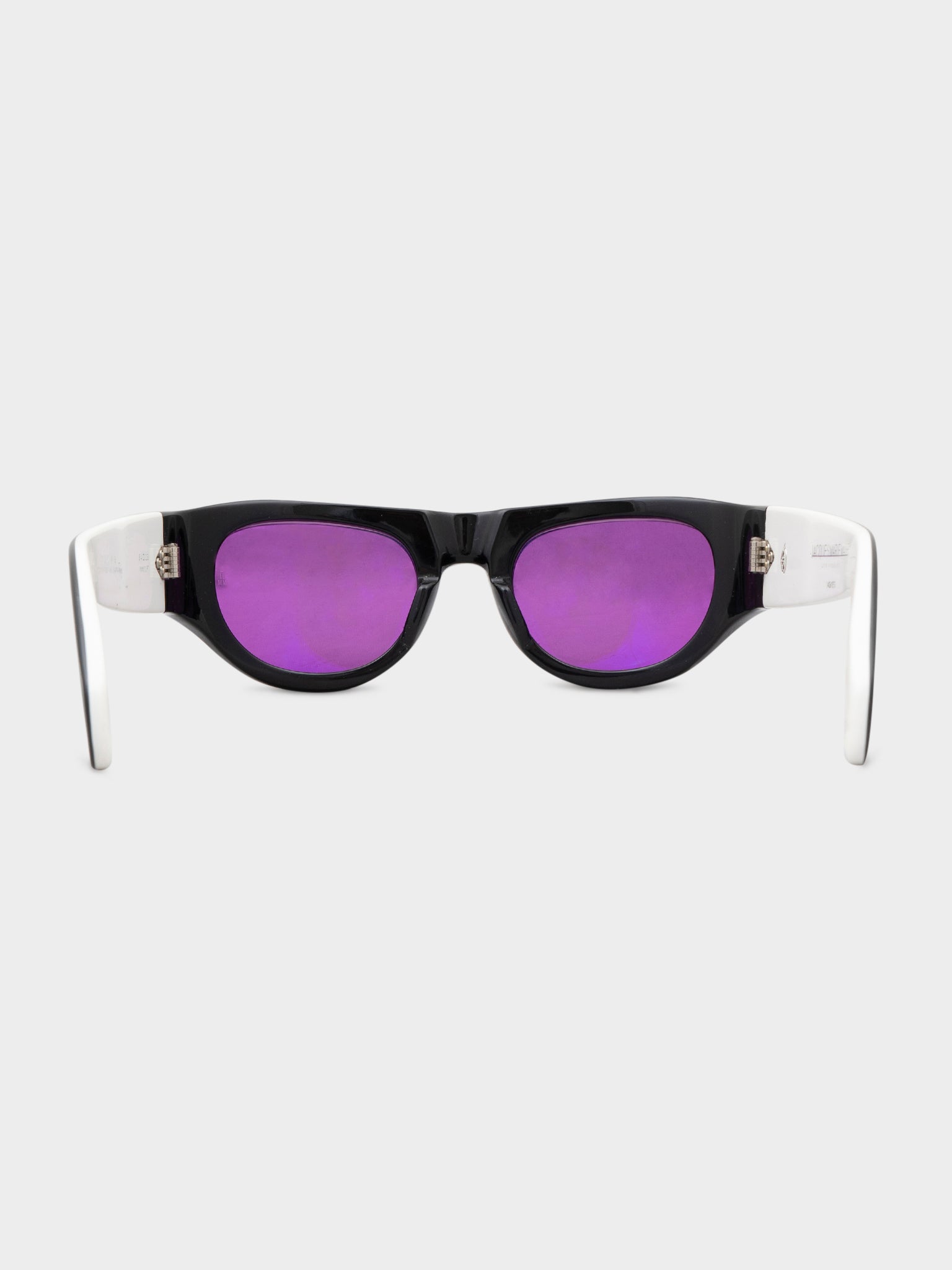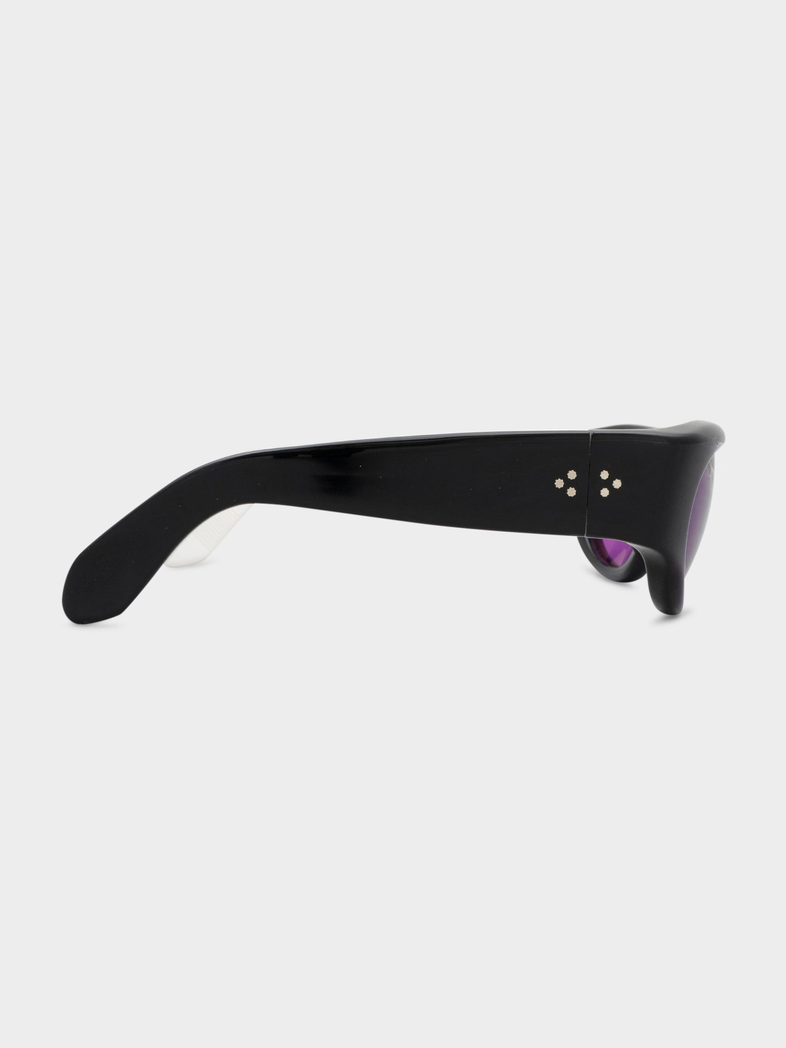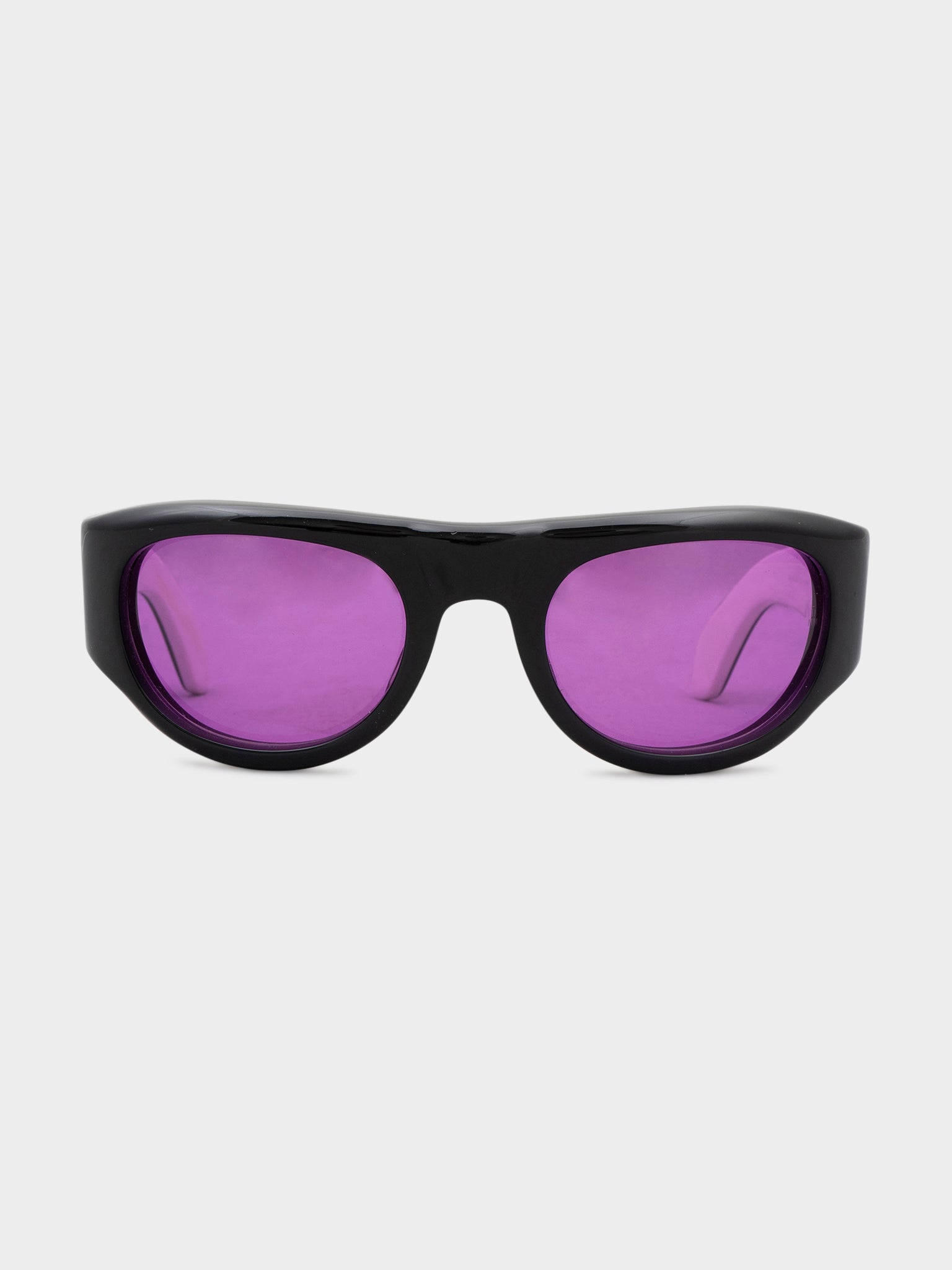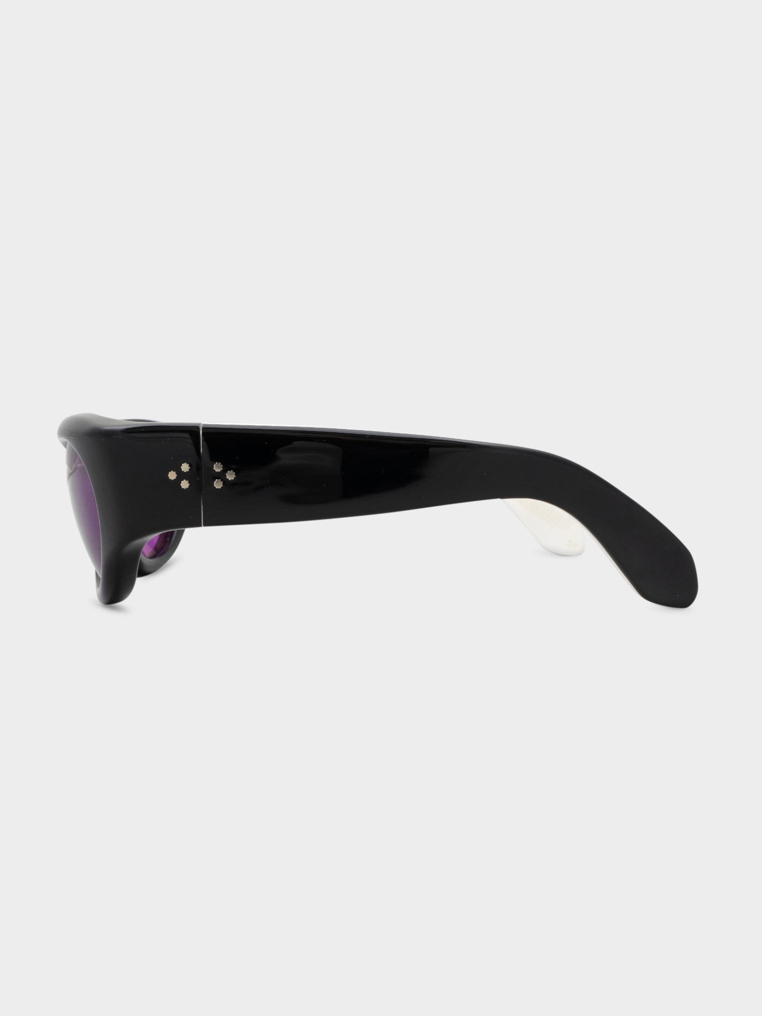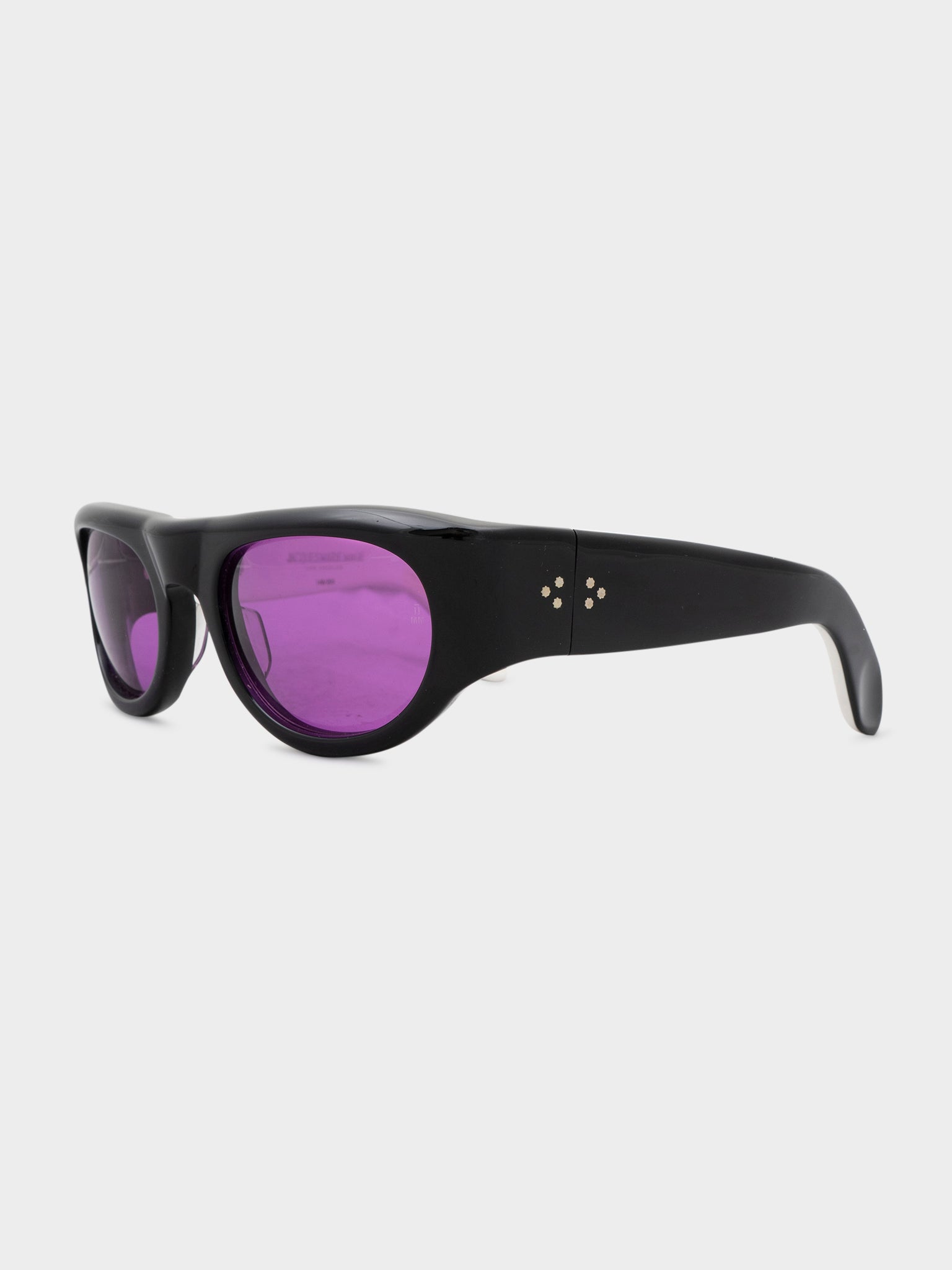 A pair of black Jacques Marie Mage Clyde sunglasses with purple tinted lenses