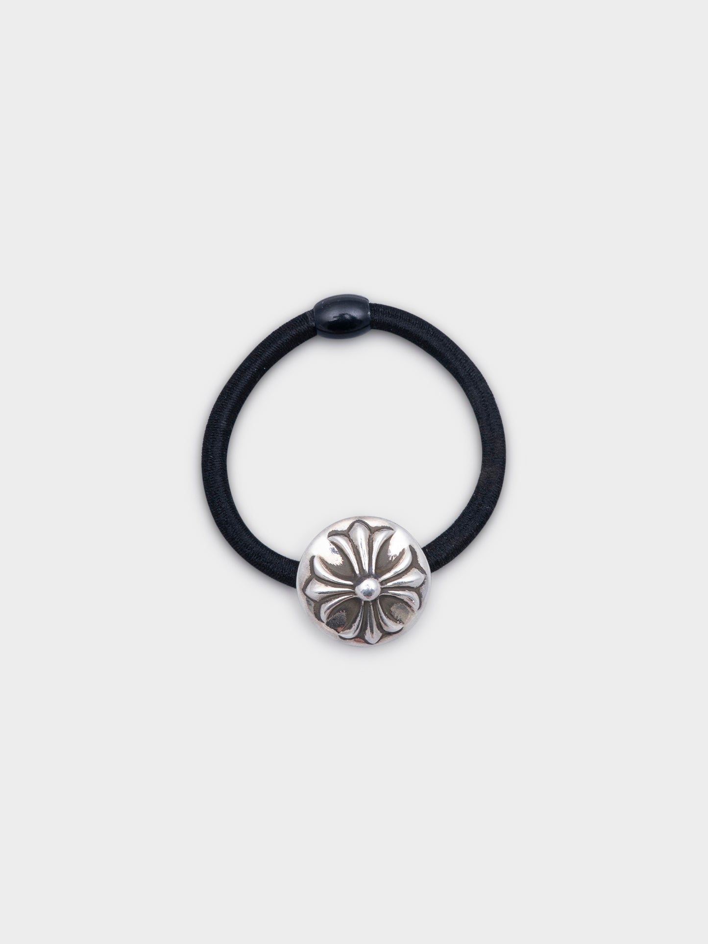 A Chrome Hearts black elastic hair tie with sterling silver cross ball charm