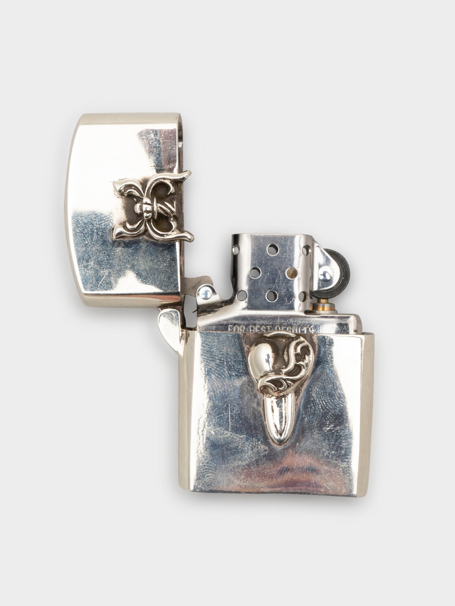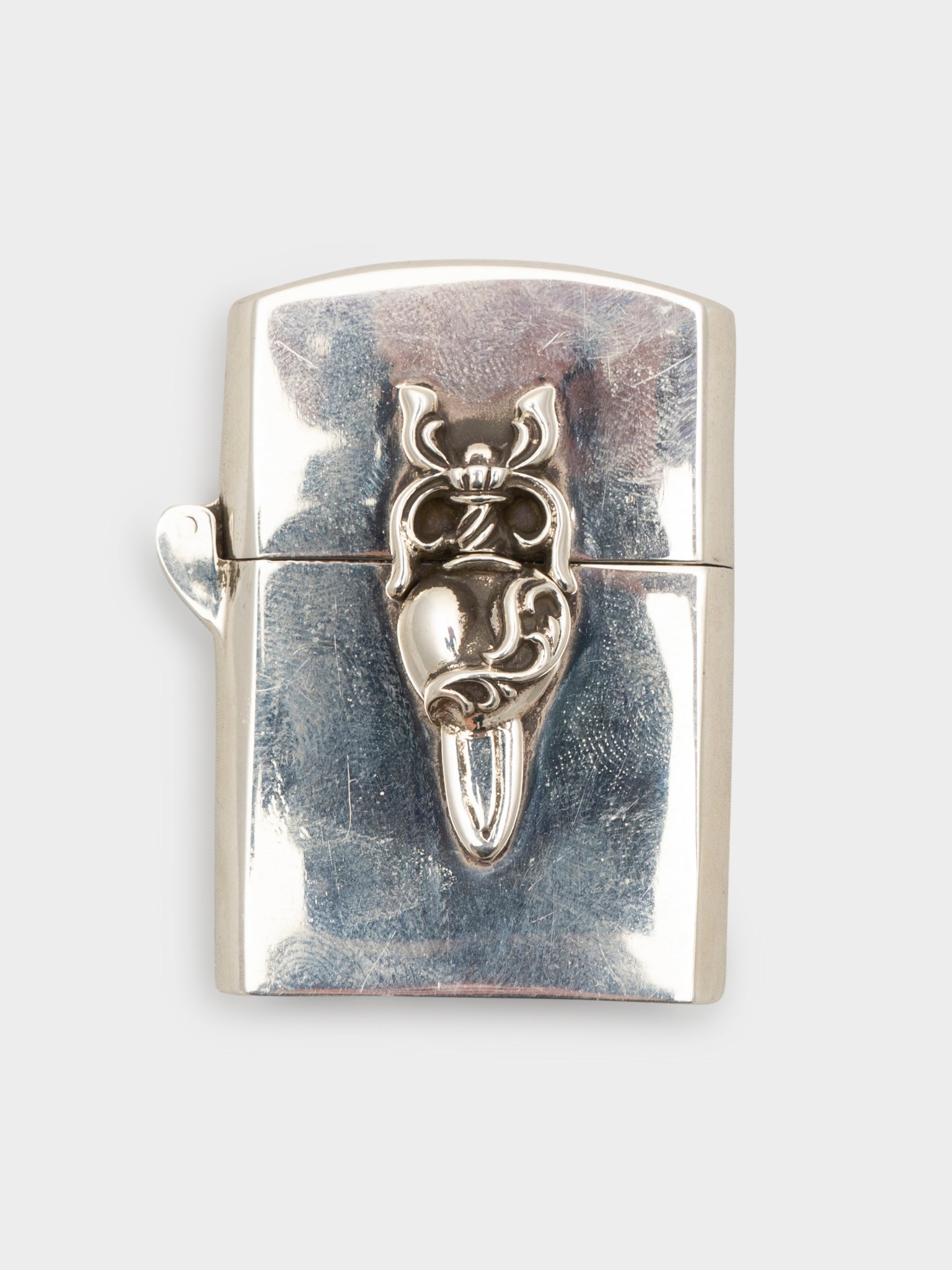 A sterling silver Chrome Hearts Zippo lighter with a large dagger and heart design on the front