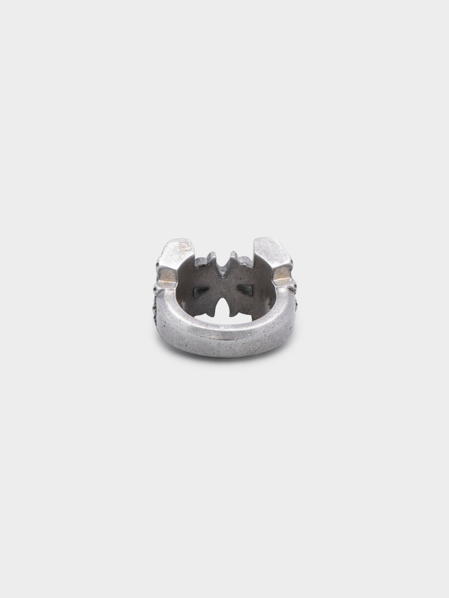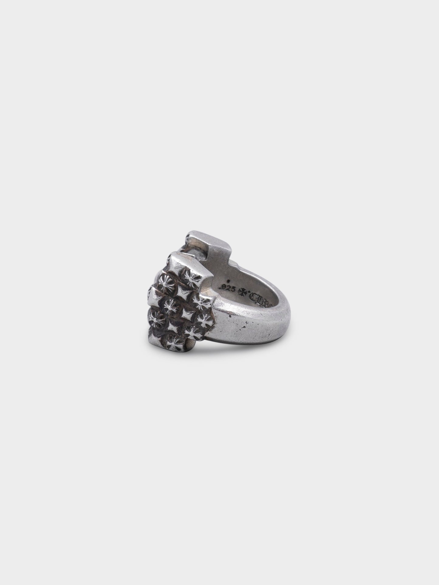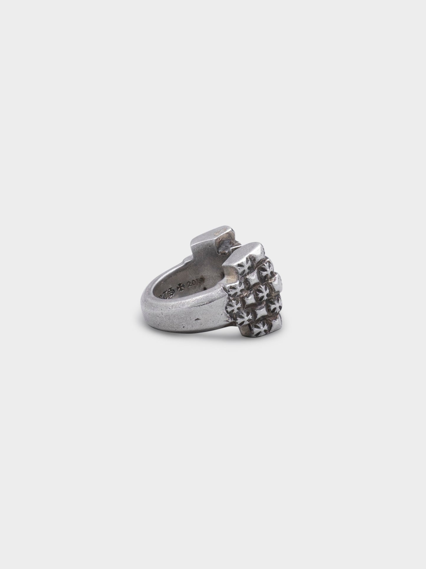A hefty sterling silver Chrome Hearts Deco Plus ring that features a lot of small crosses supporting one larger one in the center.