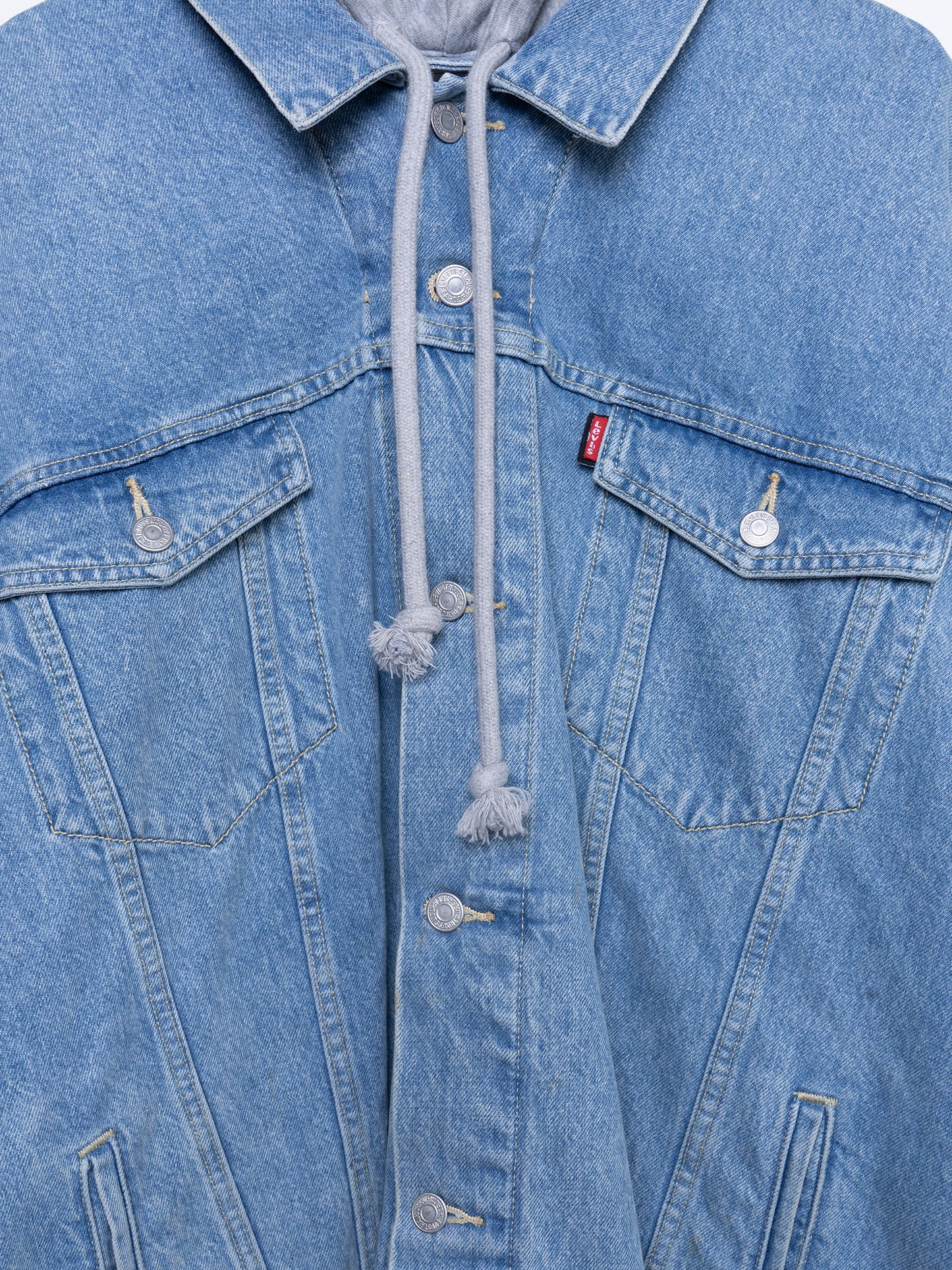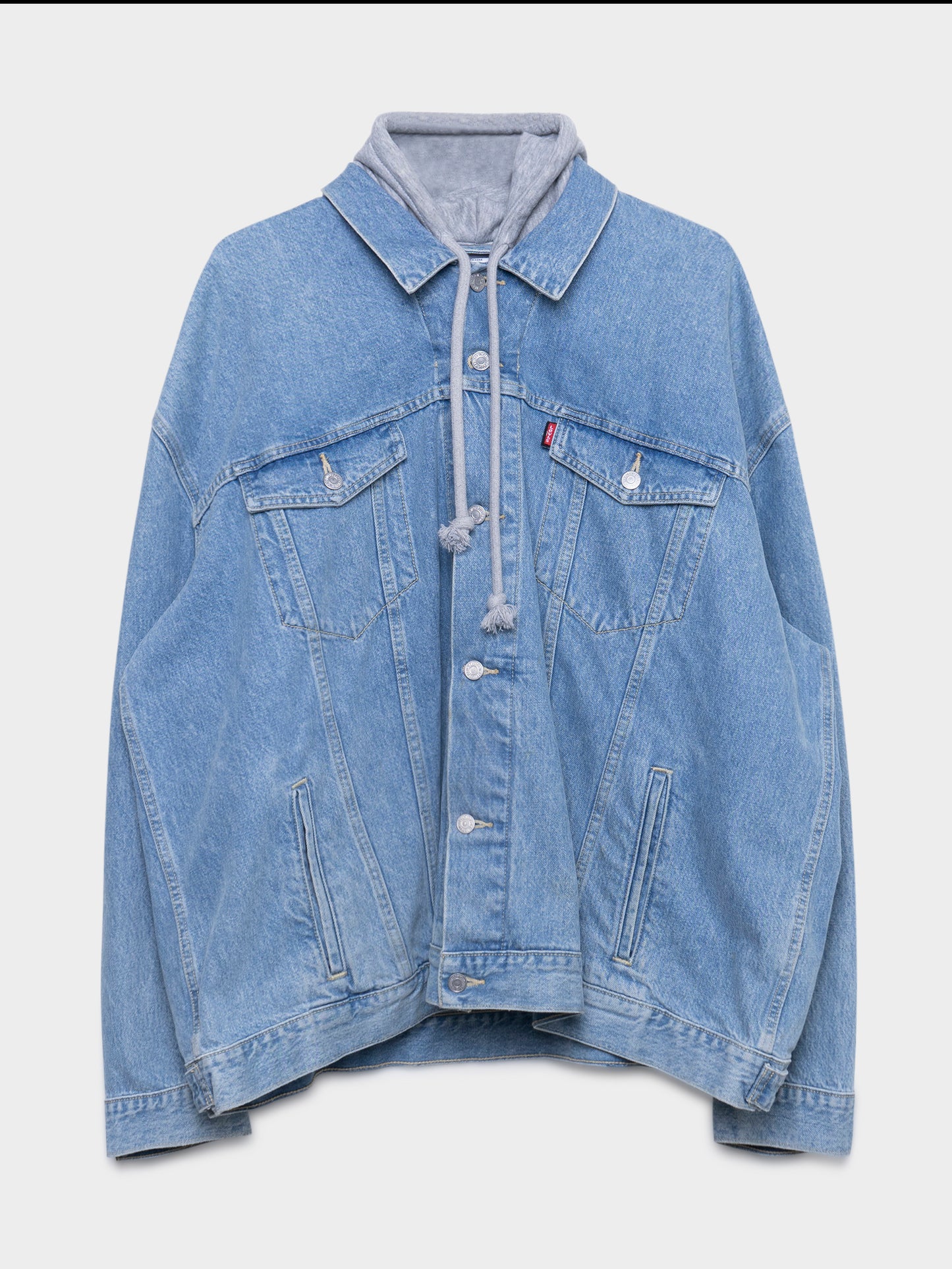 An oversized denim bomber from Vetements with a grey sweatshirt hood.