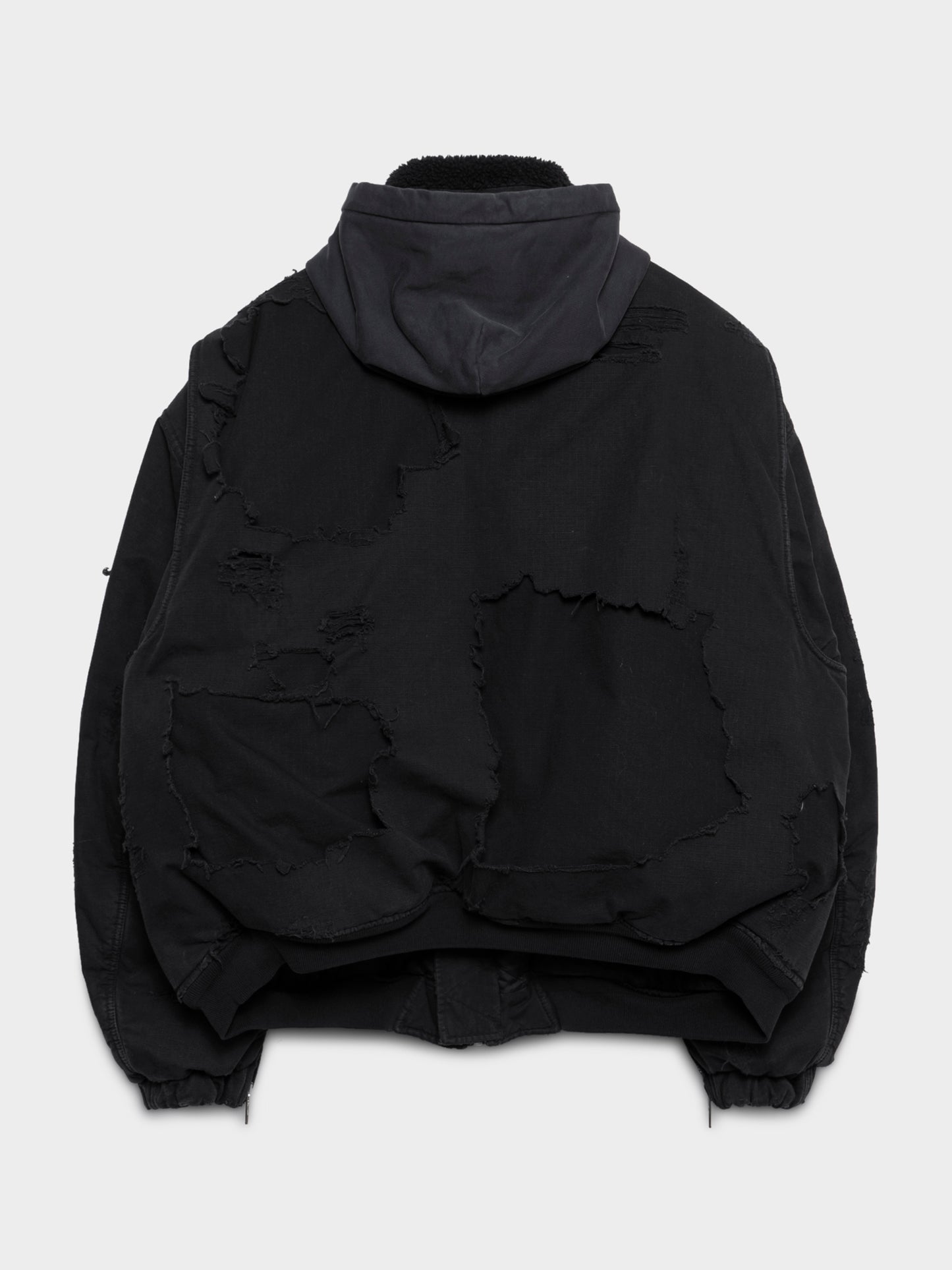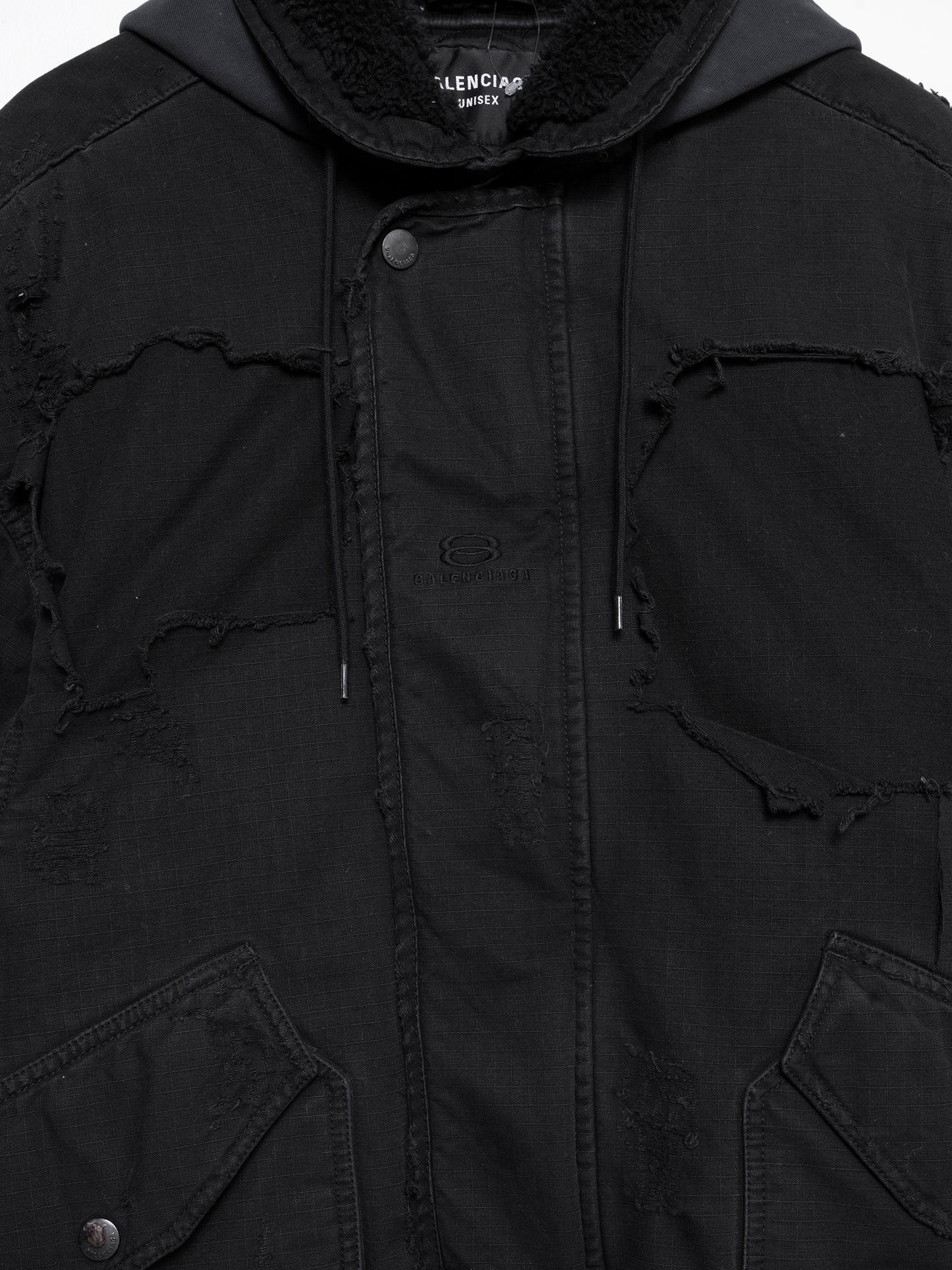 An oversized thick Balenciaga hooded bomber with destroyed detailing throughout, large cargo pockets, and a shearling collar.