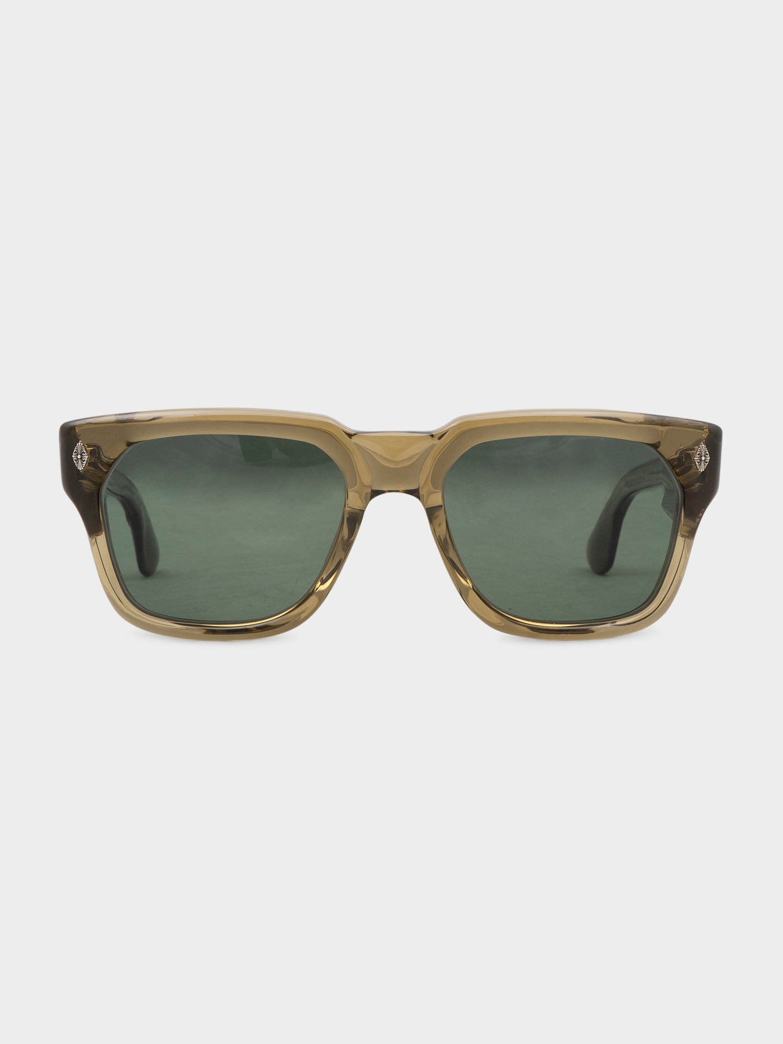 A pair of olive Chrome Hearts Sniffer sunglasses with fully iced out diamond temples.