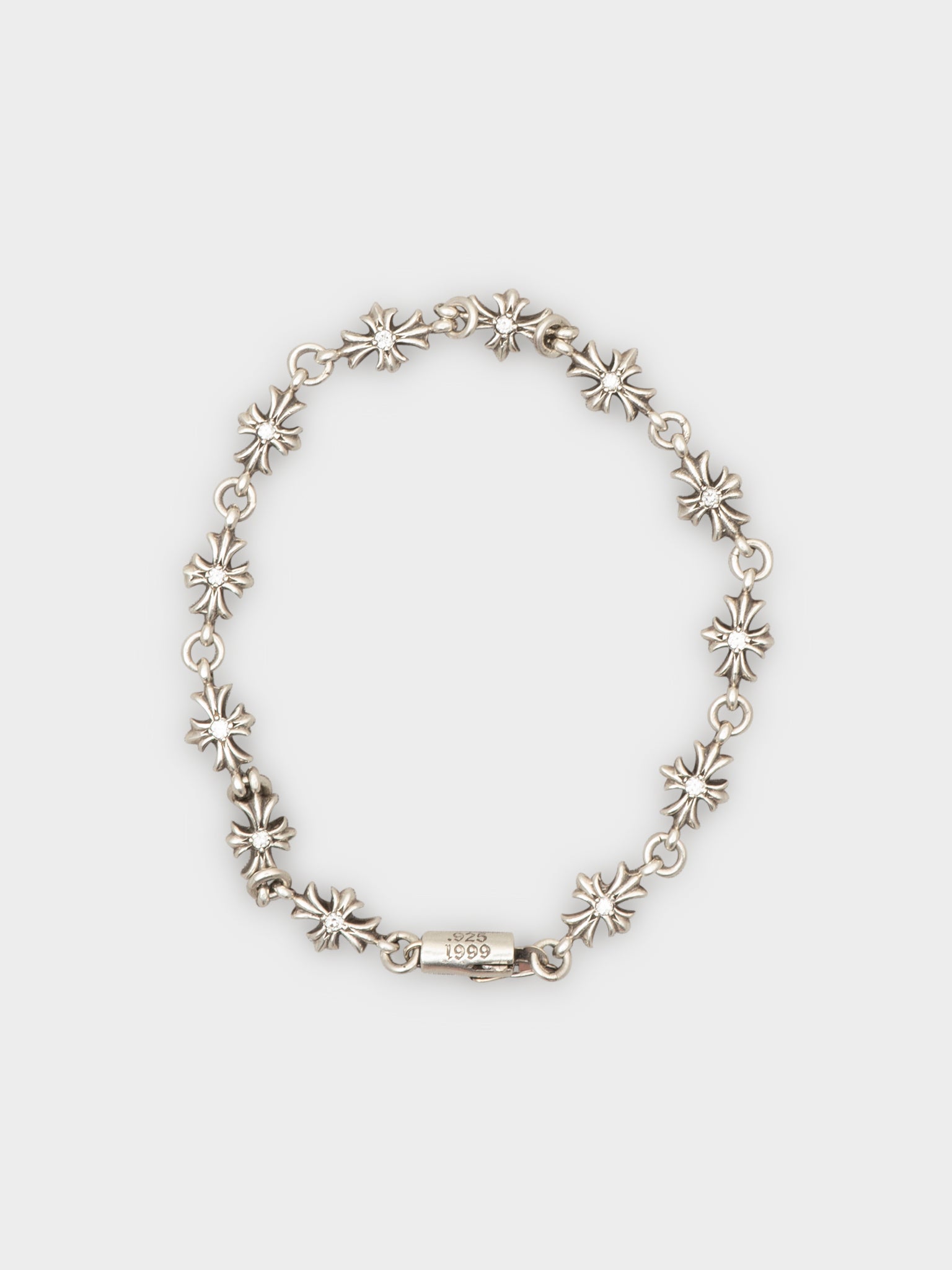 A sterling silver Chrome Hearts bracelet made up of Tiny E charms linked together, each with a singular diamond studded in the center