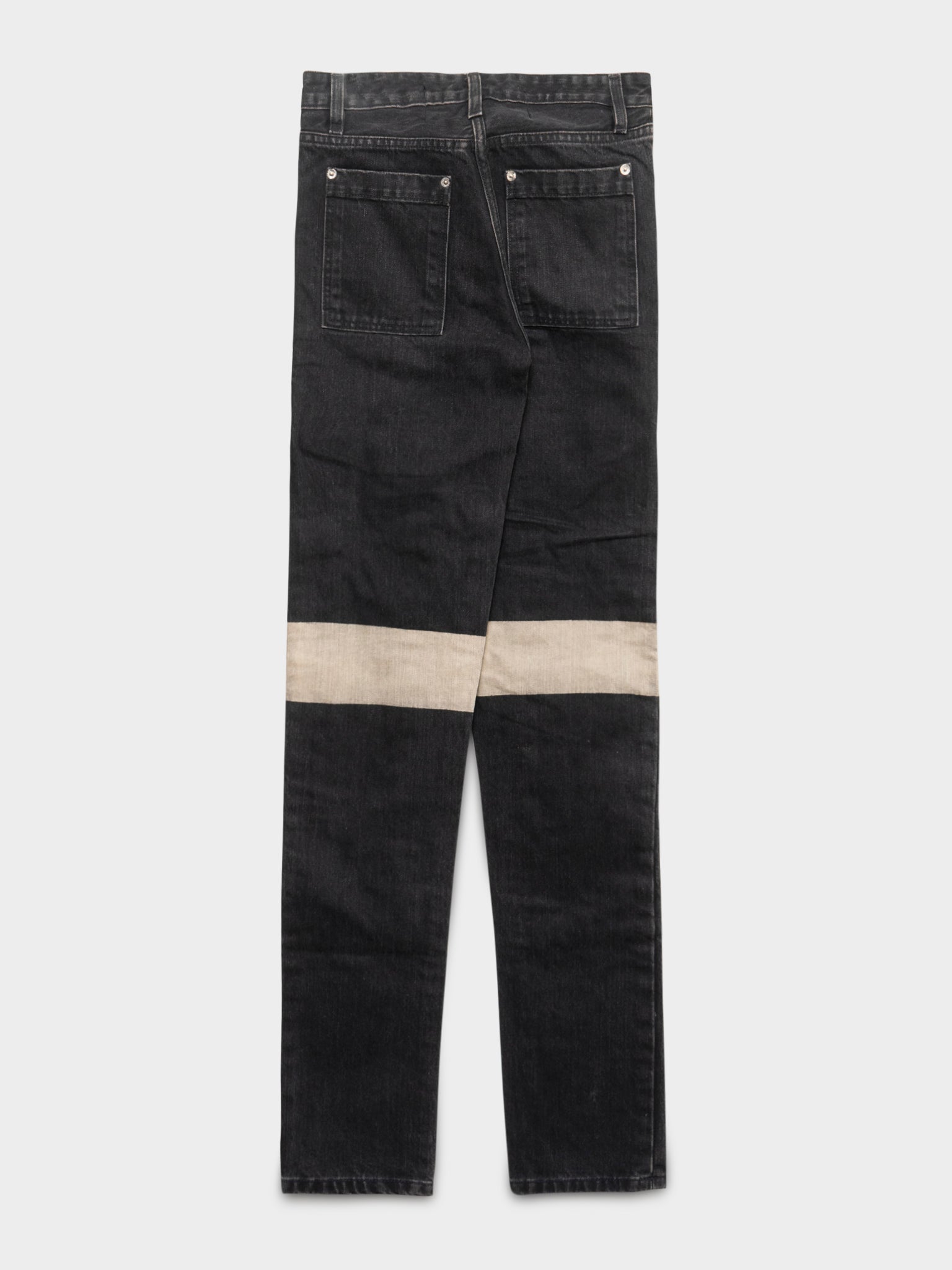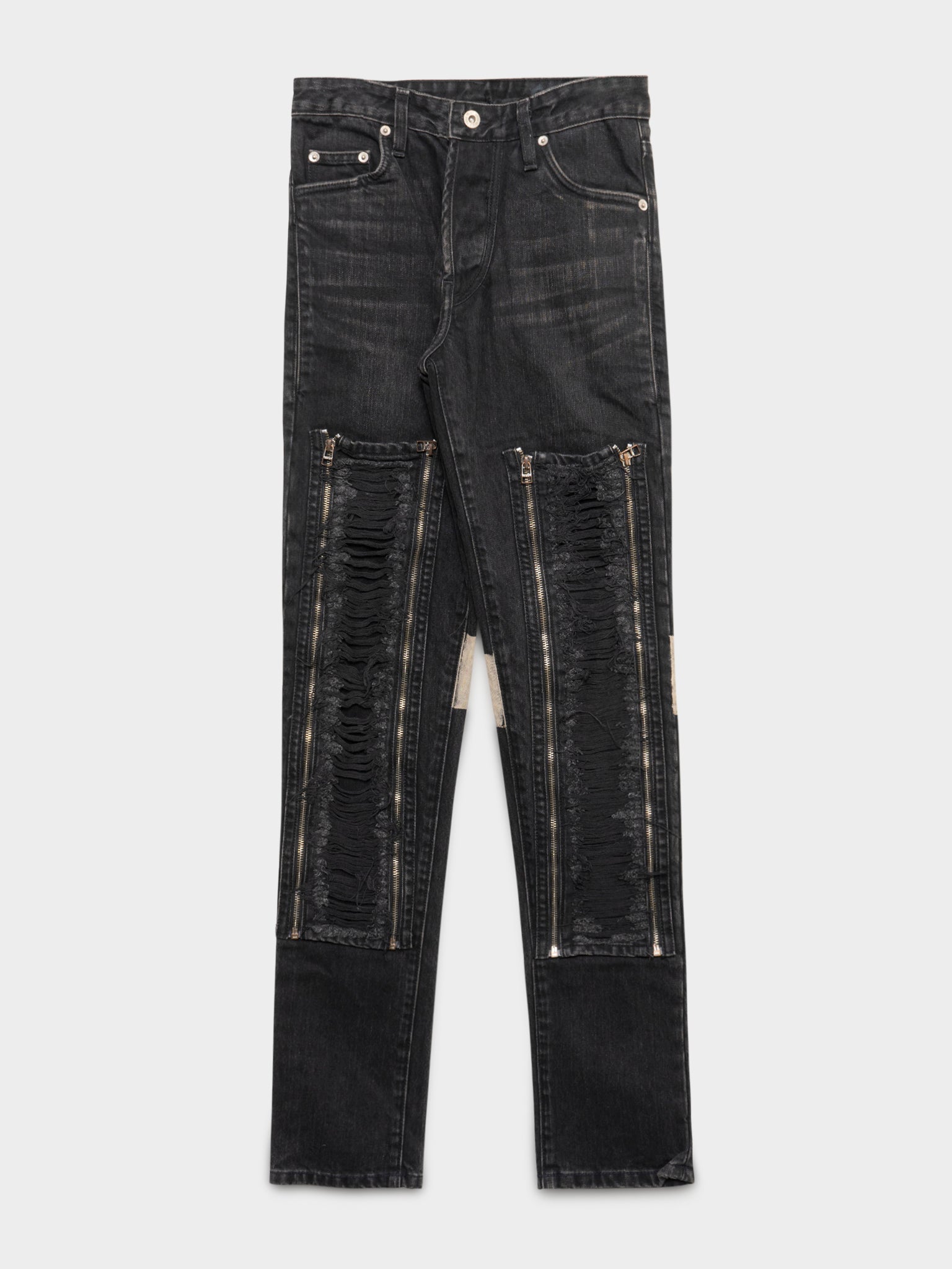 A pair of black distressed Hood by Air jeans with zippers down the knees holding on thrashed sections of the jeans.