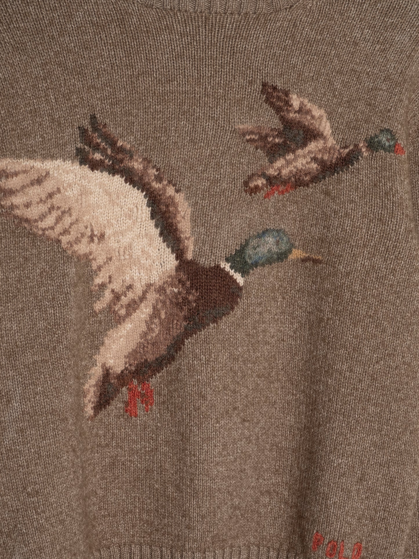A real piece of classic Americana from Ralph Lauren Polo that depicts a duck hunting scene on a soft sweater